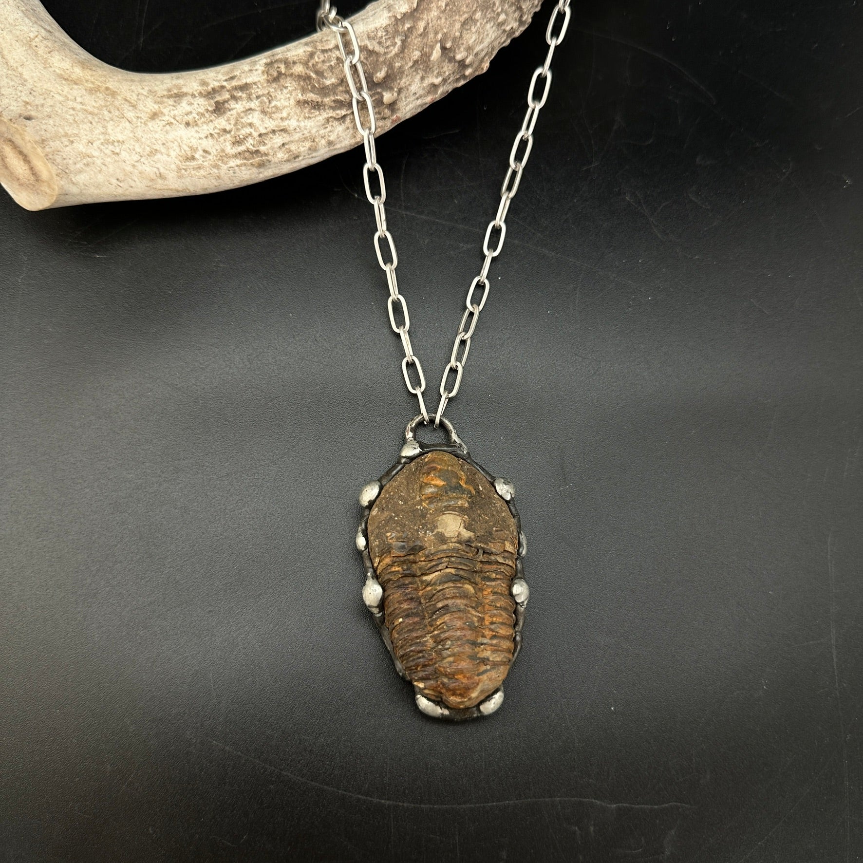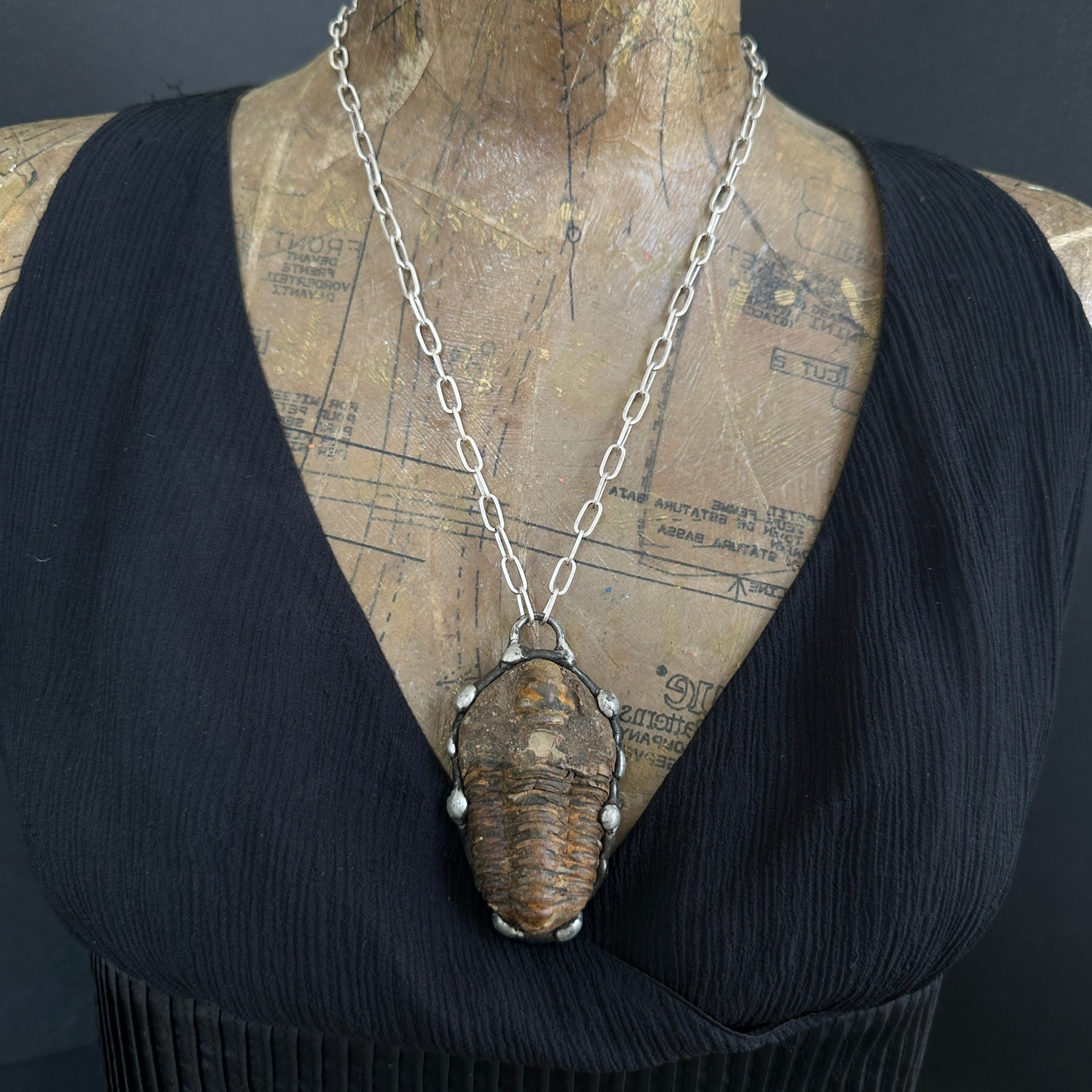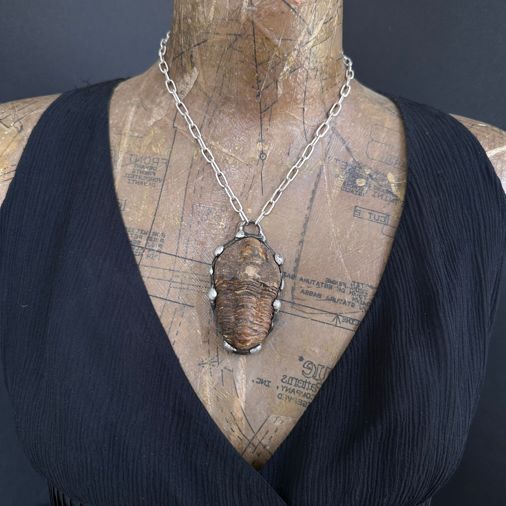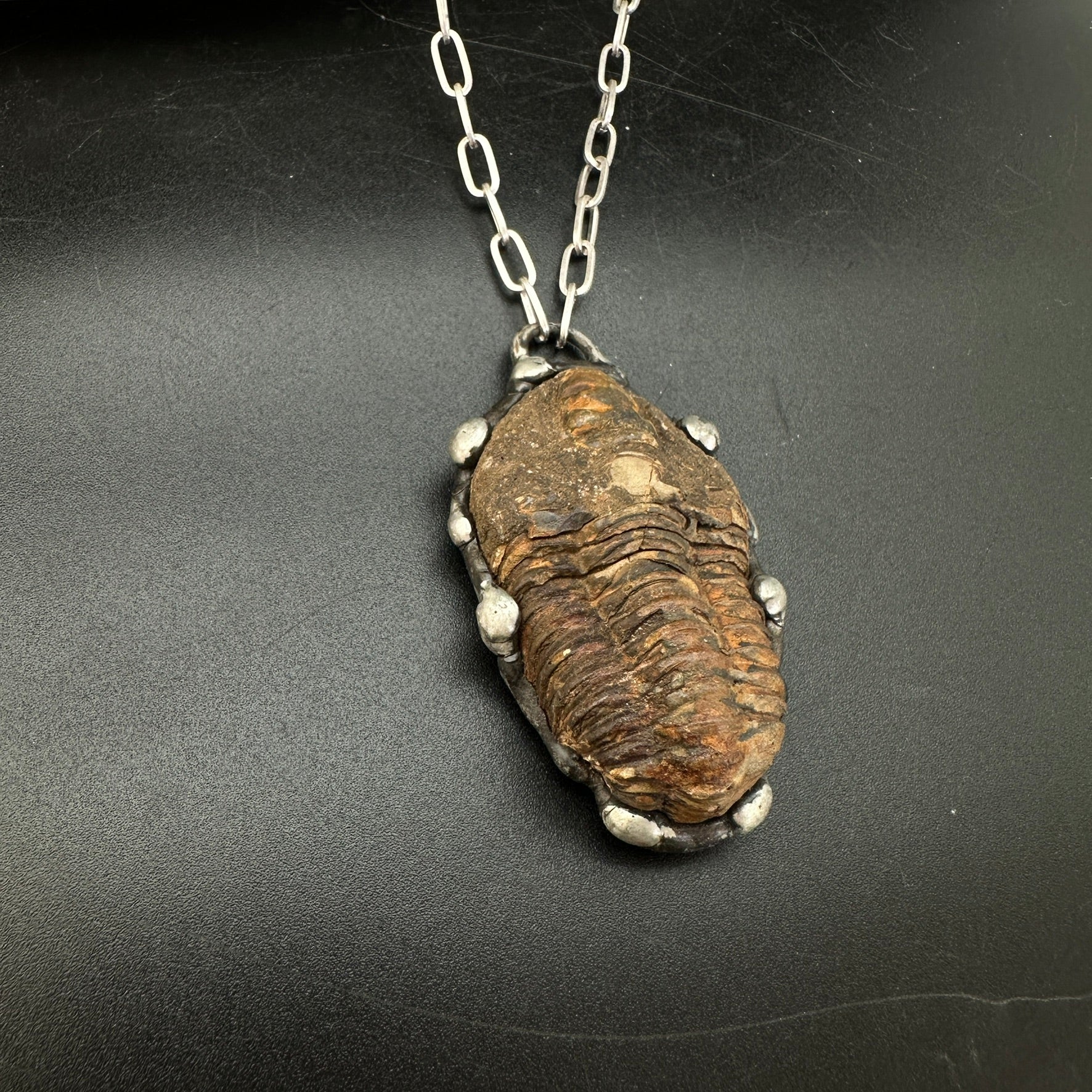 Showcasing a remarkable Moroccan trilobite fossil, this pendant connects you to the ancient world with its fascinating textures and natural form. Framed in my signature style, this piece is perfect for fossil enthusiasts and history lovers, bringing a touch of earthy mystique to any outfit. A timeless treasure from another era. Choose your chain length.