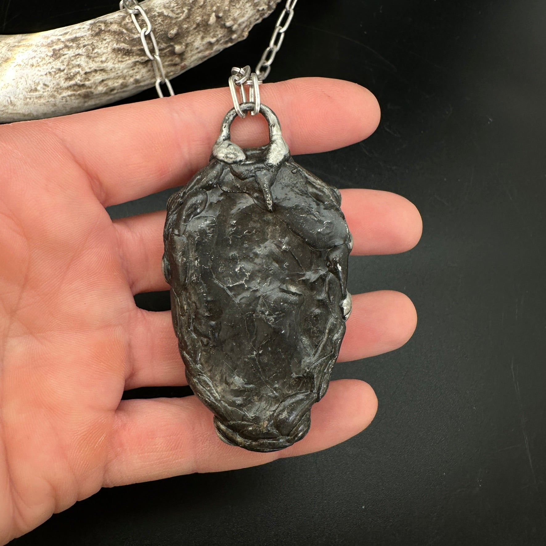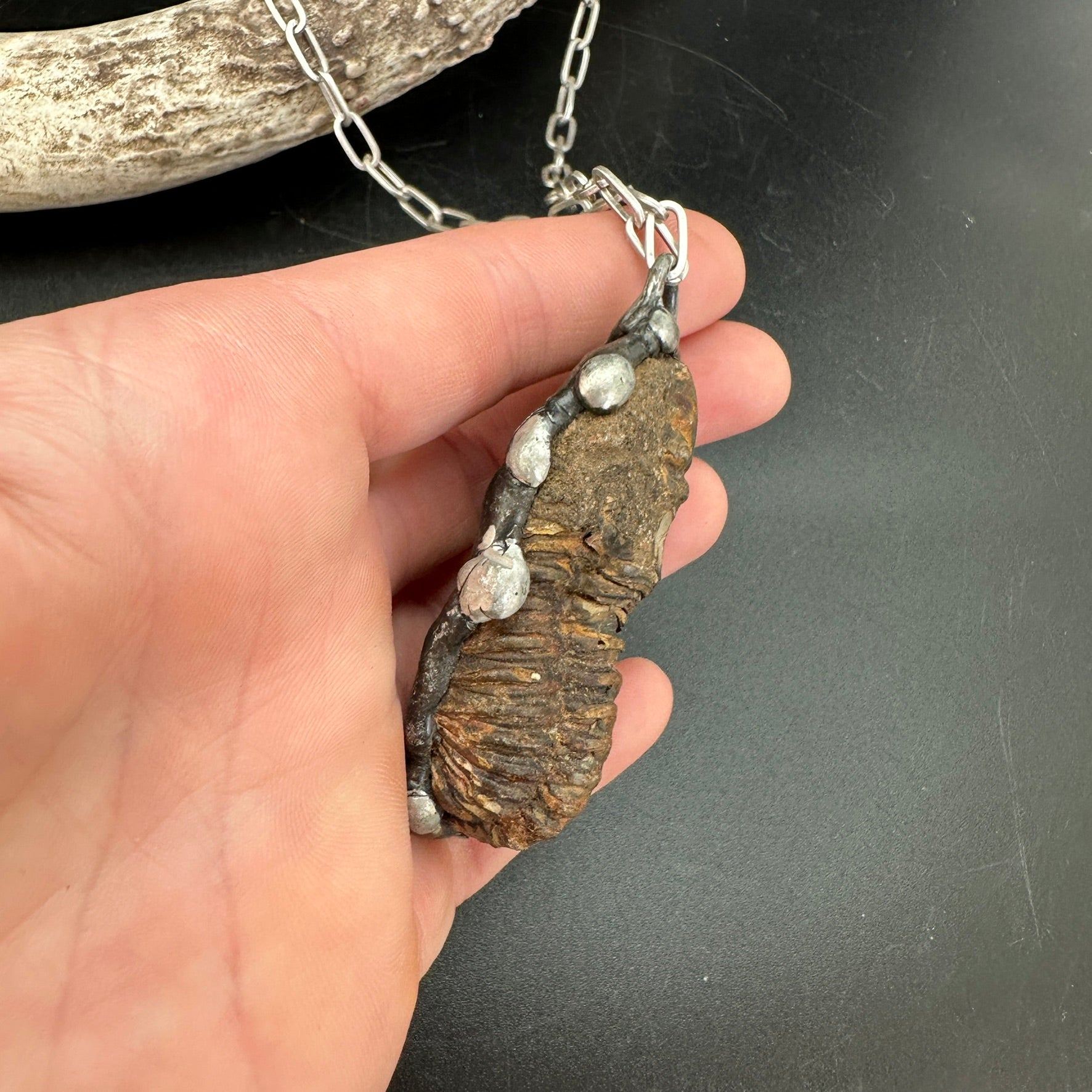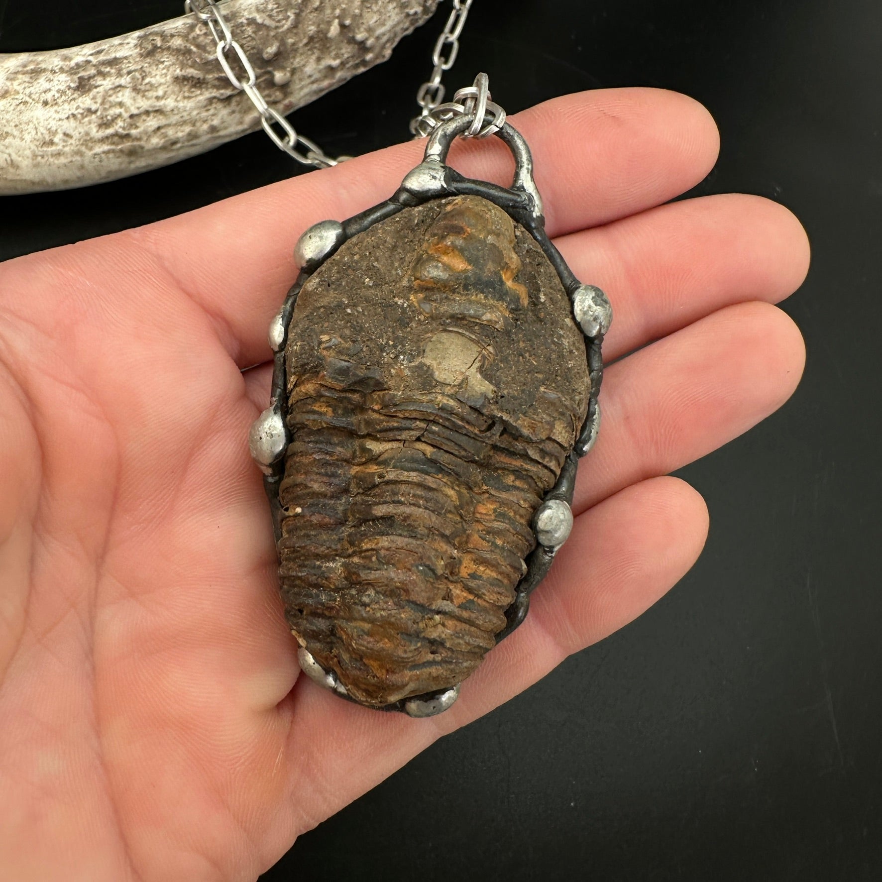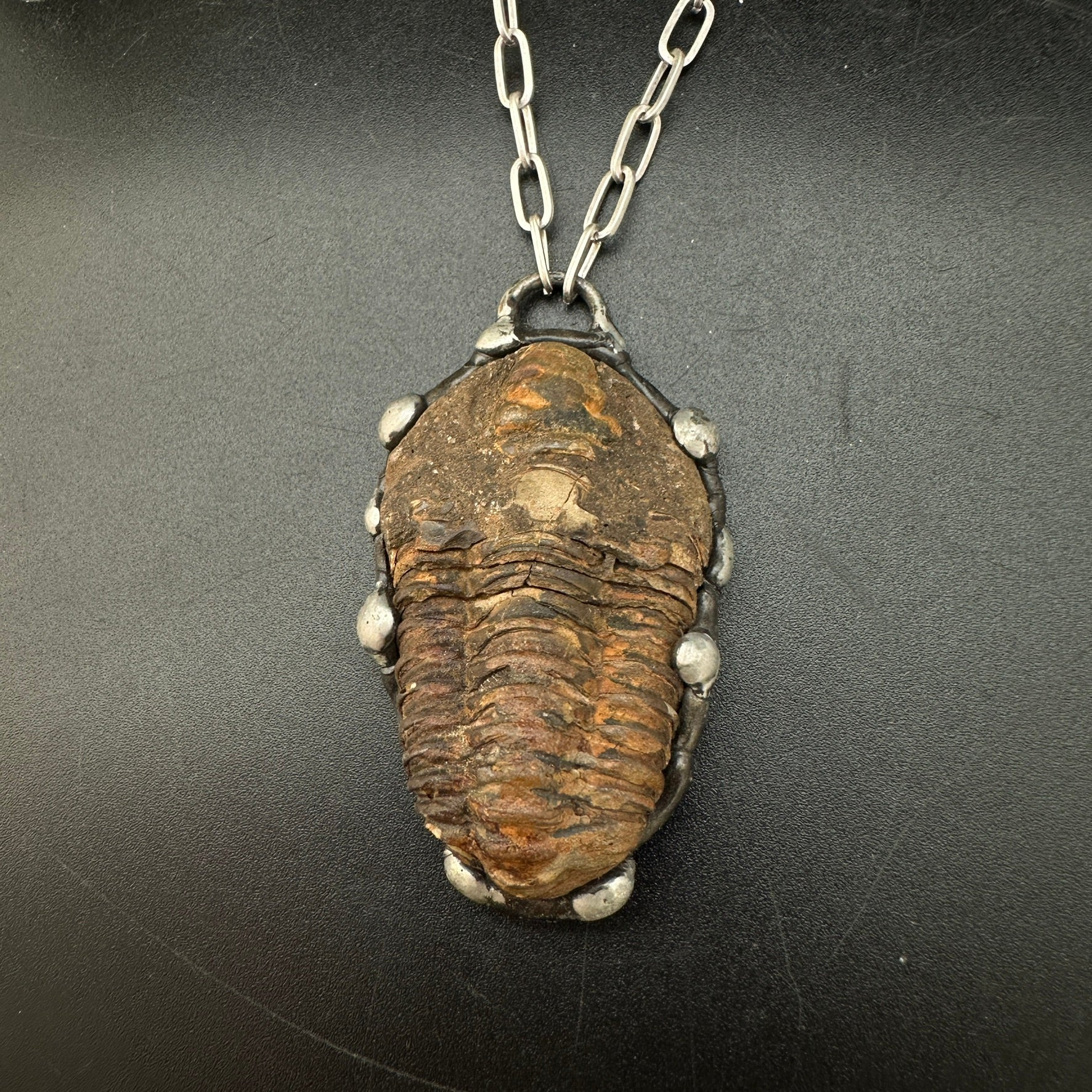 Showcasing a remarkable Moroccan trilobite fossil, this pendant connects you to the ancient world with its fascinating textures and natural form. Framed in my signature style, this piece is perfect for fossil enthusiasts and history lovers, bringing a touch of earthy mystique to any outfit. A timeless treasure from another era. Choose your chain length.