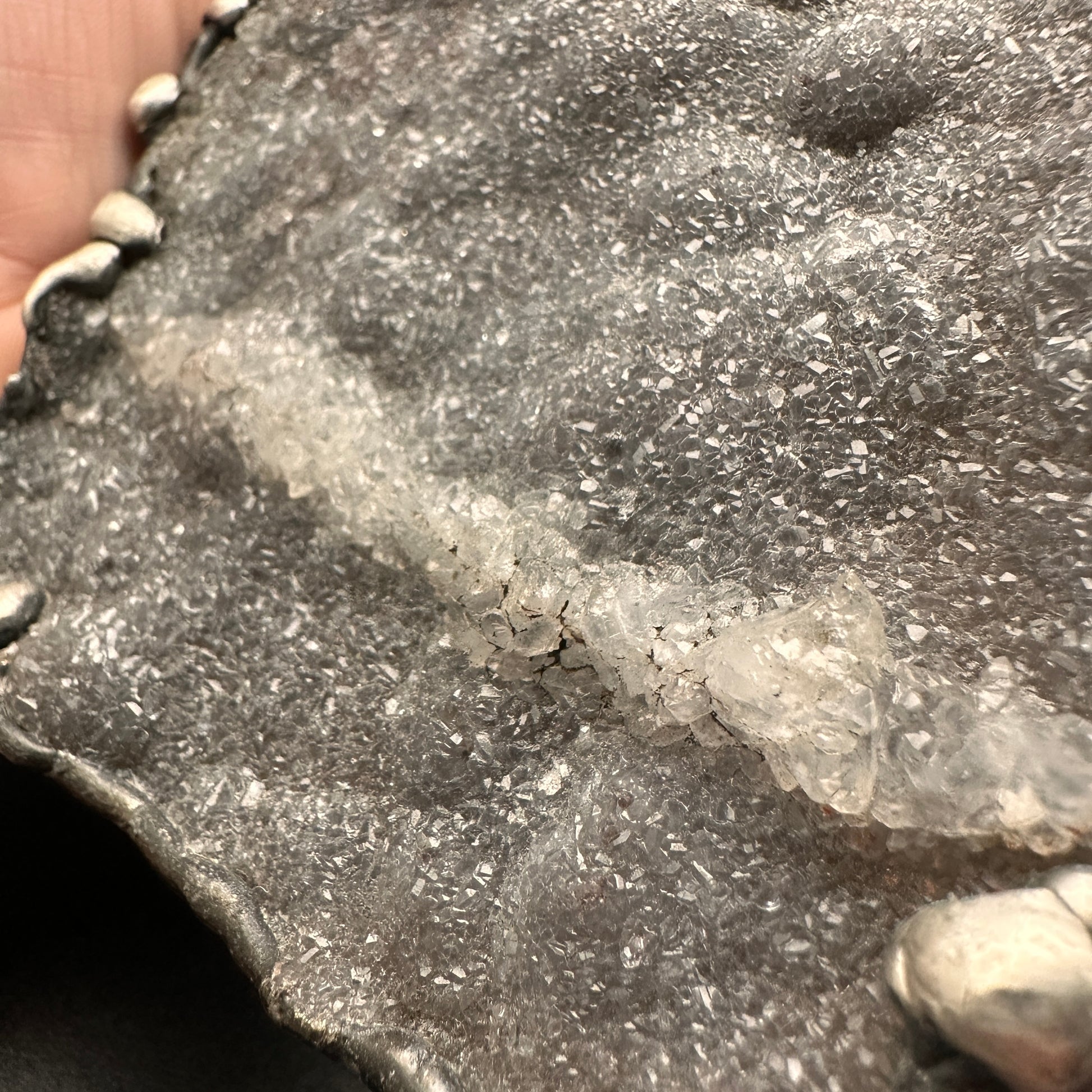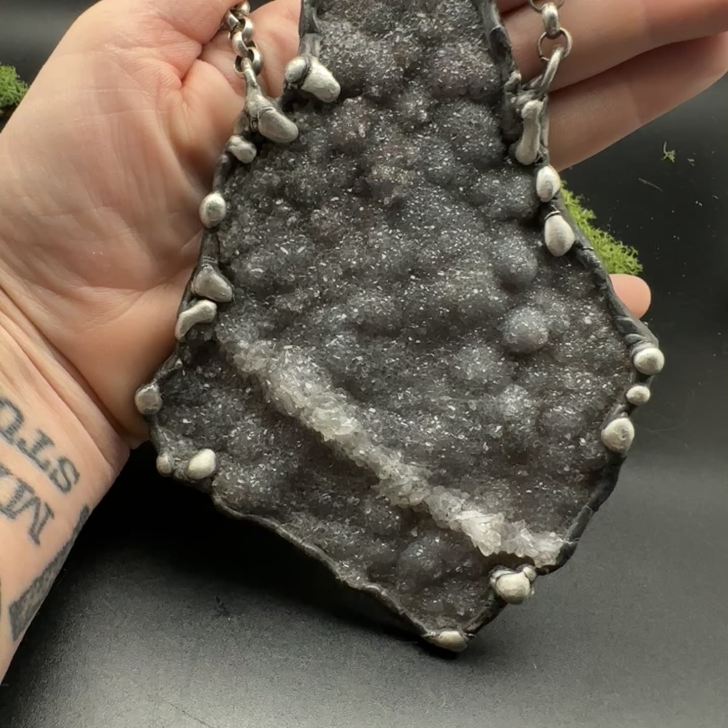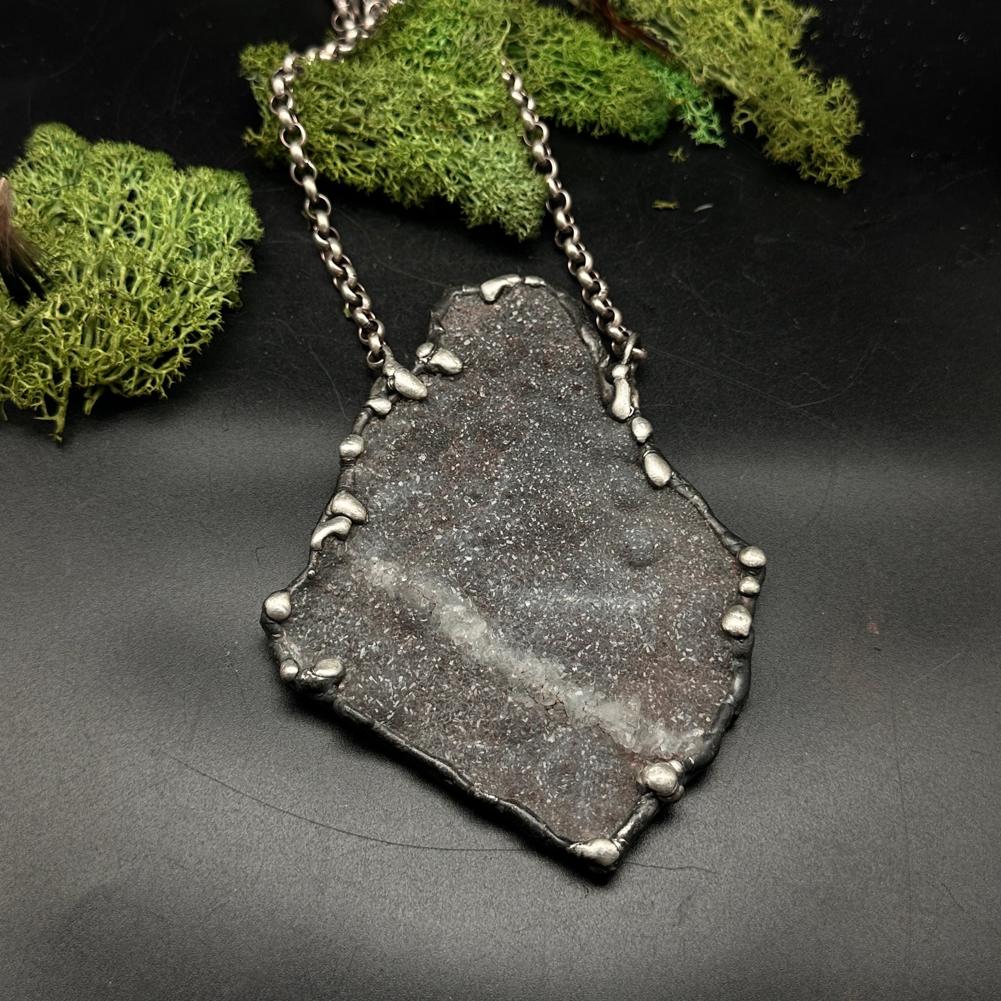 A super thin but massive flower amethyst specimen takes center stage in this one-of-a-kind necklace. Encased in solder, the amethyst’s soft purple tones and natural crystal formations bring a touch of mystery and elegance to any look. Heavy gauge antiqued silver plate chain. This piece is really lightweight relative to the size, the stone is less than 1/4" thick.