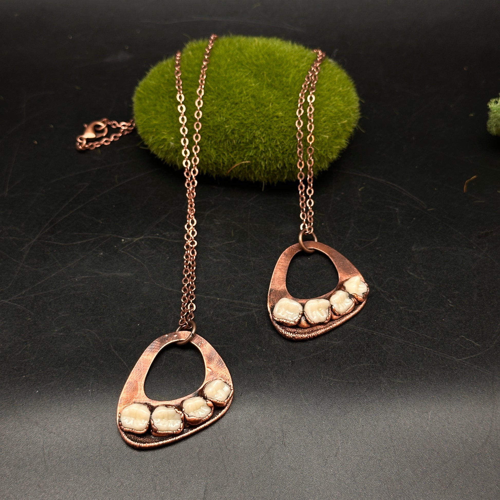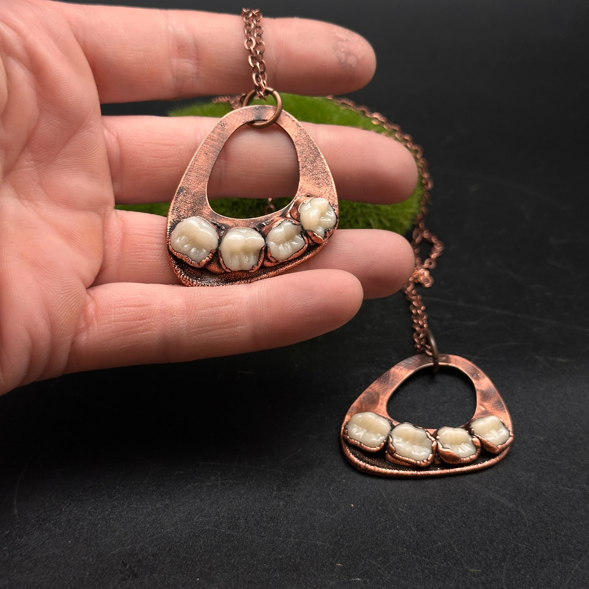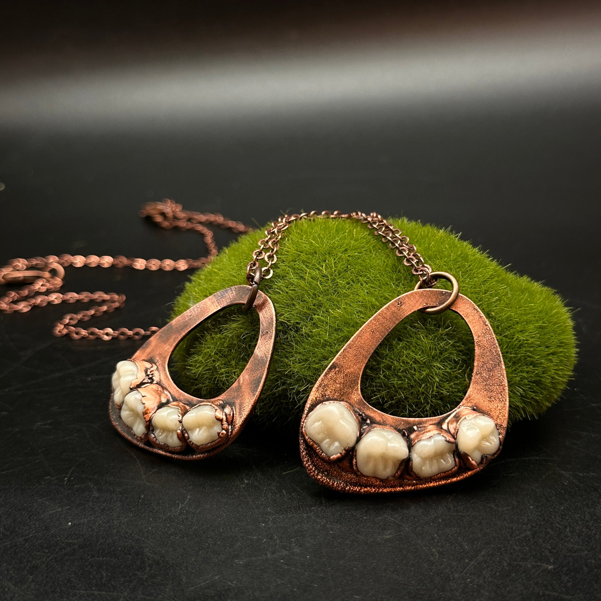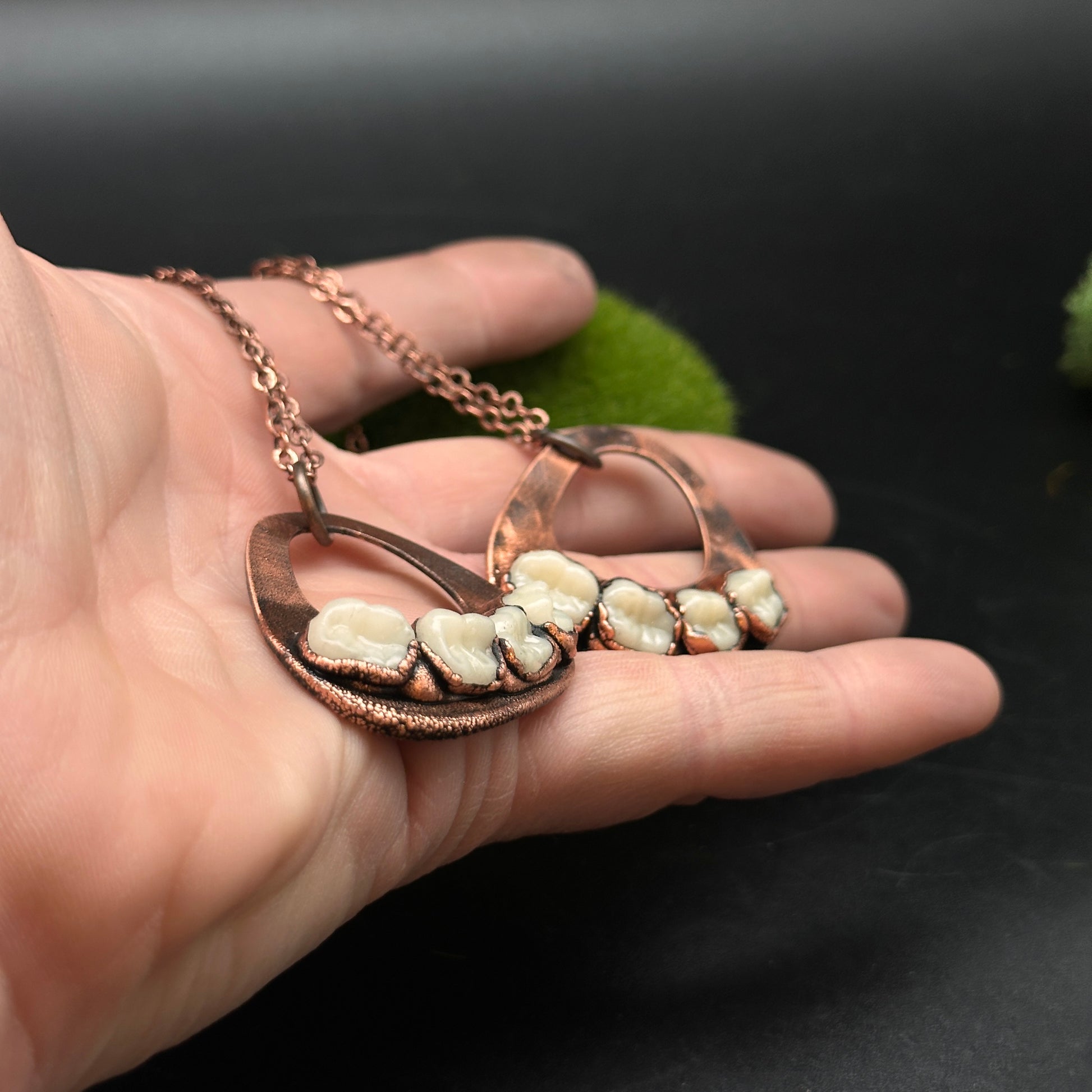Oblong copper encased teeth, electroformed, oxidized, and polished. Delicate but sturdy copper chain. Chain length 18-20". Each pendant will vary slightly. Pictured here are a few examples. *made with resin denture/partial teeth