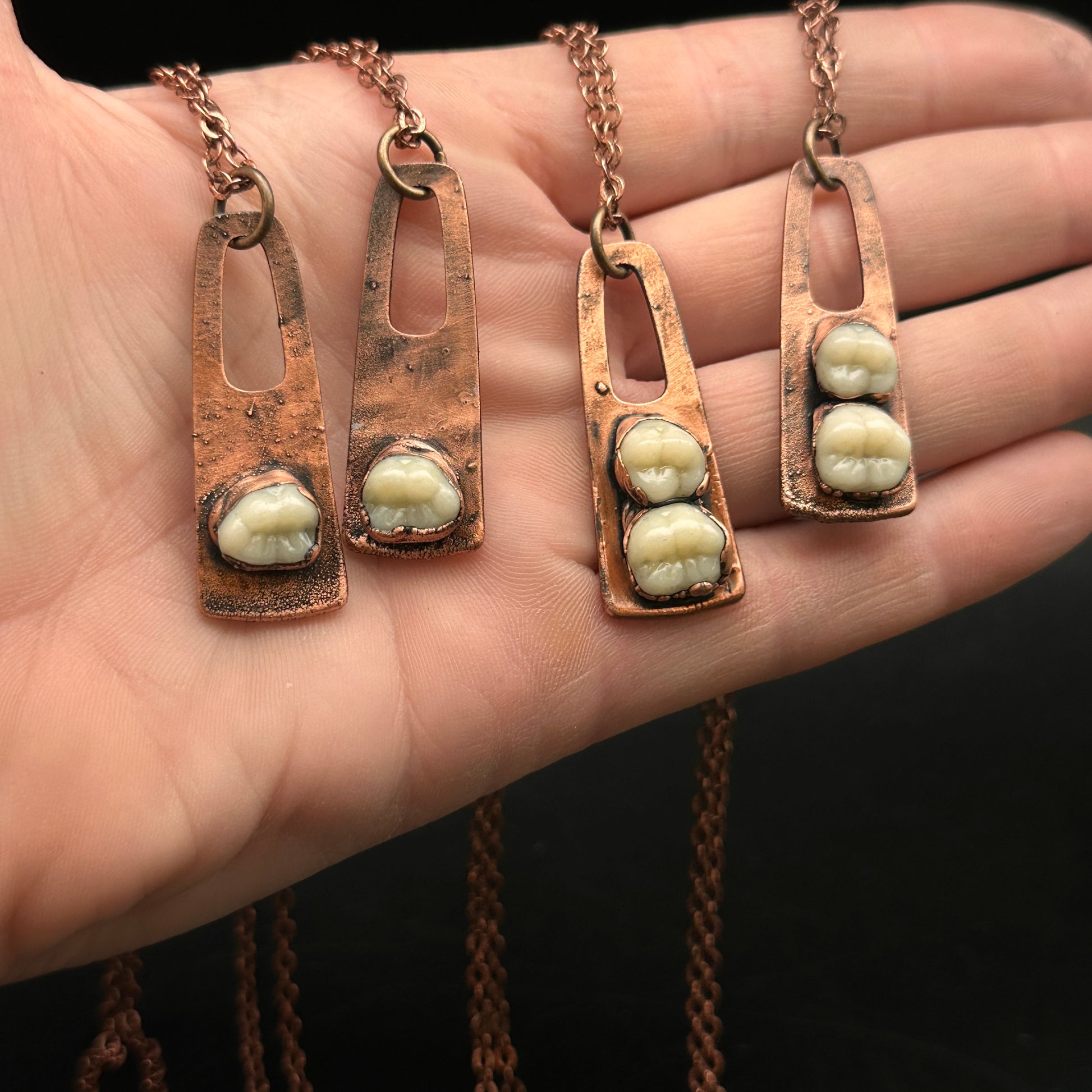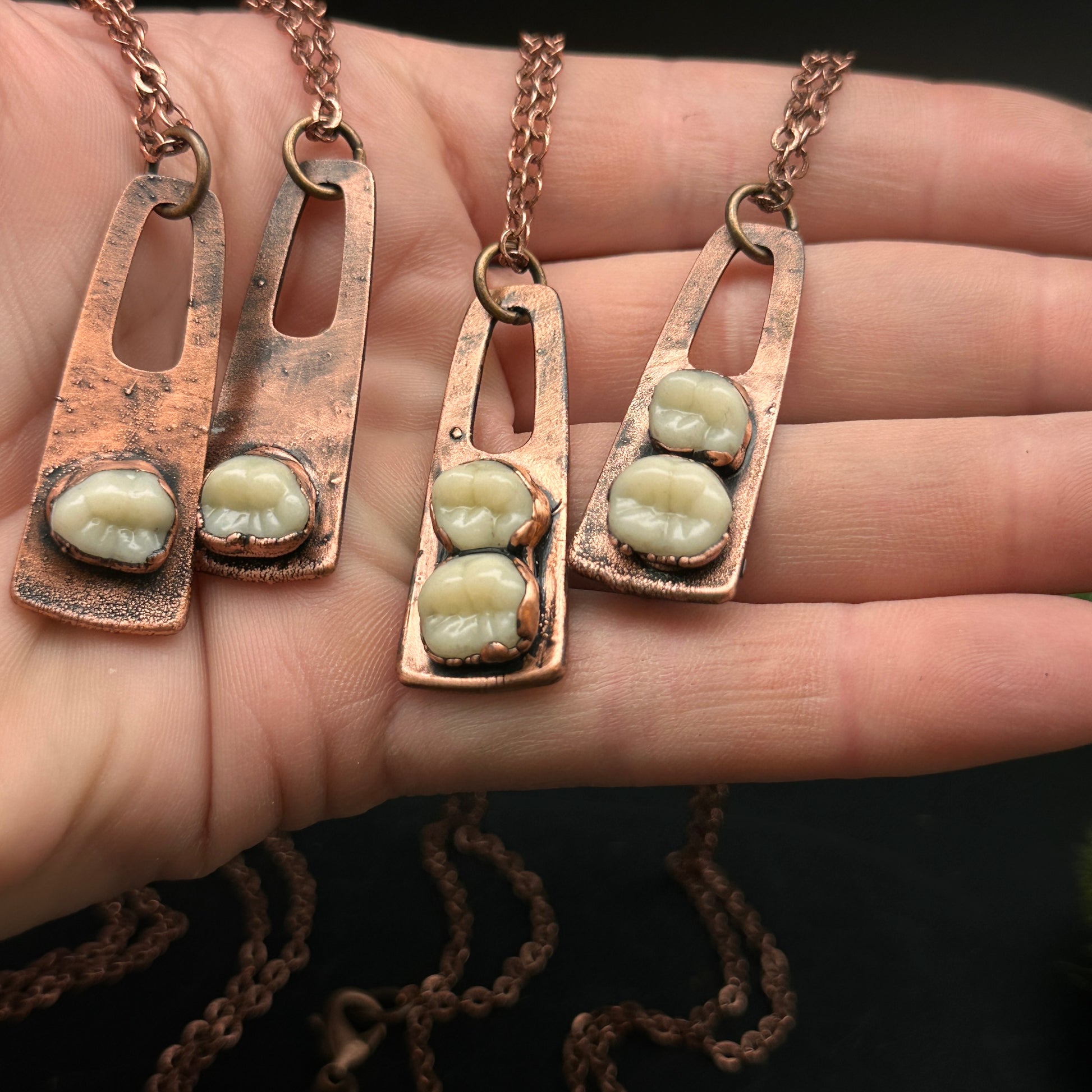 Elongated copper encased teeth, electroformed, oxidized, and polished. Delicate but sturdy copper chain. Chain length 18-20". Each pendant will vary slightly. Pictured here are a few examples. *made with resin denture/partial teeth