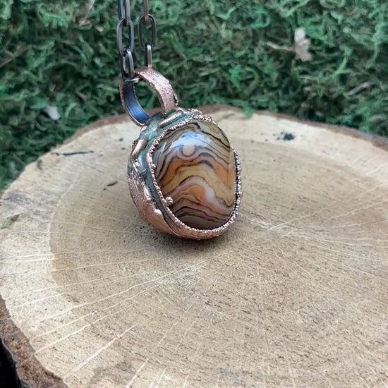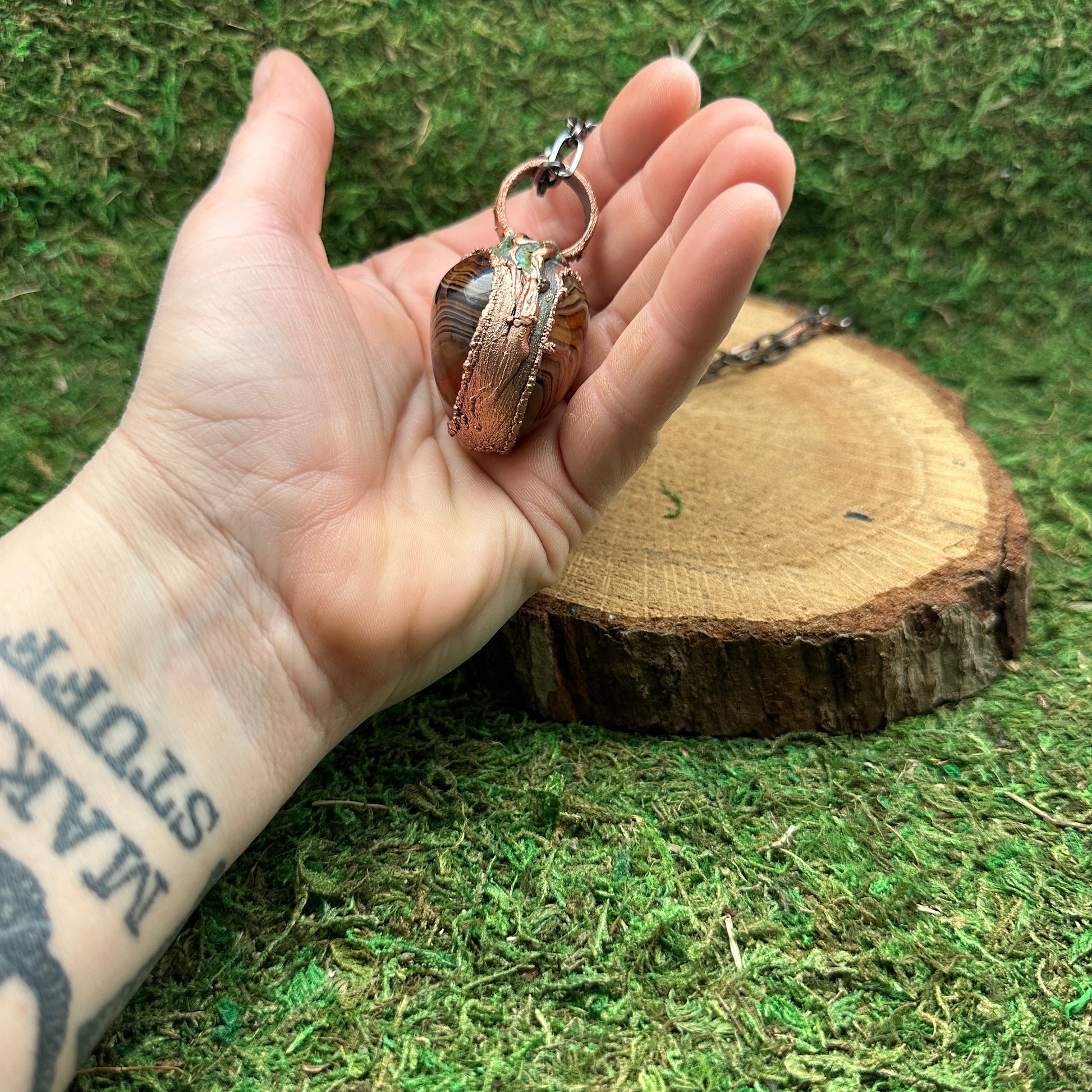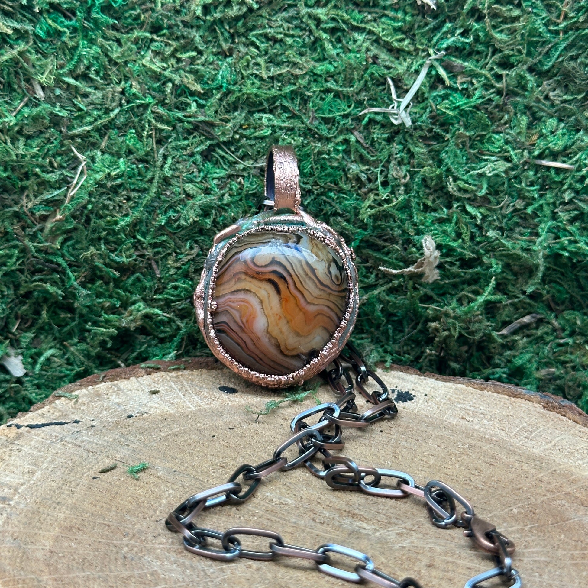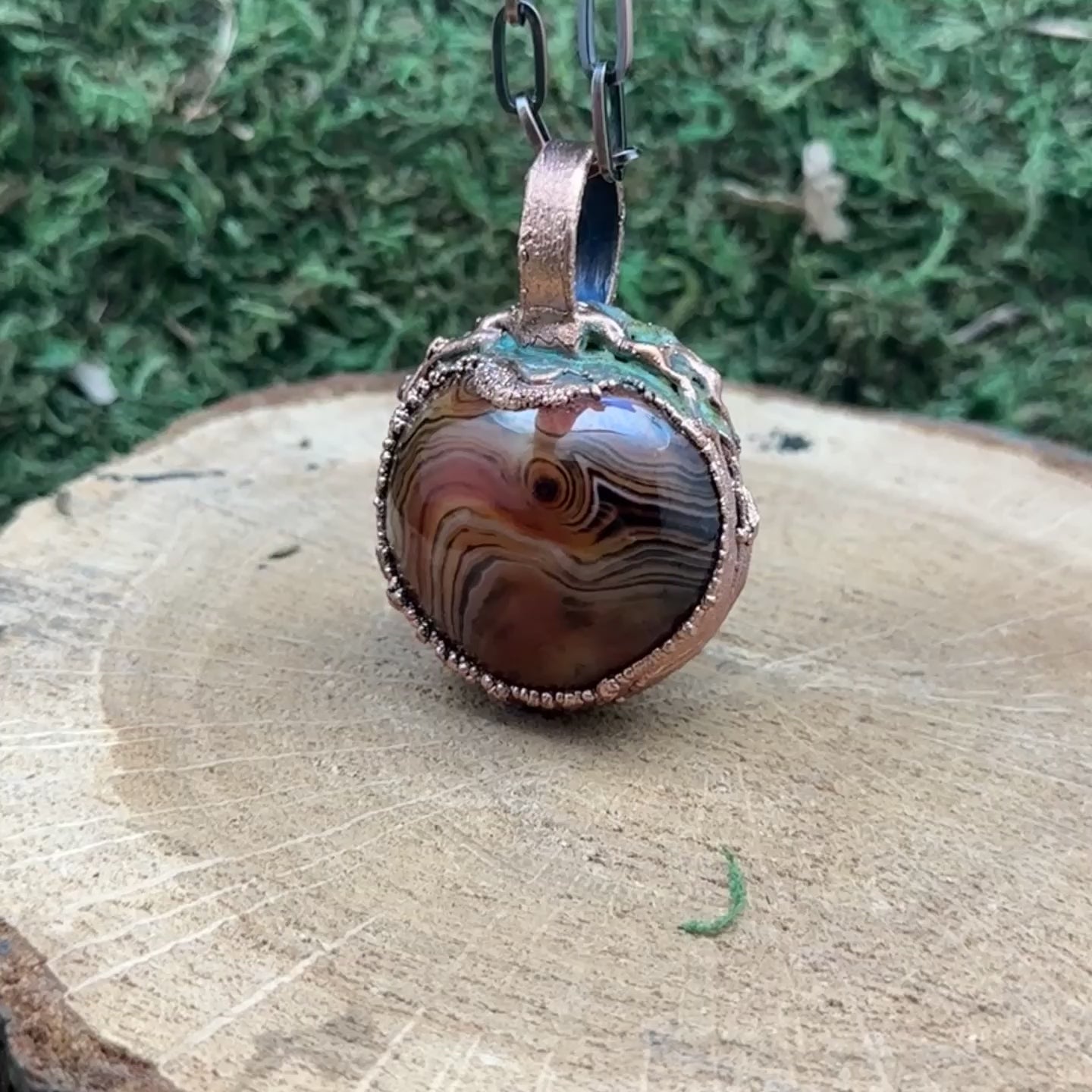 Sardonyx set in textured electroformed copper and verdigris patina. This stone has incredible varied patterns and color swirls. It's wild. Check the photos for both sides of the stones. Wear either way for two different looks. This is one of the smaller pendants available and it's a nice round marble shape.