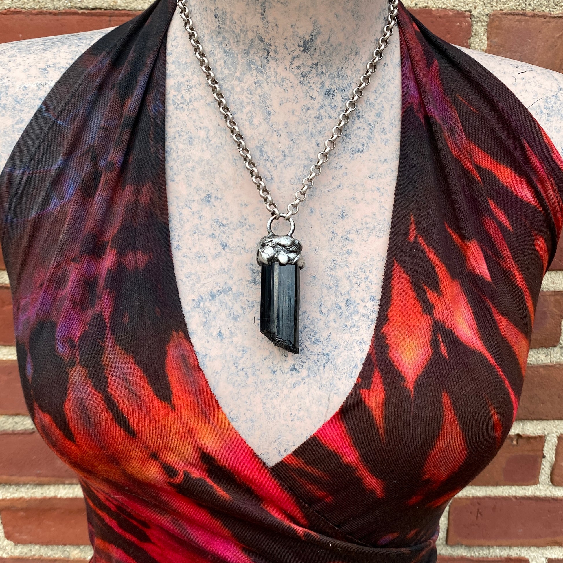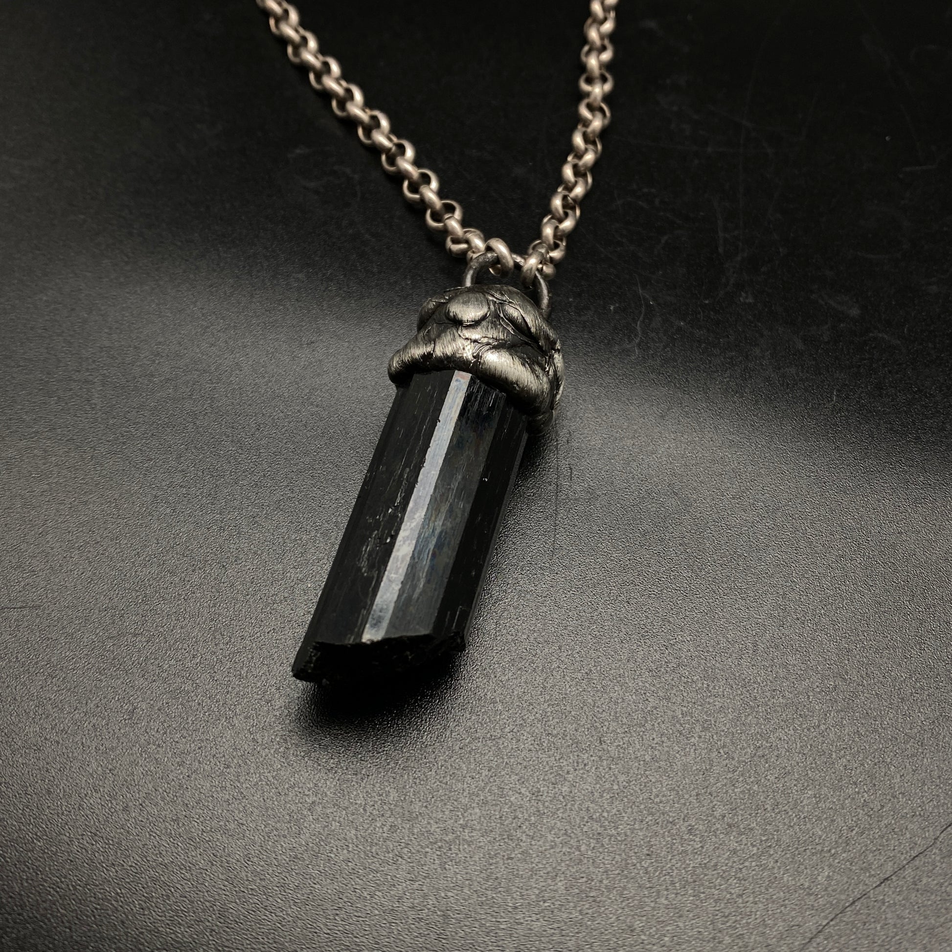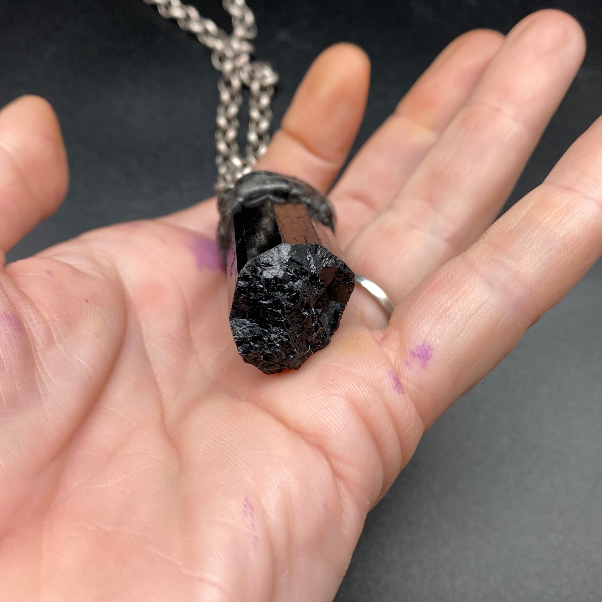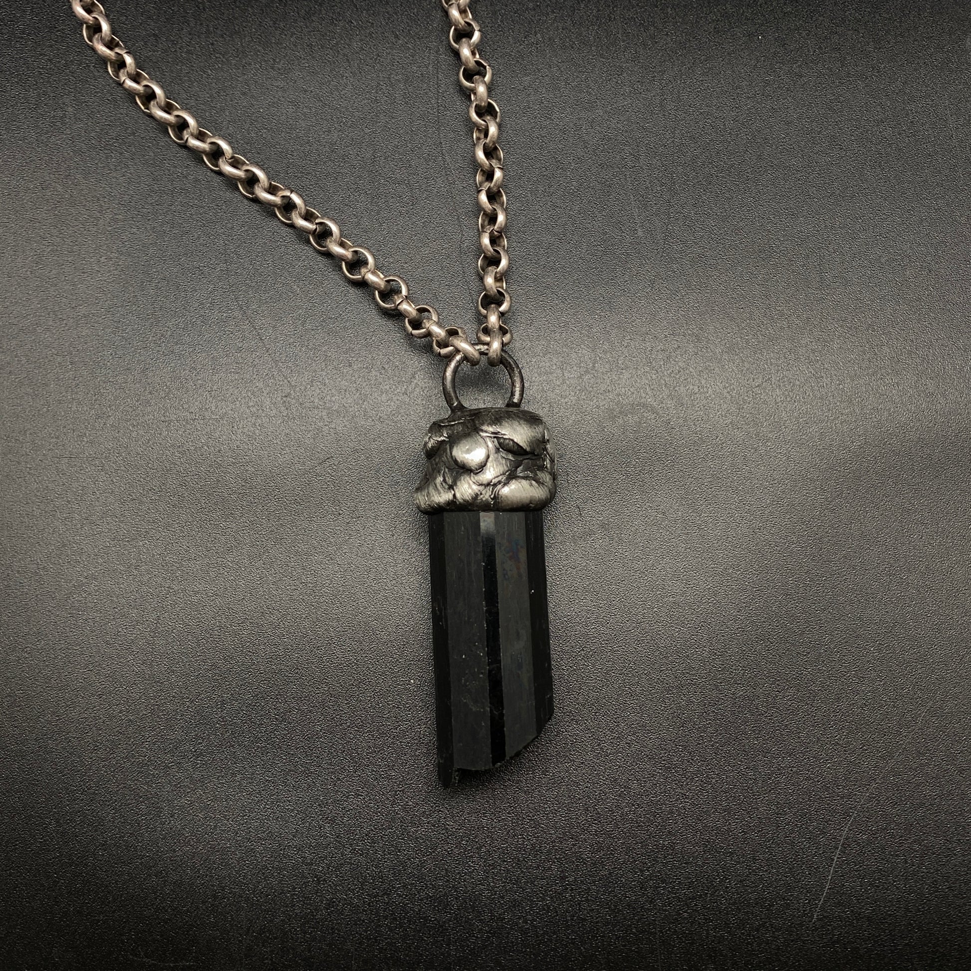 A beautiful solid black tourmaline spear. Soldered and oxidized with my signature technique. On silver plated rolo chain.