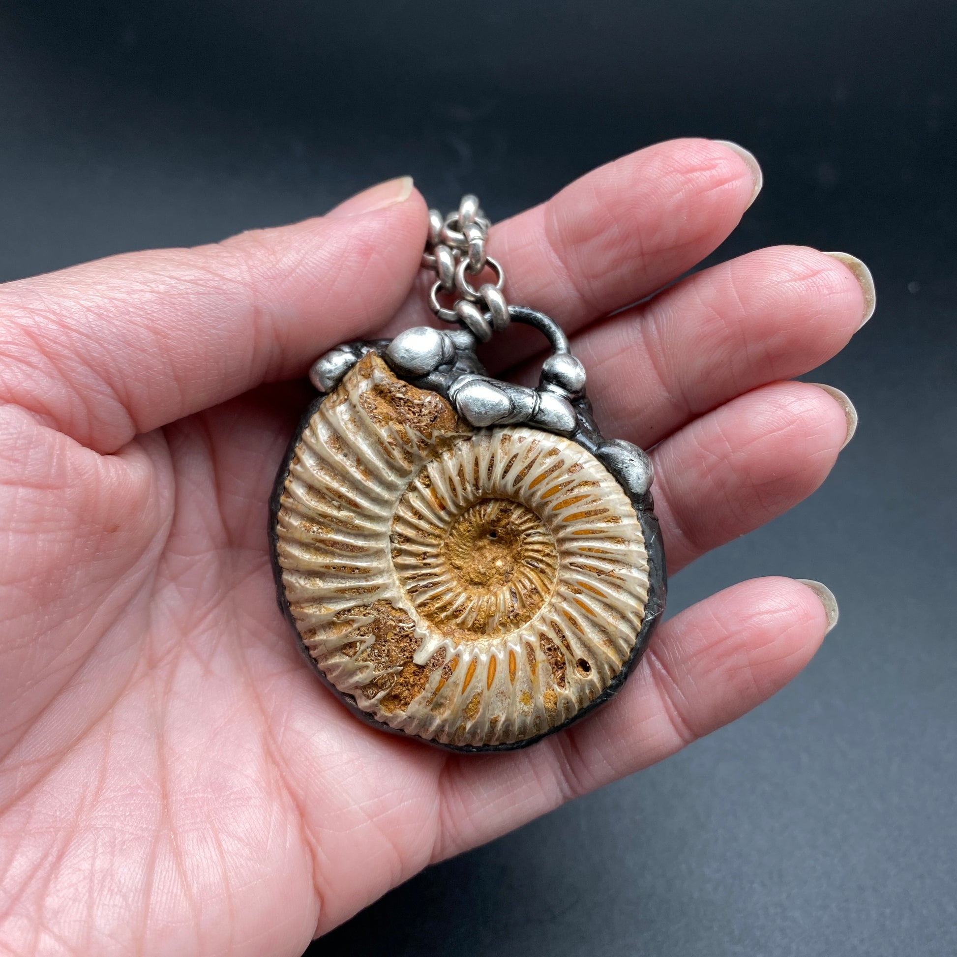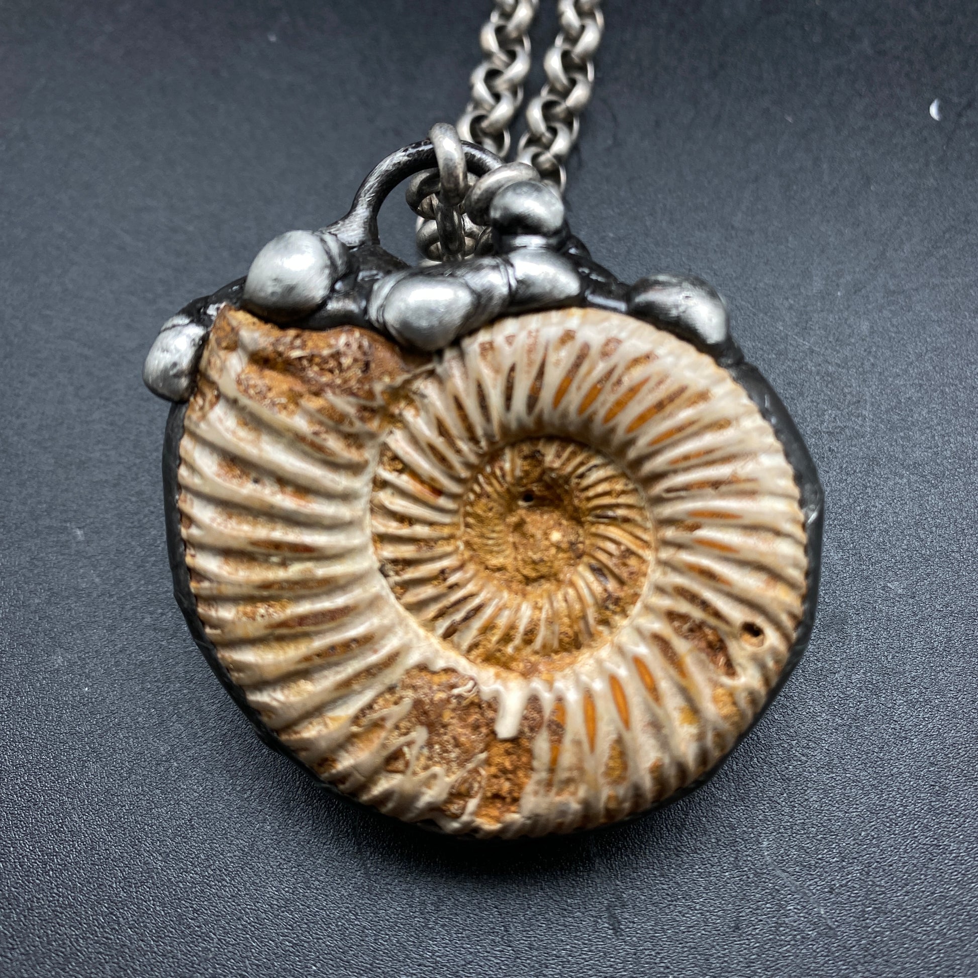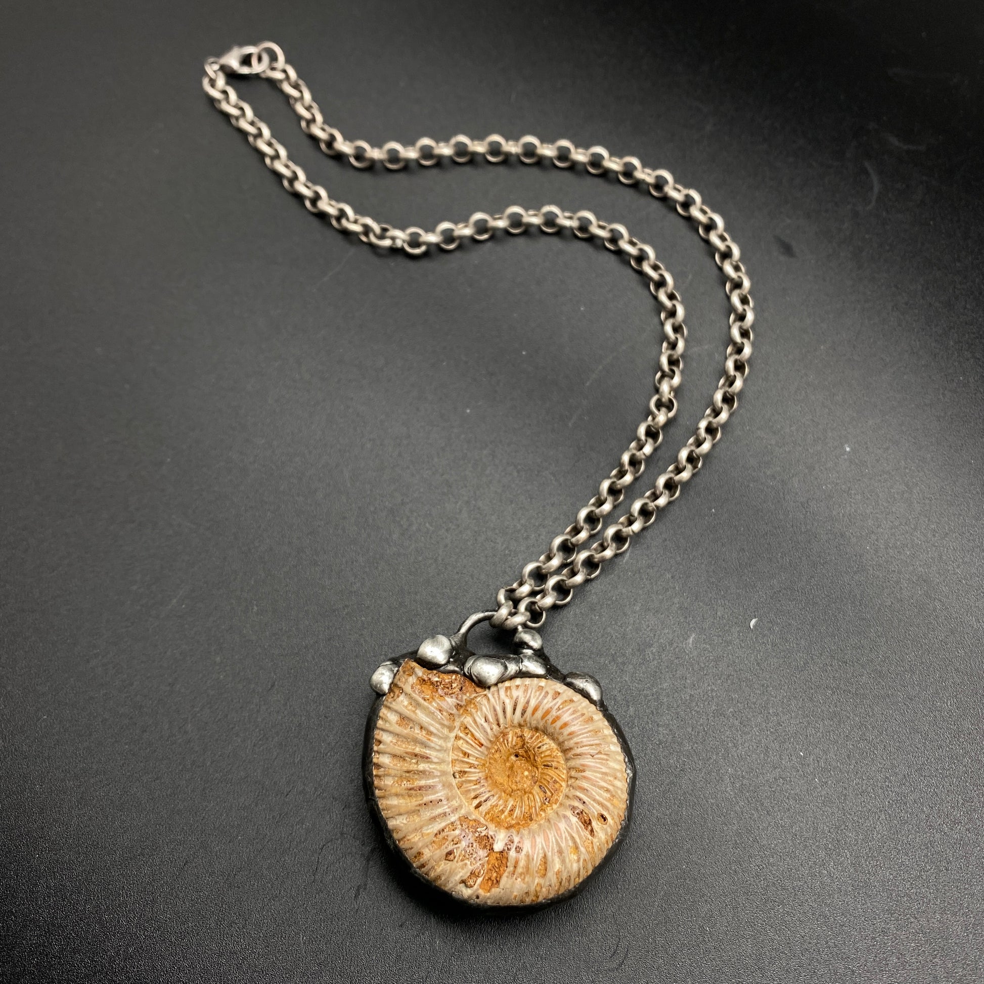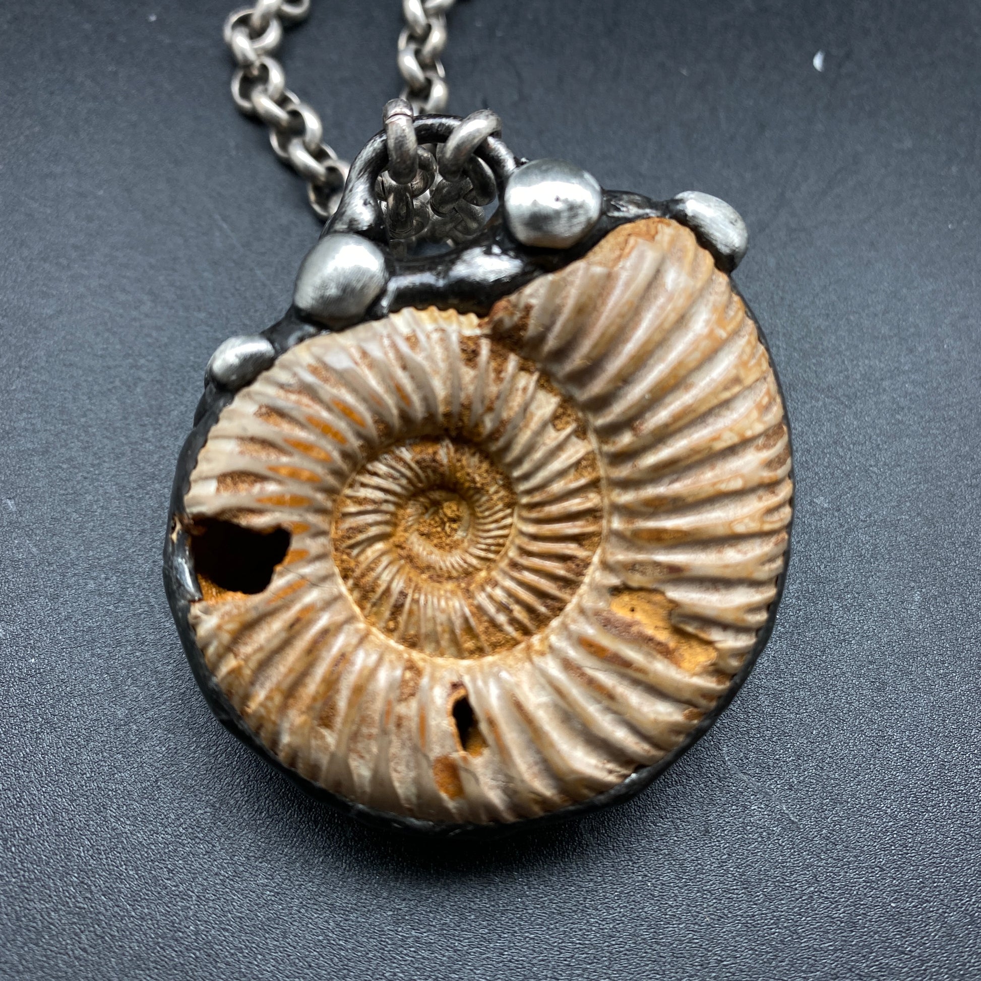 Fossilized Moroccan ammonite necklace. Soldered and oxidized with my signature technique. Photos show both sides of the fossil, antiqued silver plated chain.