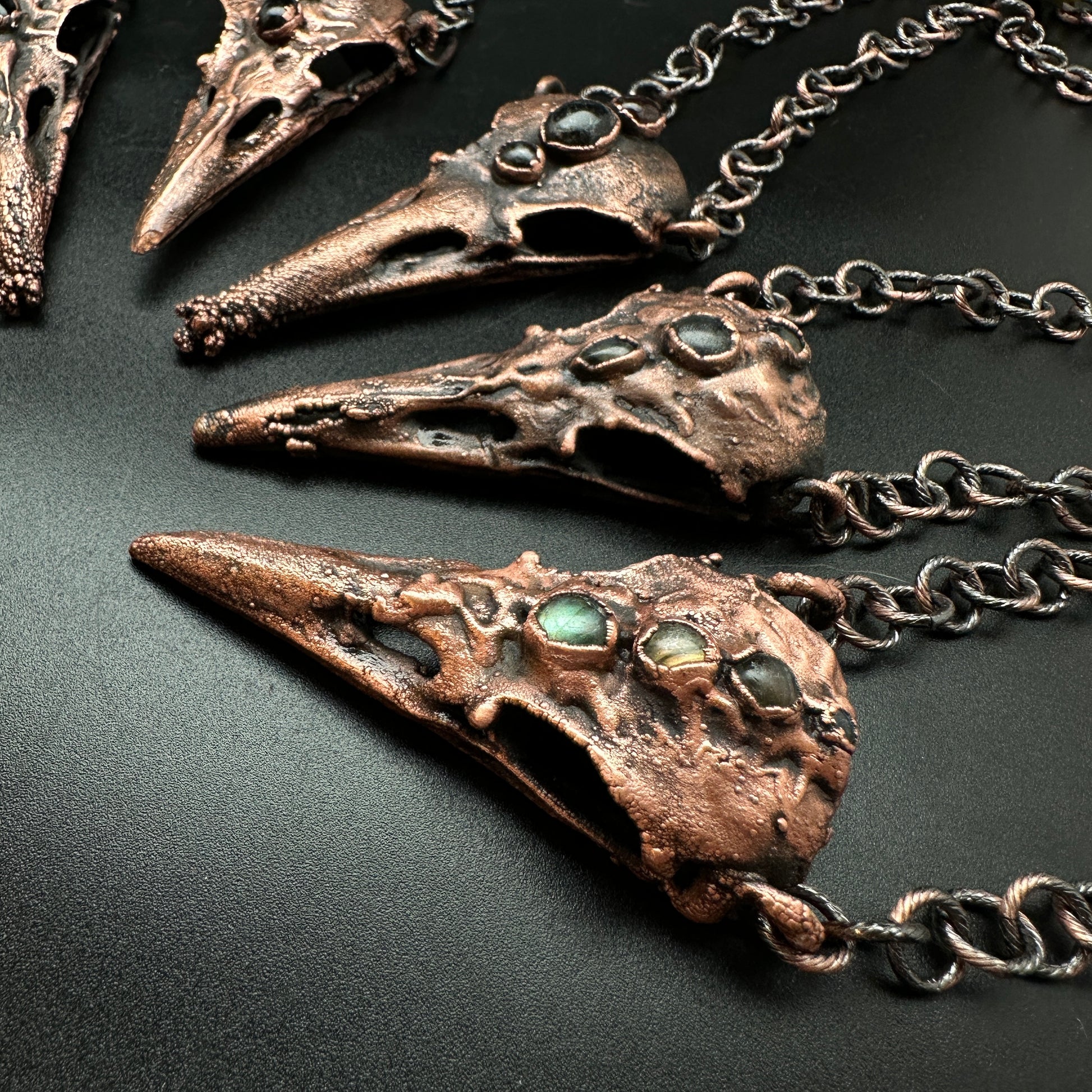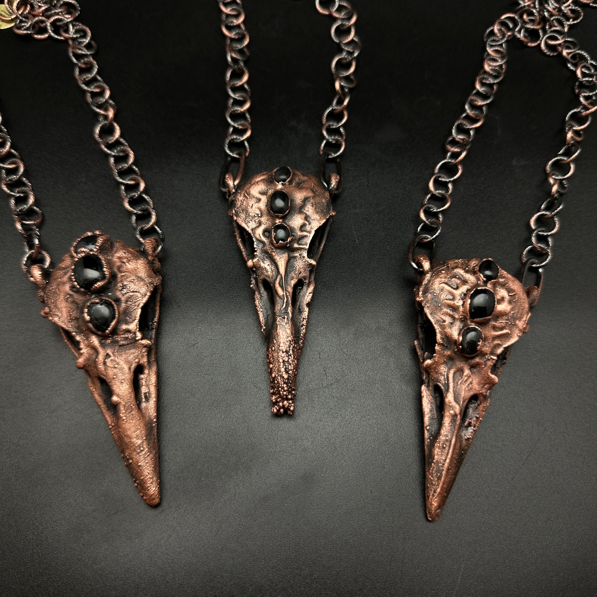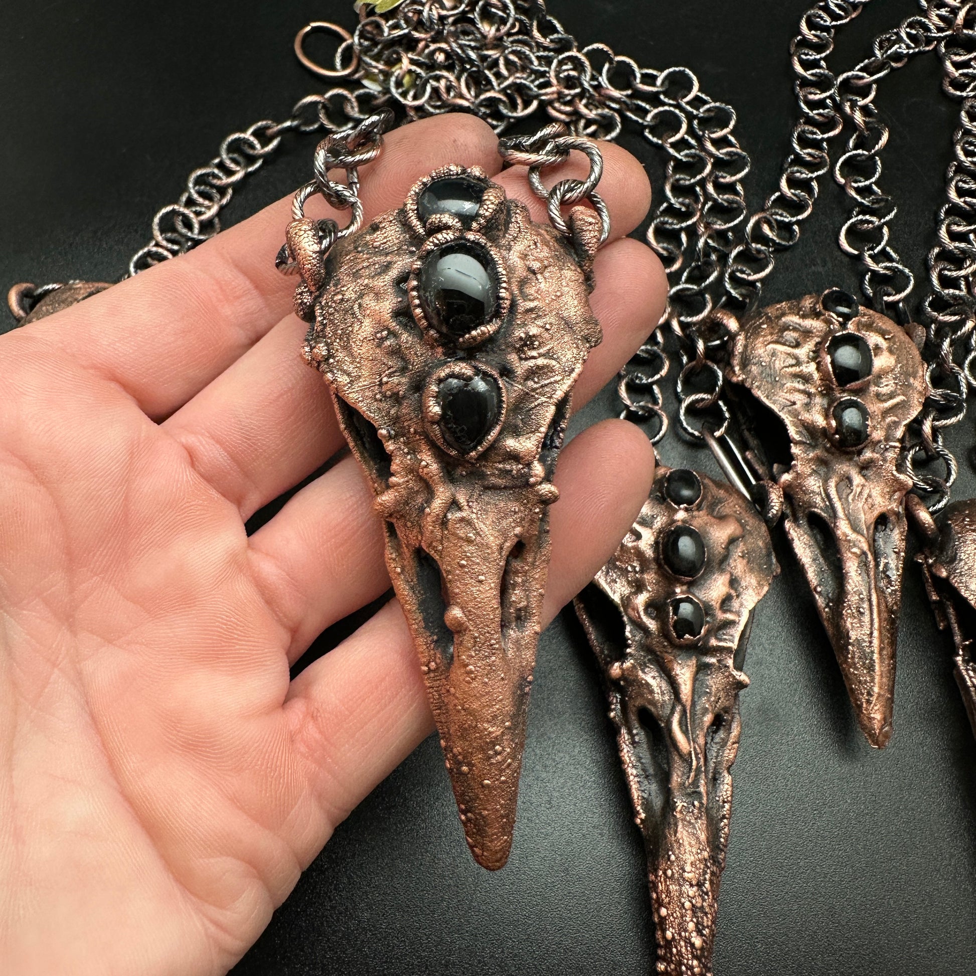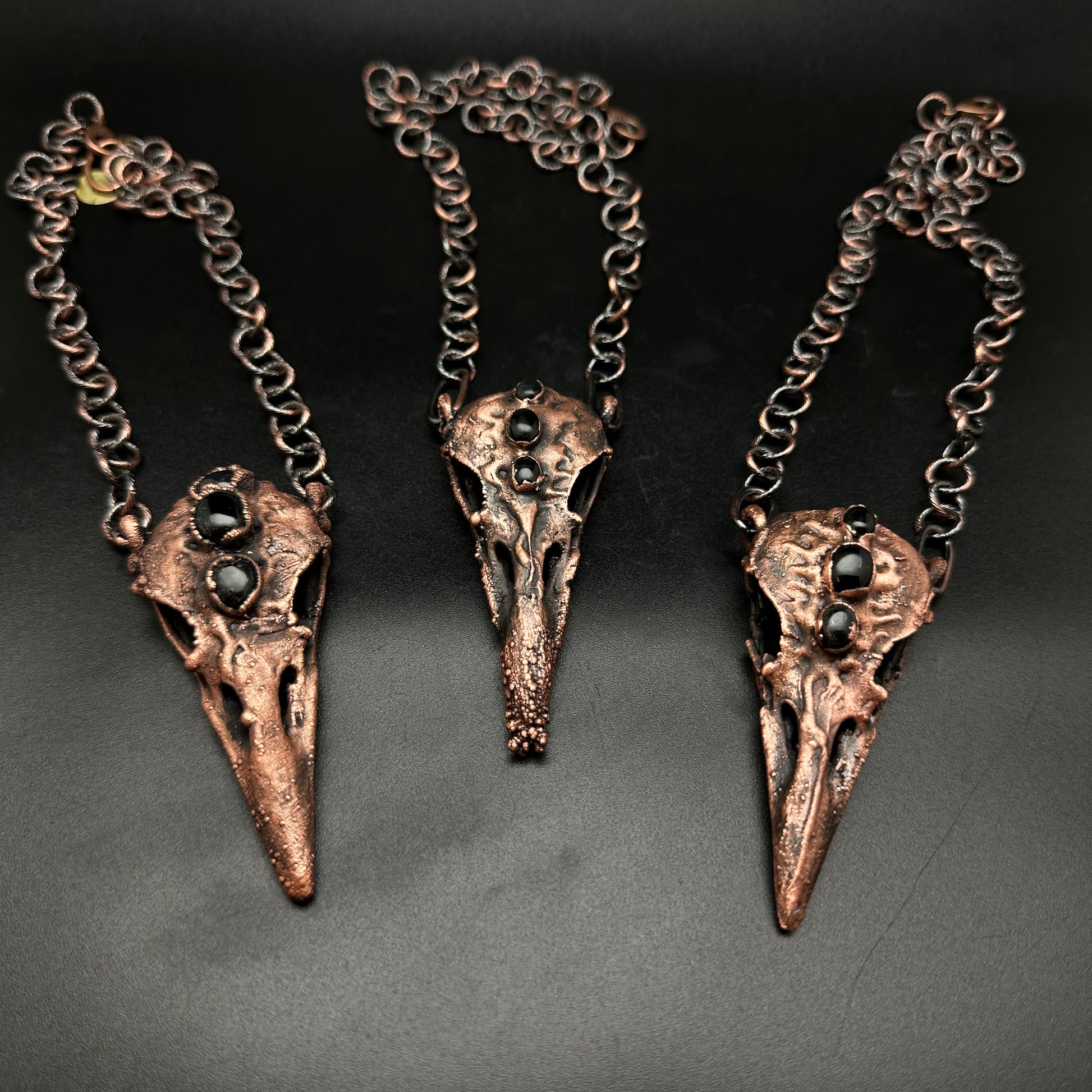 Custom made raven skull with onyx, copper electroformed, oxidized, and polished. (This is the smaller size) (not real skulls)