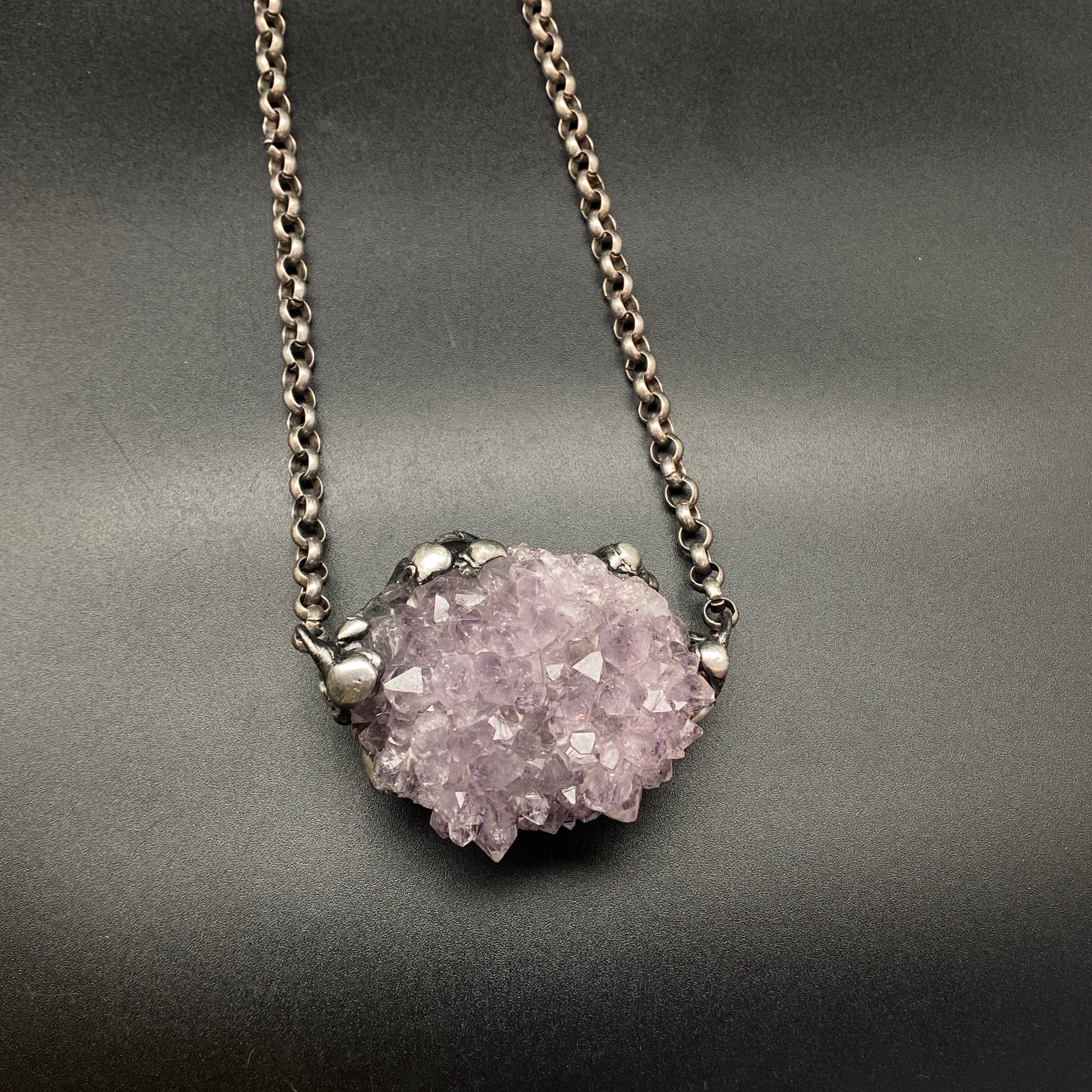 This soft purple amethyst druzy crystal, is oxidized and soldered with a signature technique, secured with a heavy gauge antiqued silver plate chain.