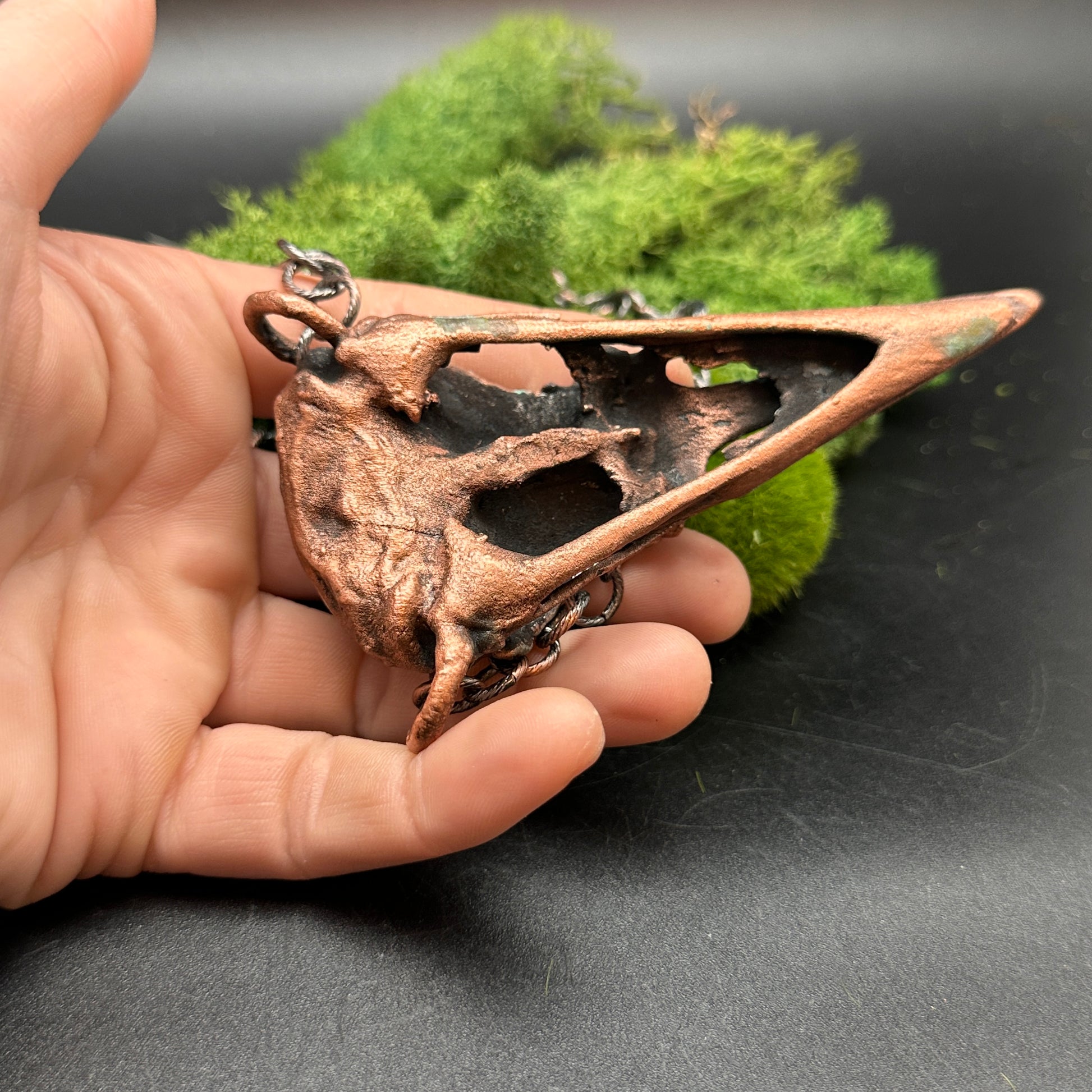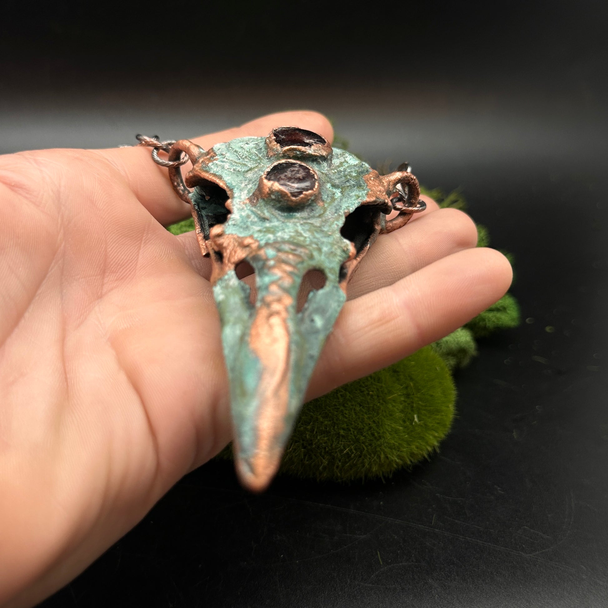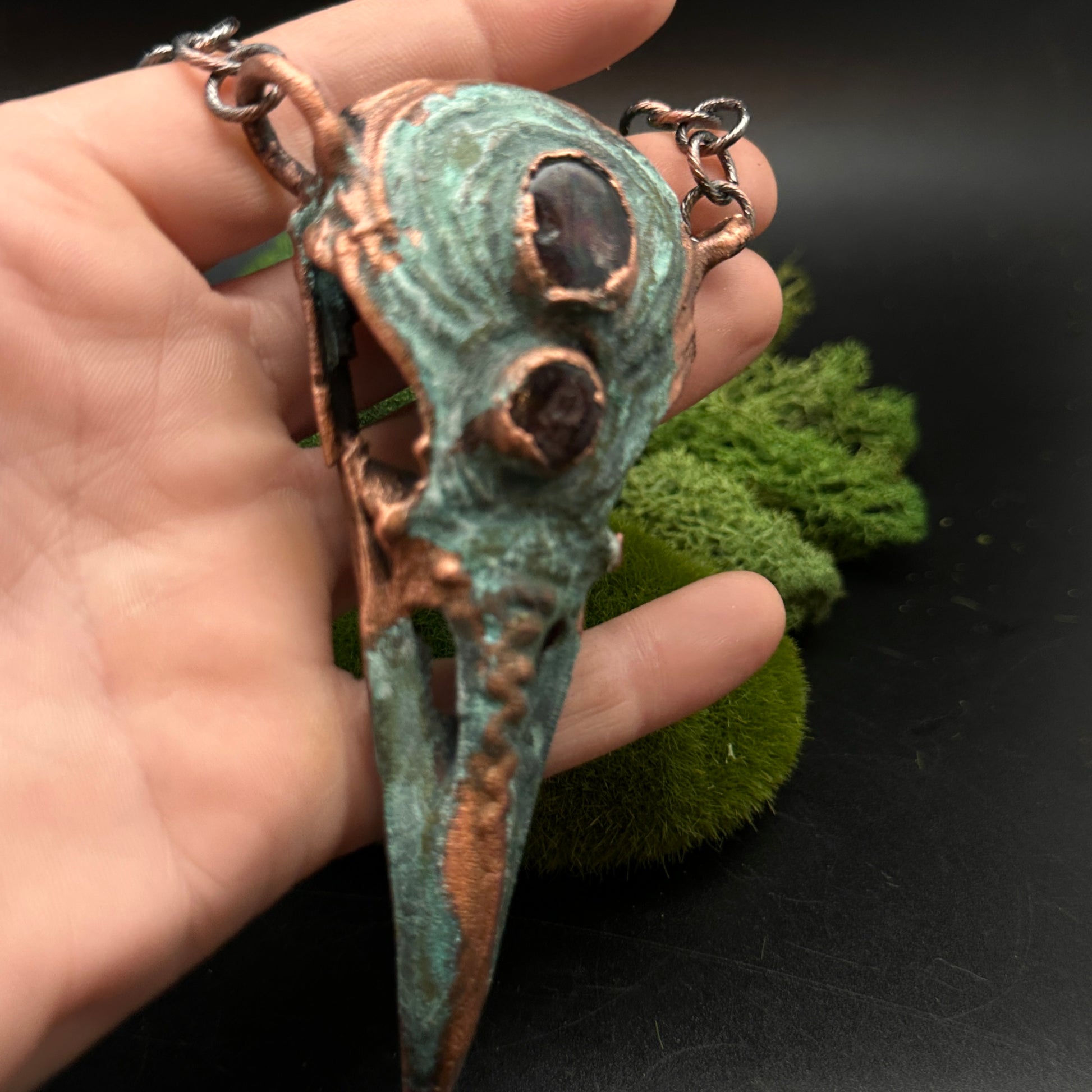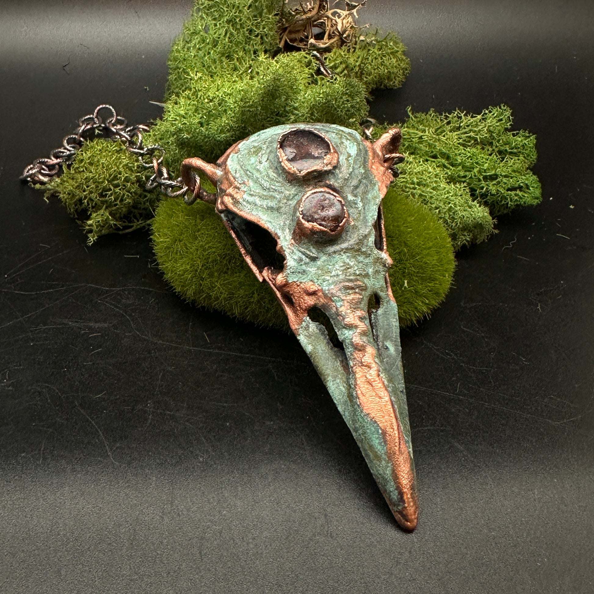 Featuring two embedded garnets and intricate texture, this copper raven skull pendant exudes a raw, earthy energy. A powerful piece for those drawn to natural, untamed beauty. Copper electroformed, oxidized, and polished. On sturdy, lightweight, copper plated chain.