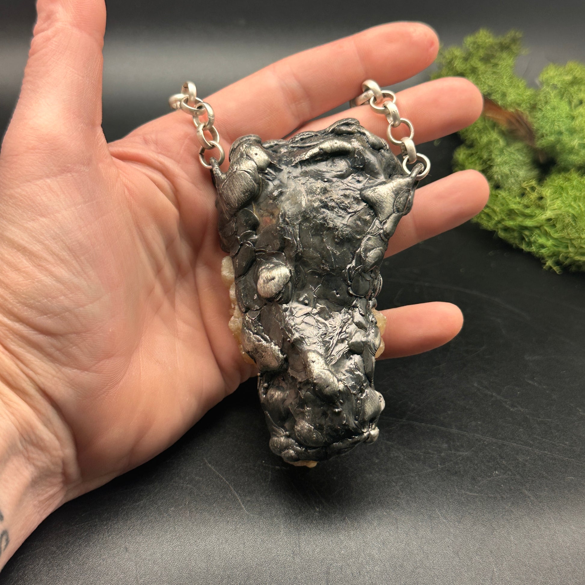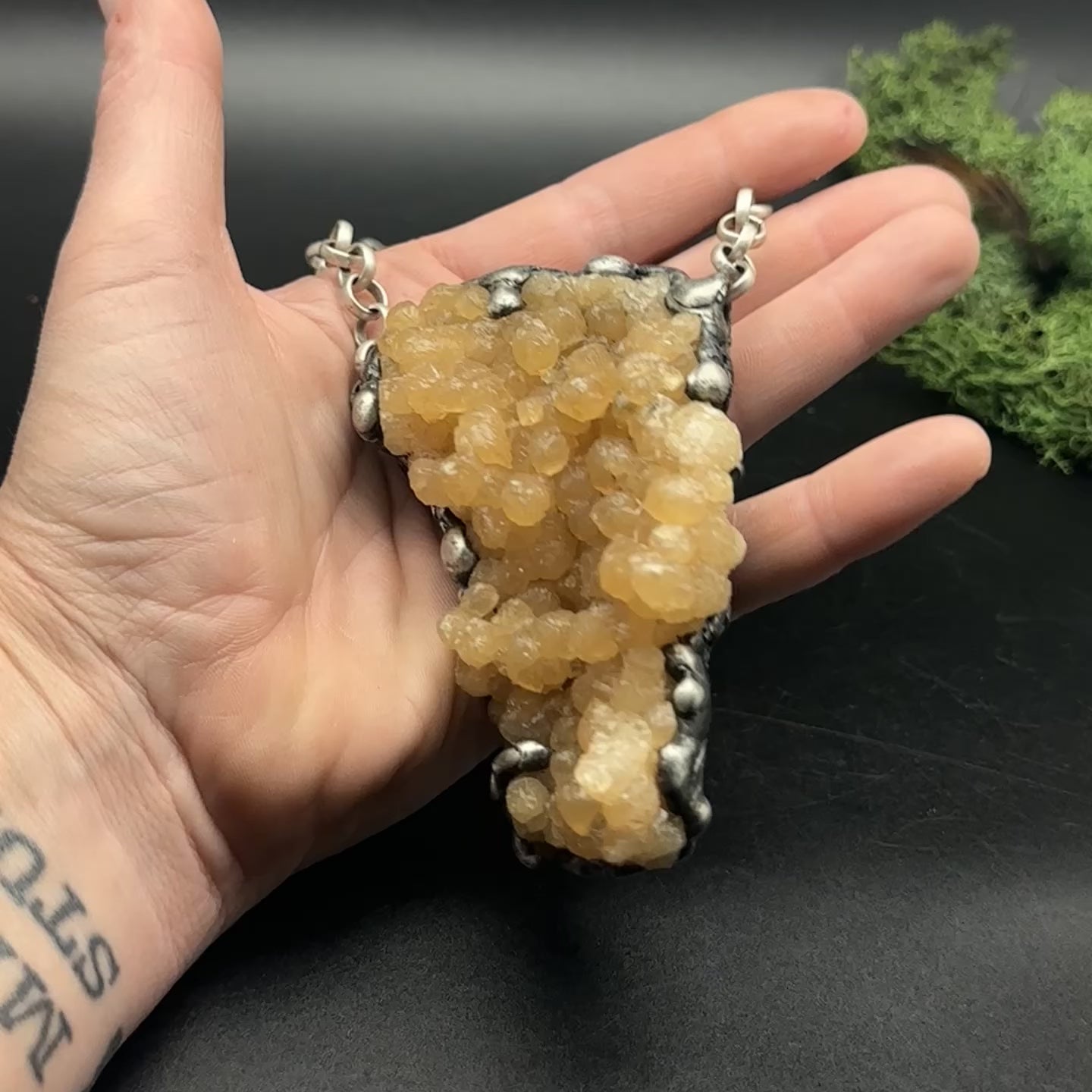 A gorgeous (and large!) specimen of Golden Botryoidal Calcite from India, with soft, rounded honey glazed-like crystals. Soldered and oxidized with my signature technique. On heavy gauge silver plated chain.