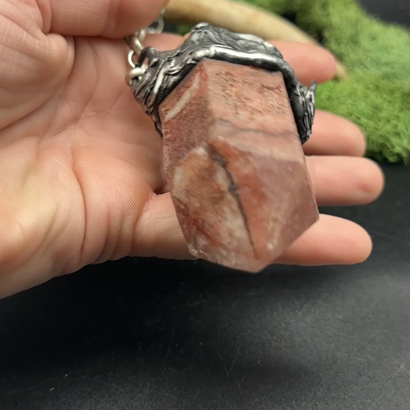 This huge raw red quartz crystal feels like an ancient amulet. Its opaque, mysterious energy is grounded by heavy textured solder that hugs the stone. Wear your magic.