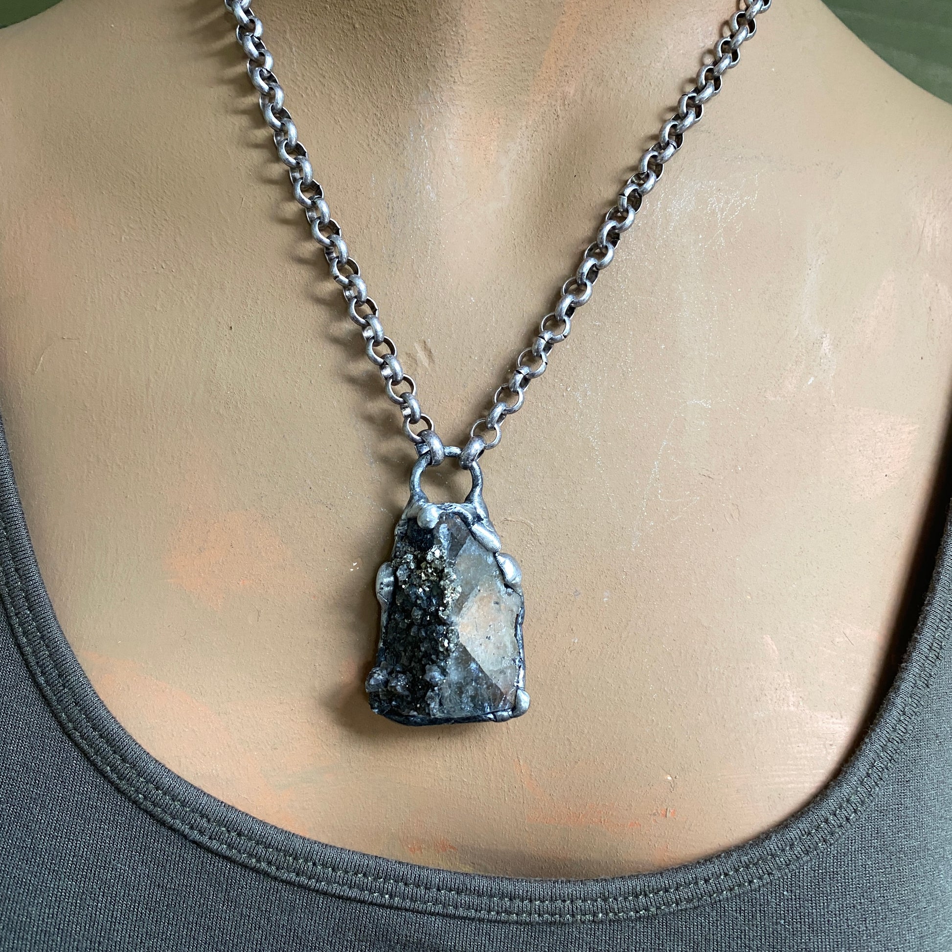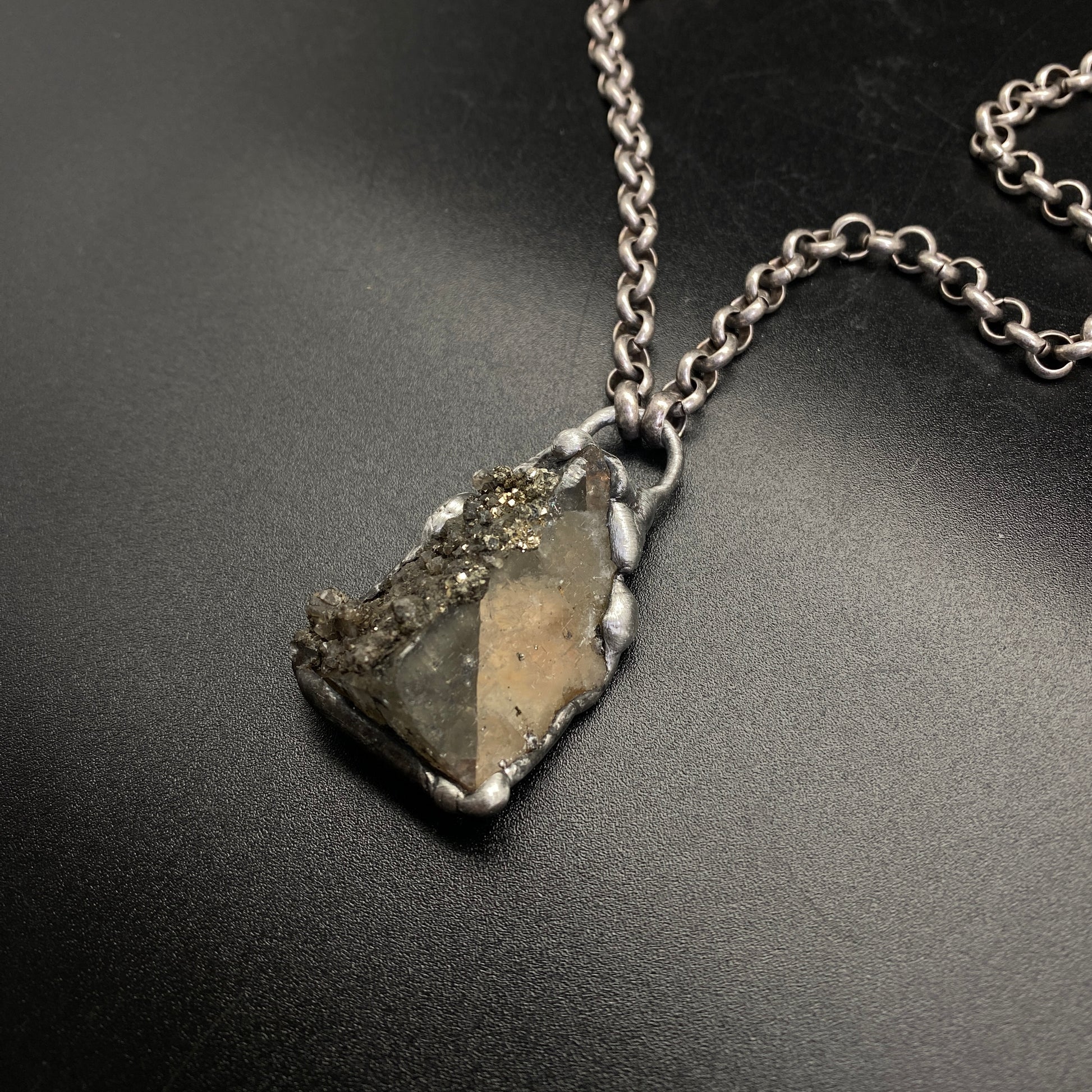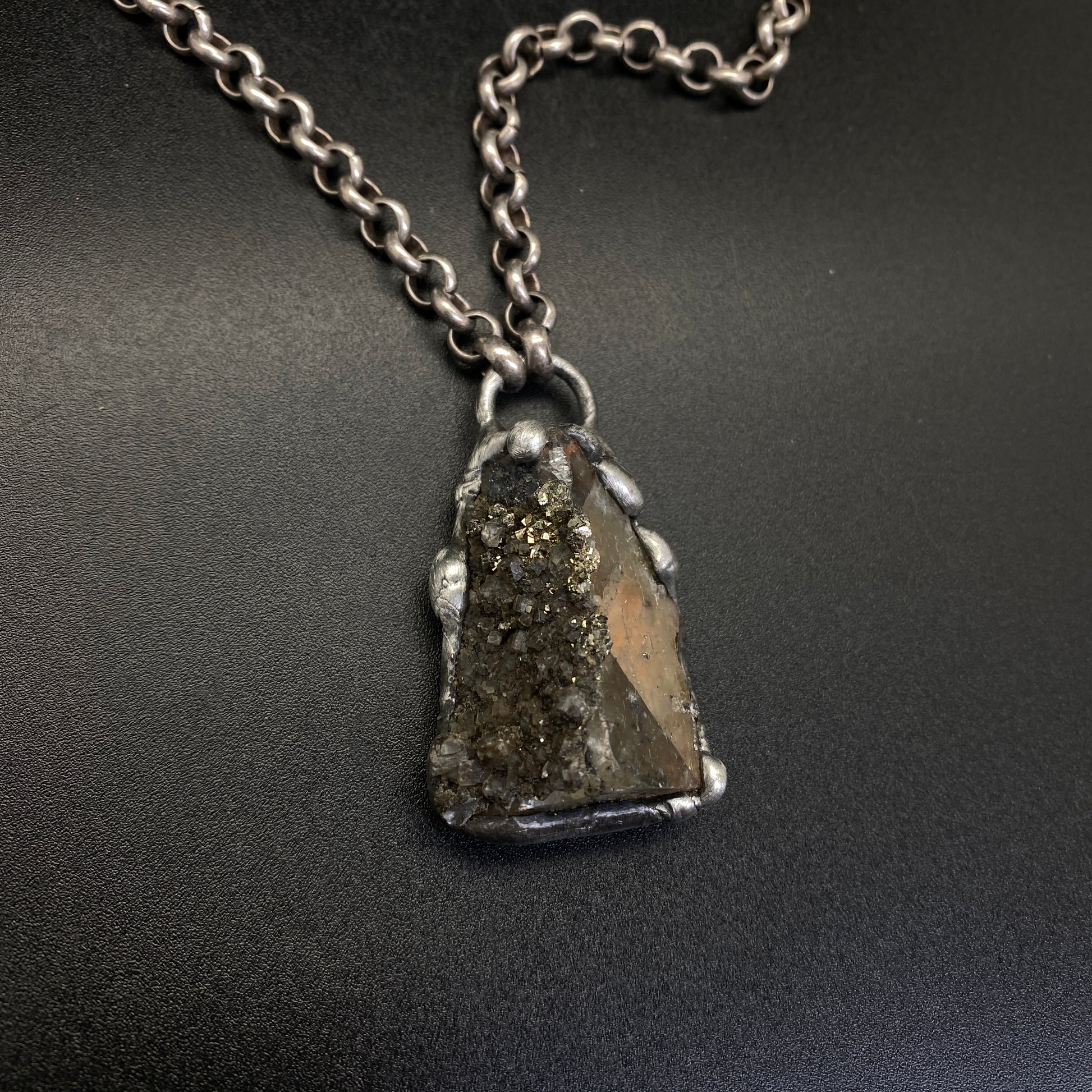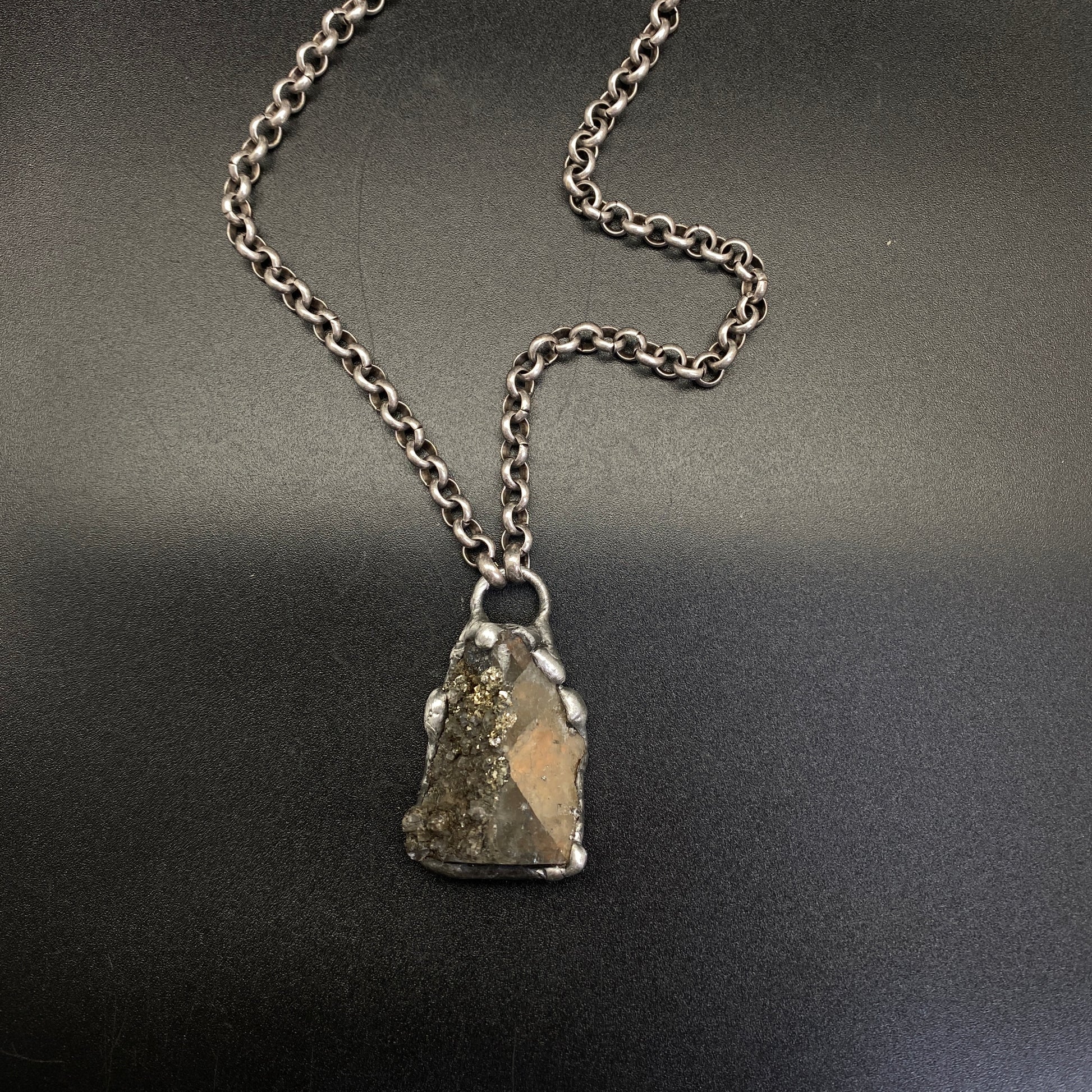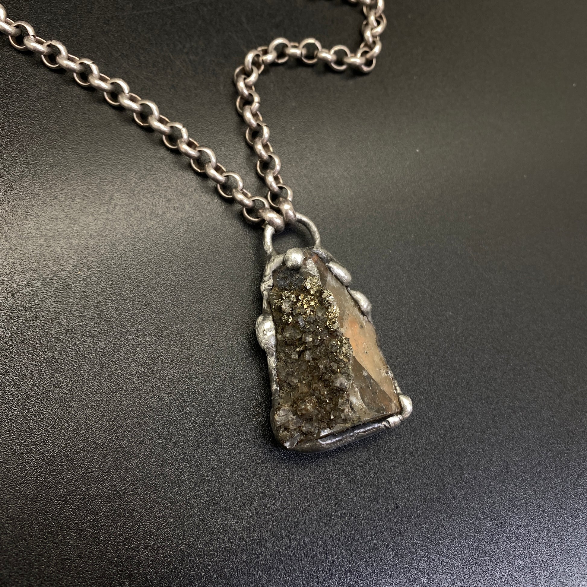Small Fluorite cluster with Pyrite. Soldered with my signature technique. Oxidized and sealed on heavy gauge silver plated rolo chain with a lobster clasp.