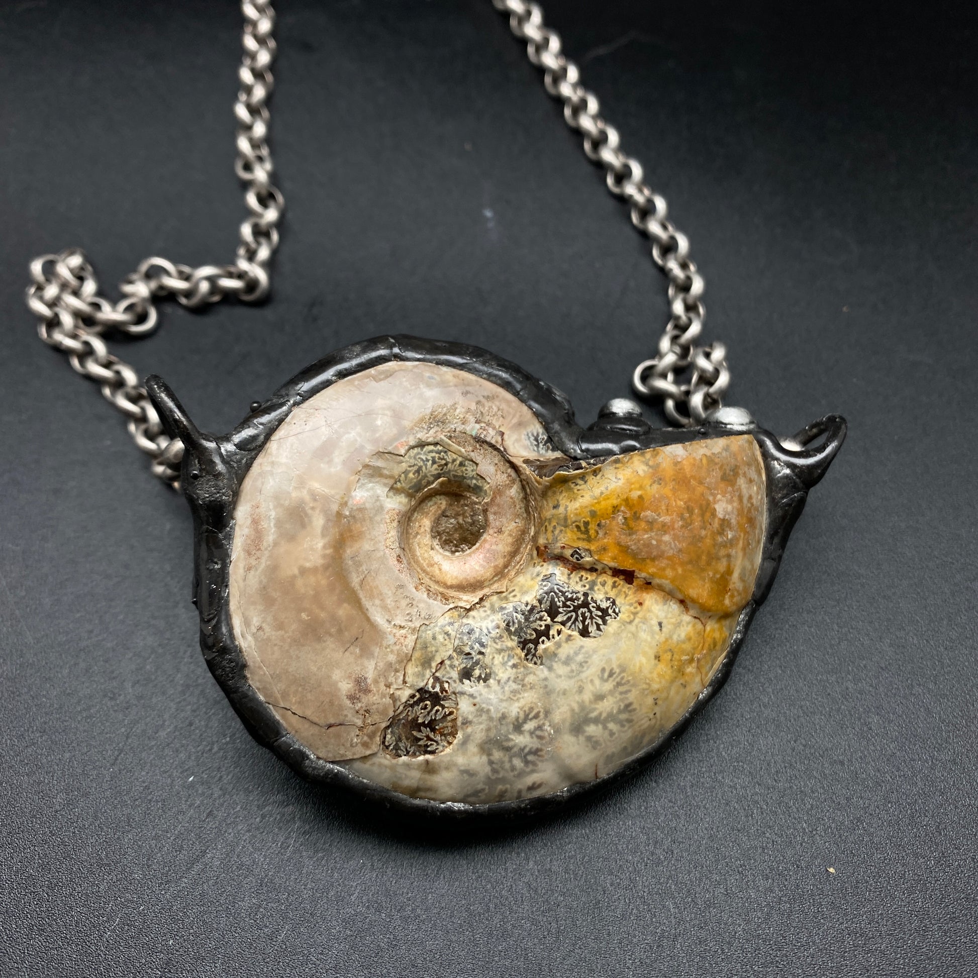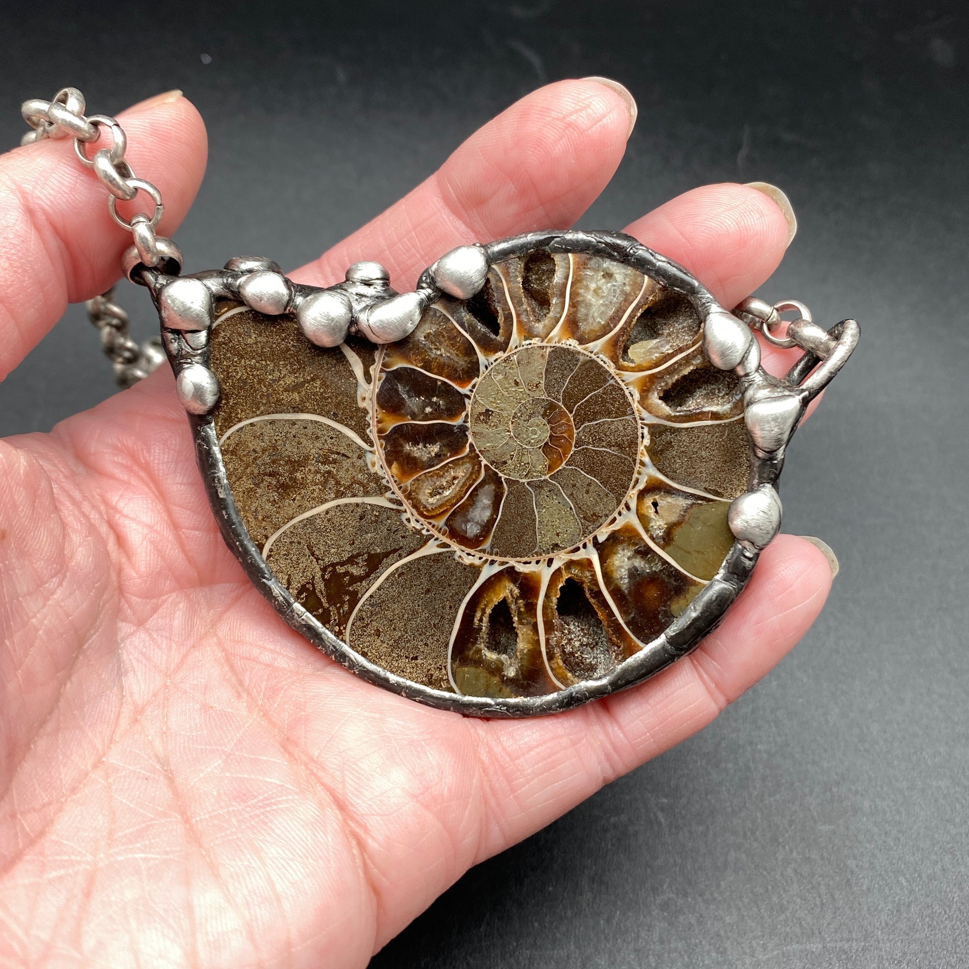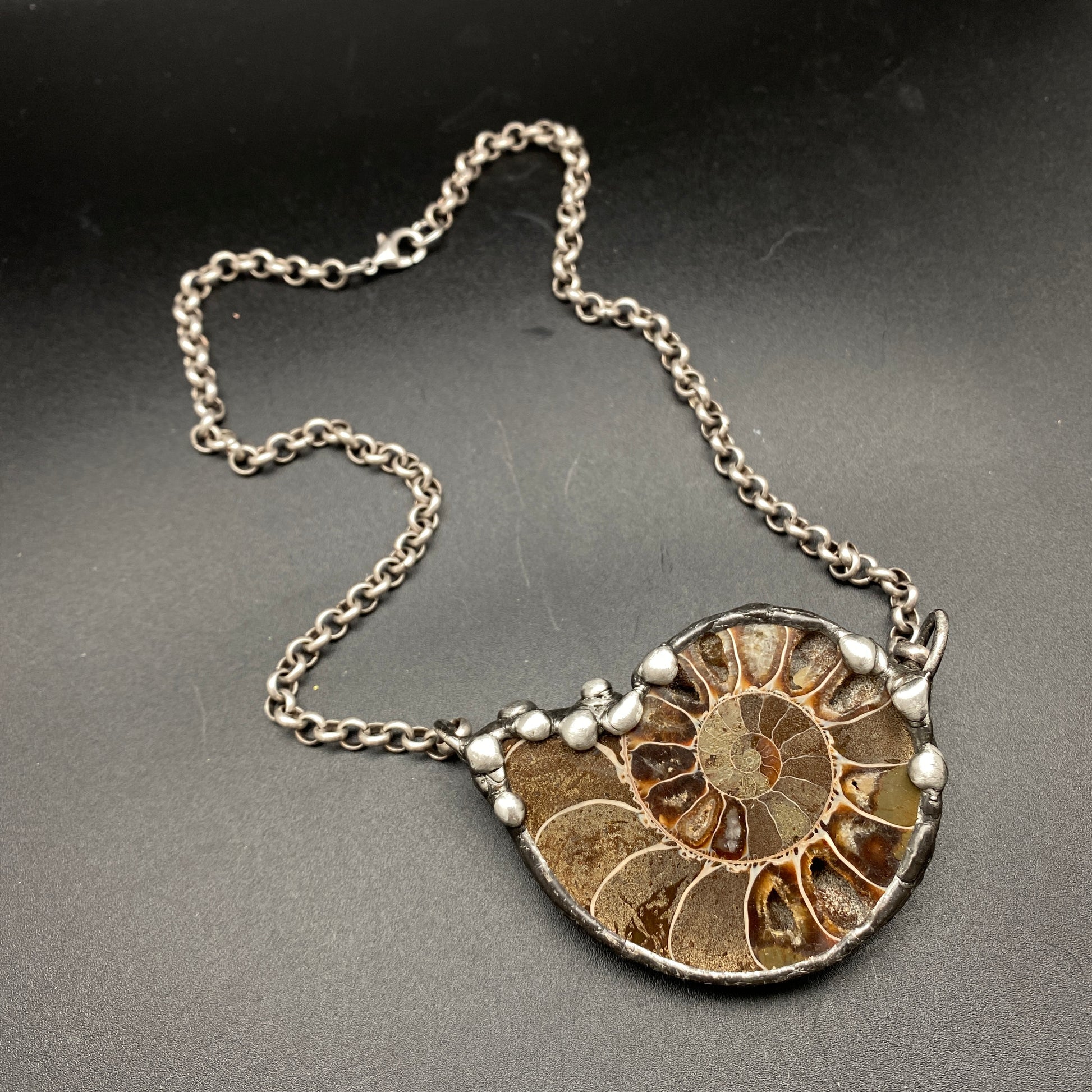 Fossil ammonite, soldered and oxidized with my signature technique. Photos show both sides of the fossil, sturdy antiqued silver plated rolo chain. Listing is for one necklace, (piece on right in photos). Pendant is approx. 2.5" wide