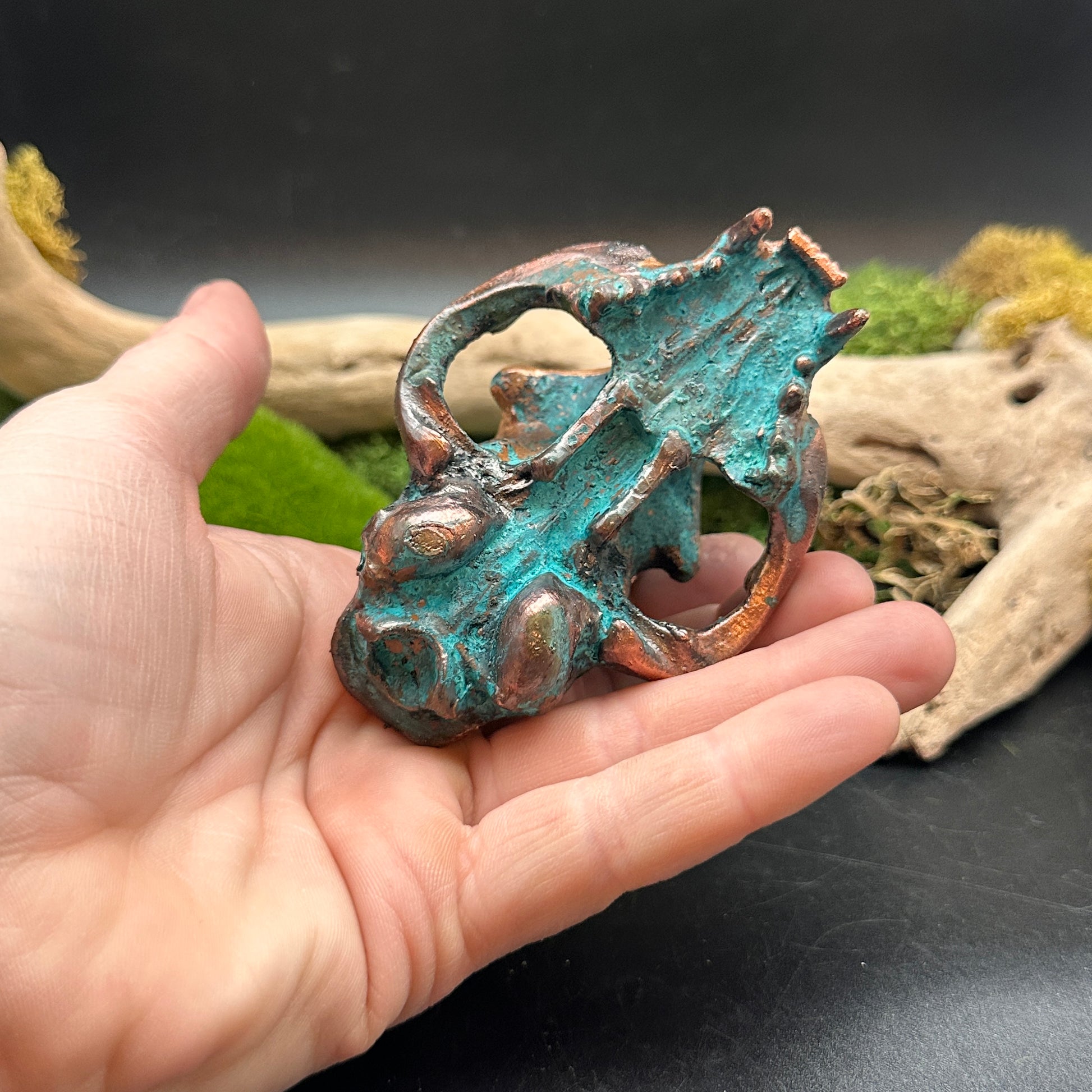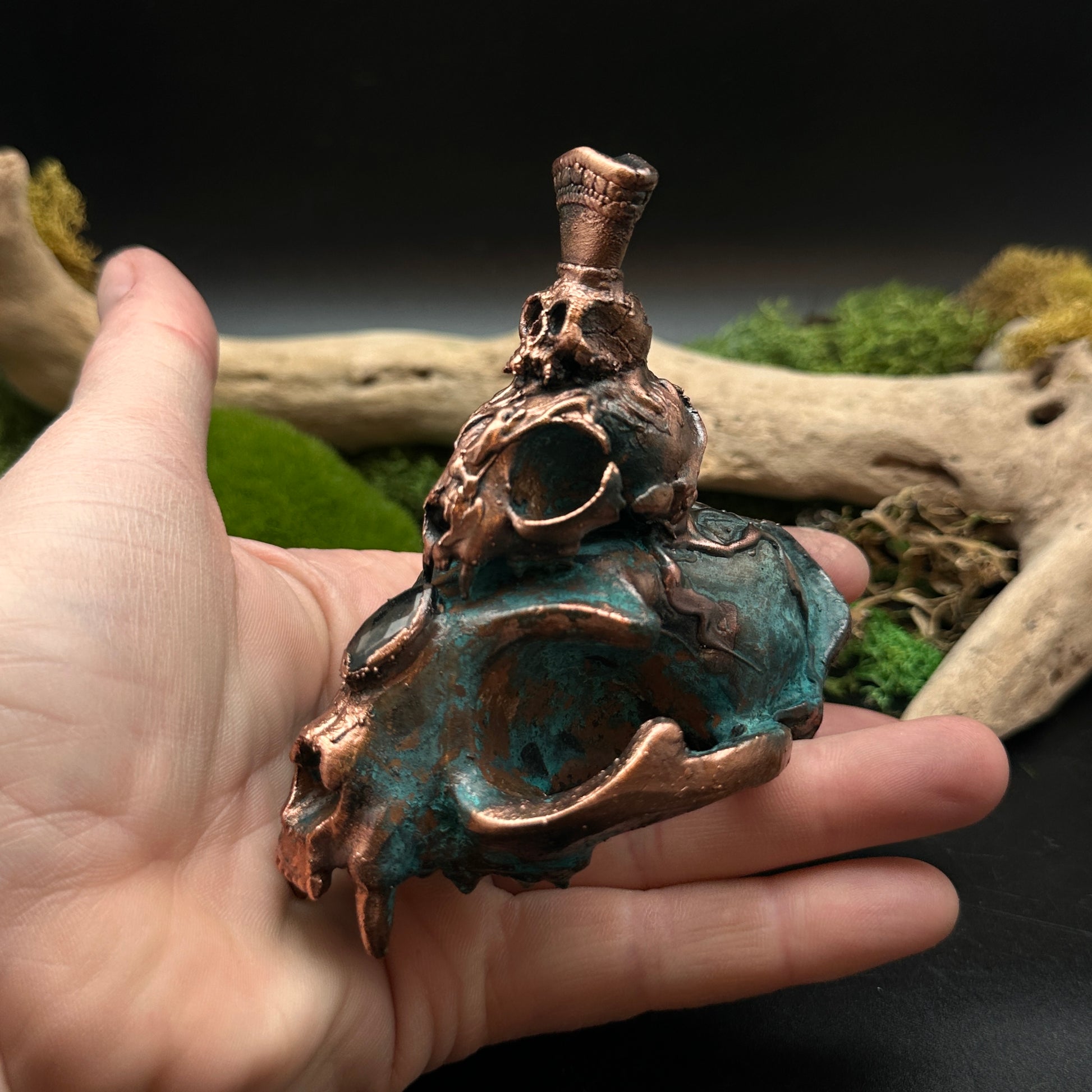 Feline skulls and a tiny crowned cranium stacked in copper with a faceted smoky quartz focal point.