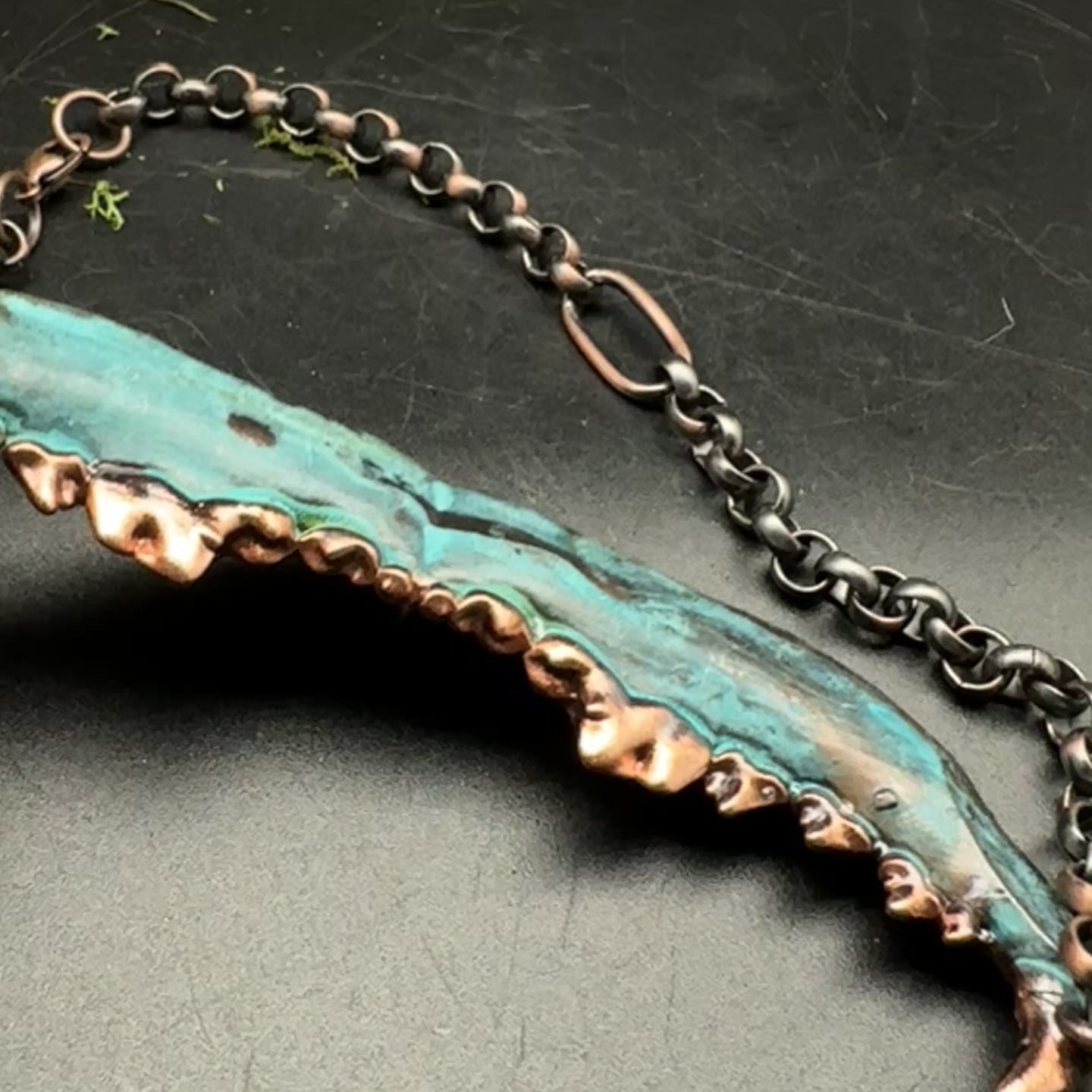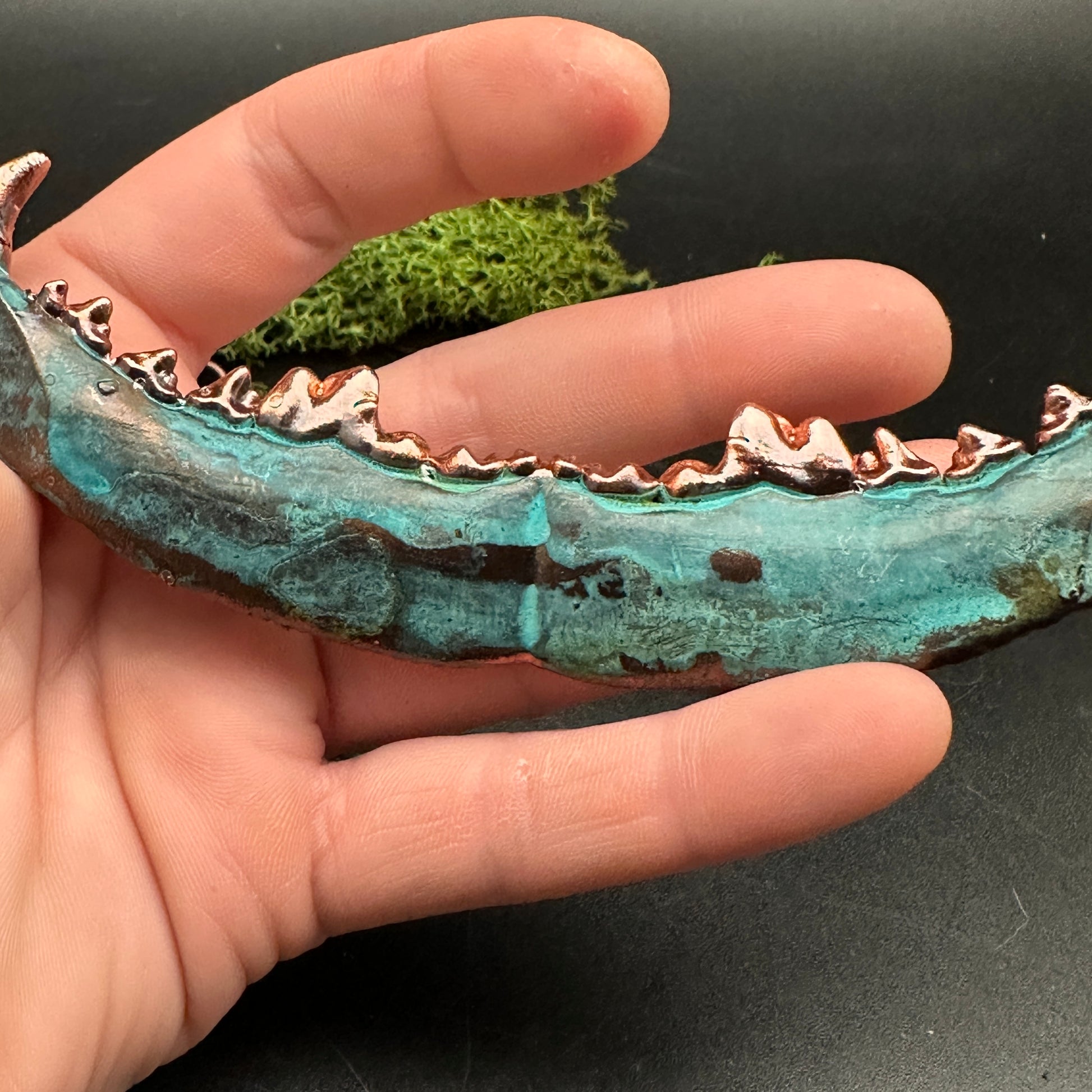 This wolf jawbone necklace stands out in it's simple but rich-toned vibe and raw, untamed beauty. Perfect for those drawn to sleek, nature-inspired styles. The design is modeled after a grey wolf jawbone, copper electroformed, oxidized, and polished. Choose your chain length. Sturdy copper rolo chain.