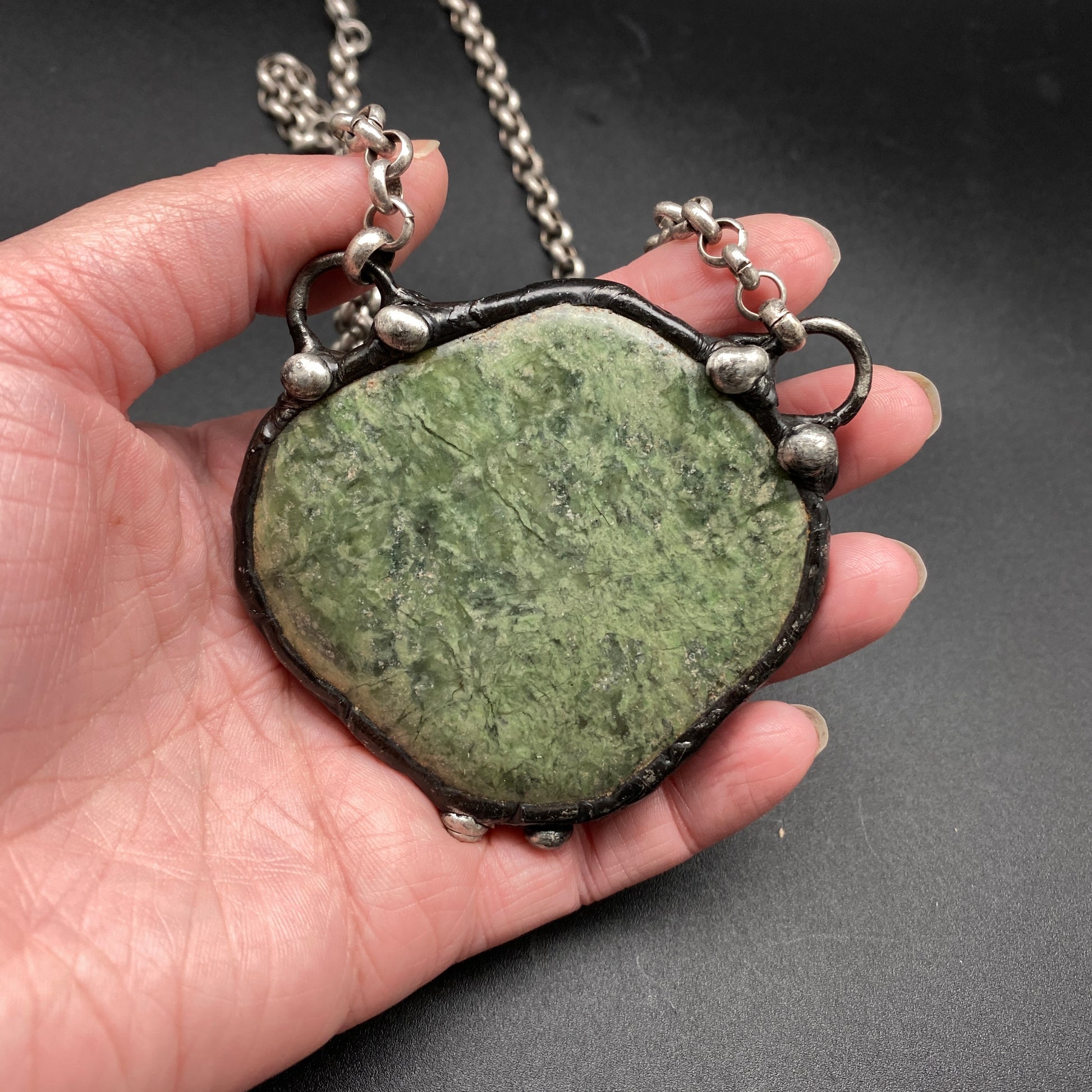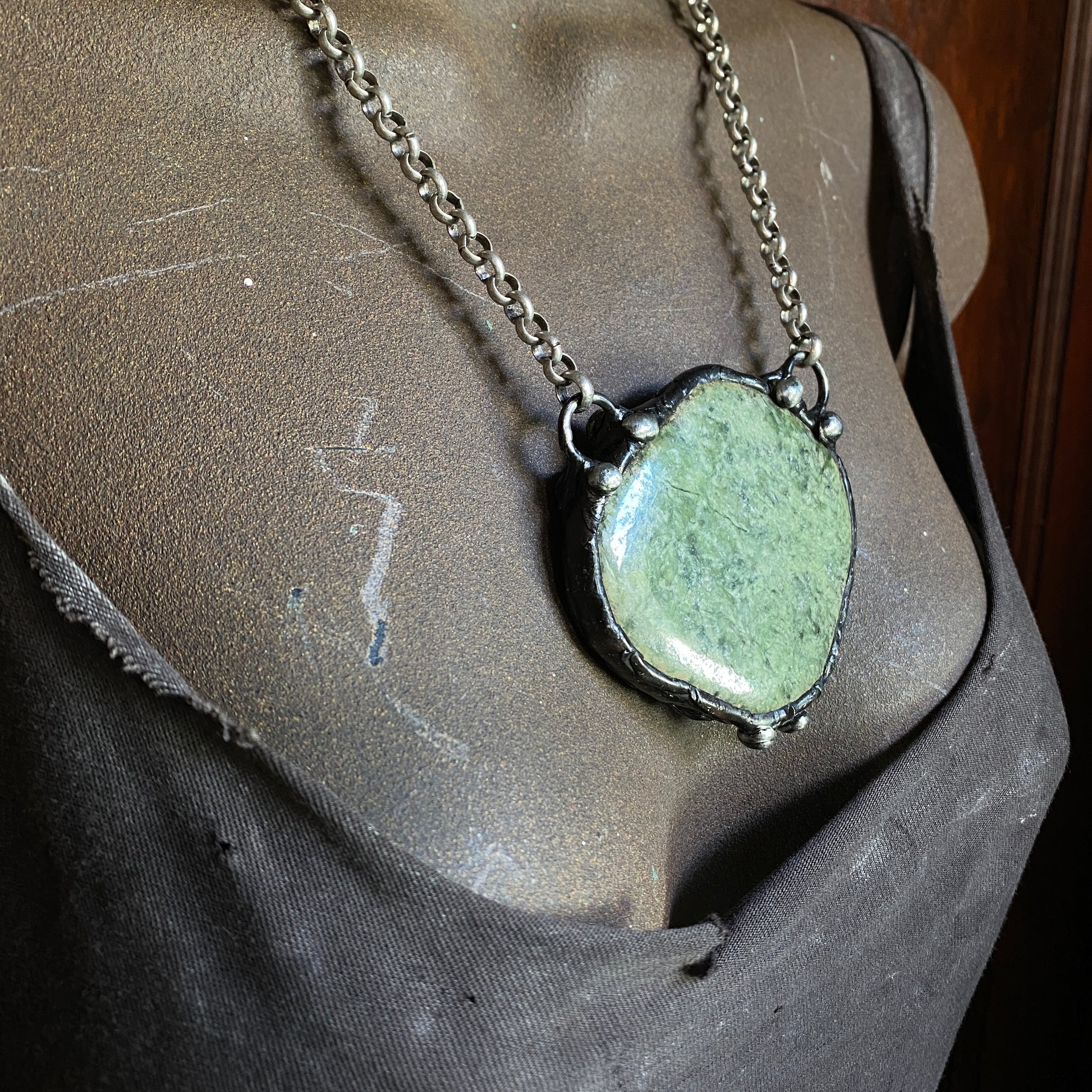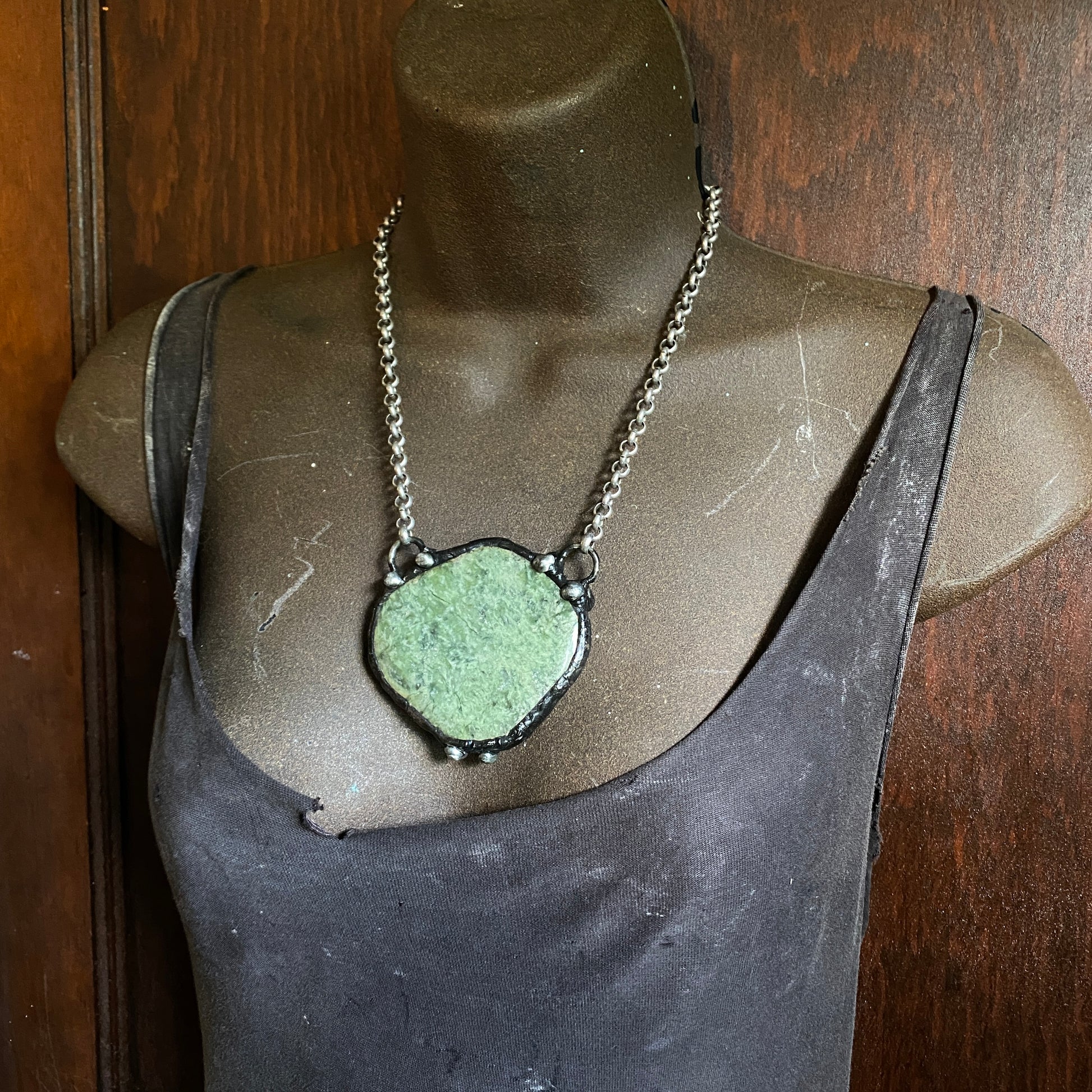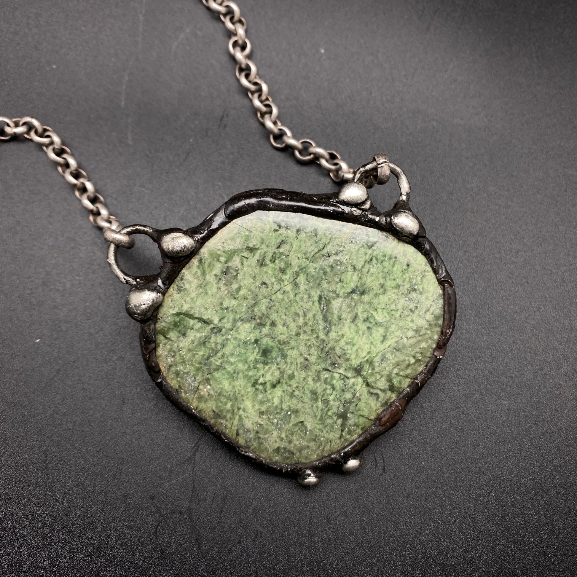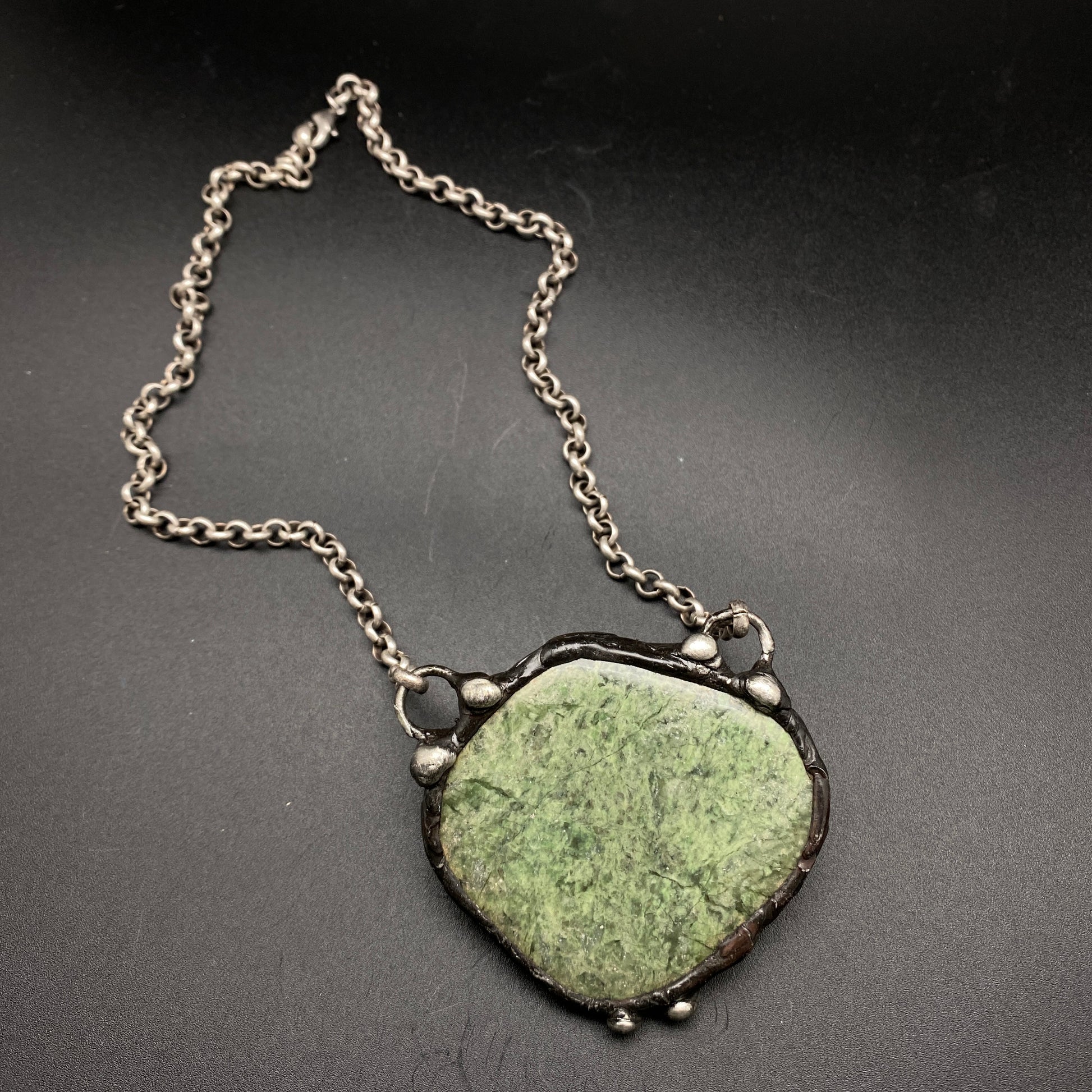 Polished green garnet, with soft green tones. Soldered and oxidized with my signature technique, open on back. Heavy gauge antiqued silver plate chain