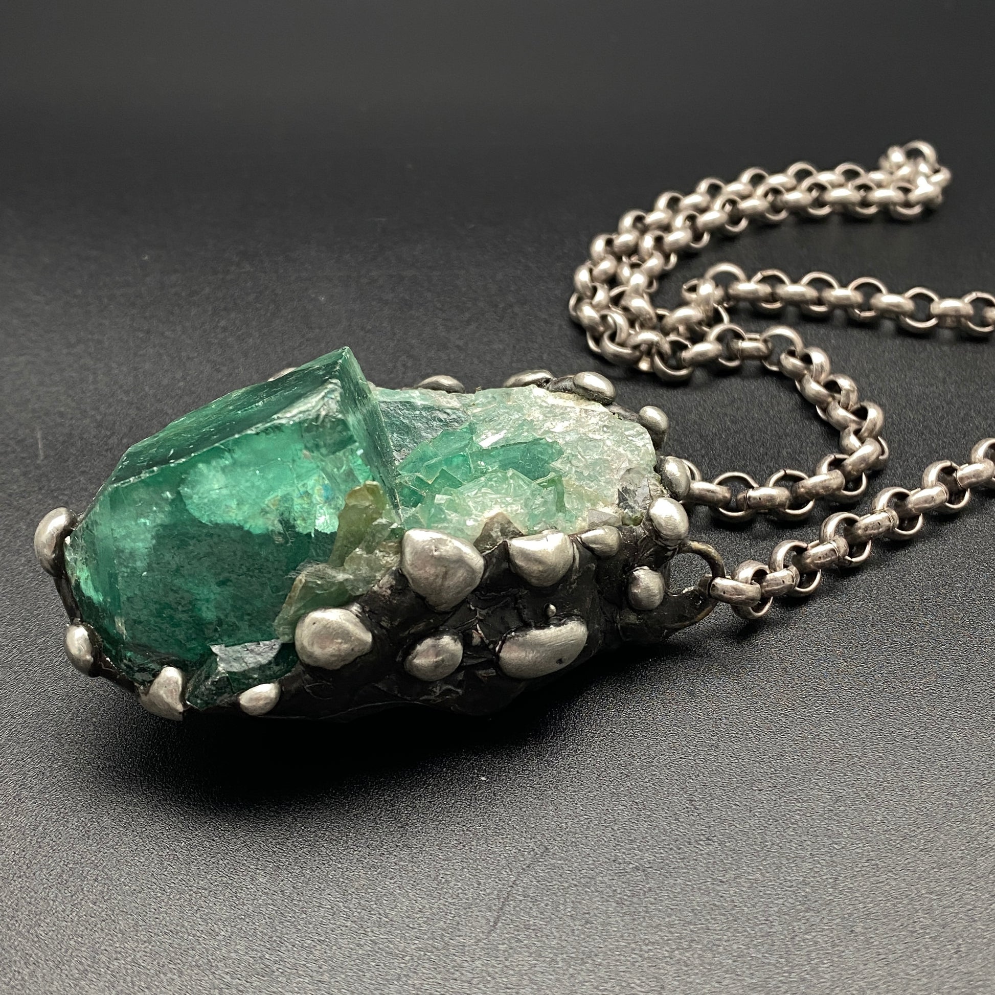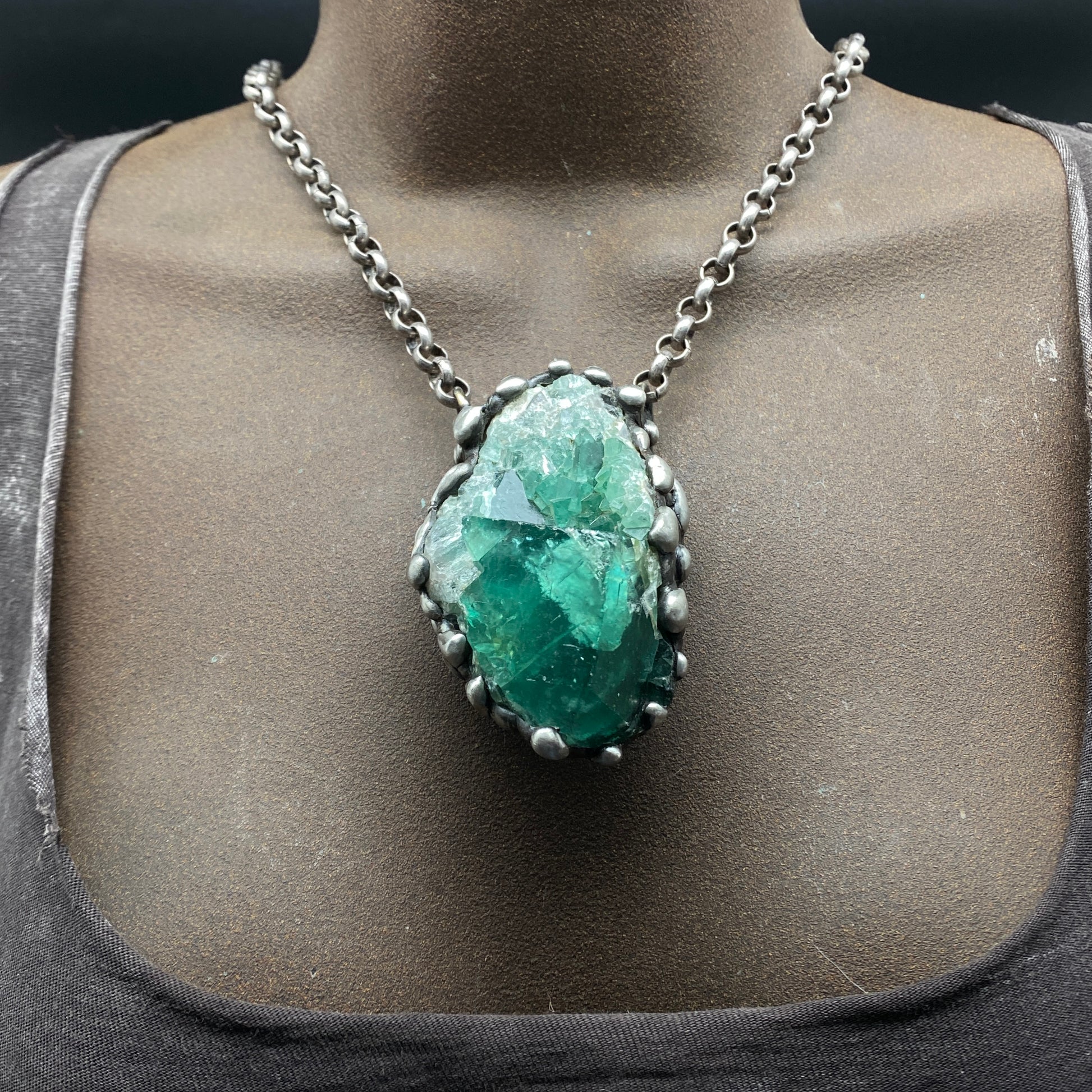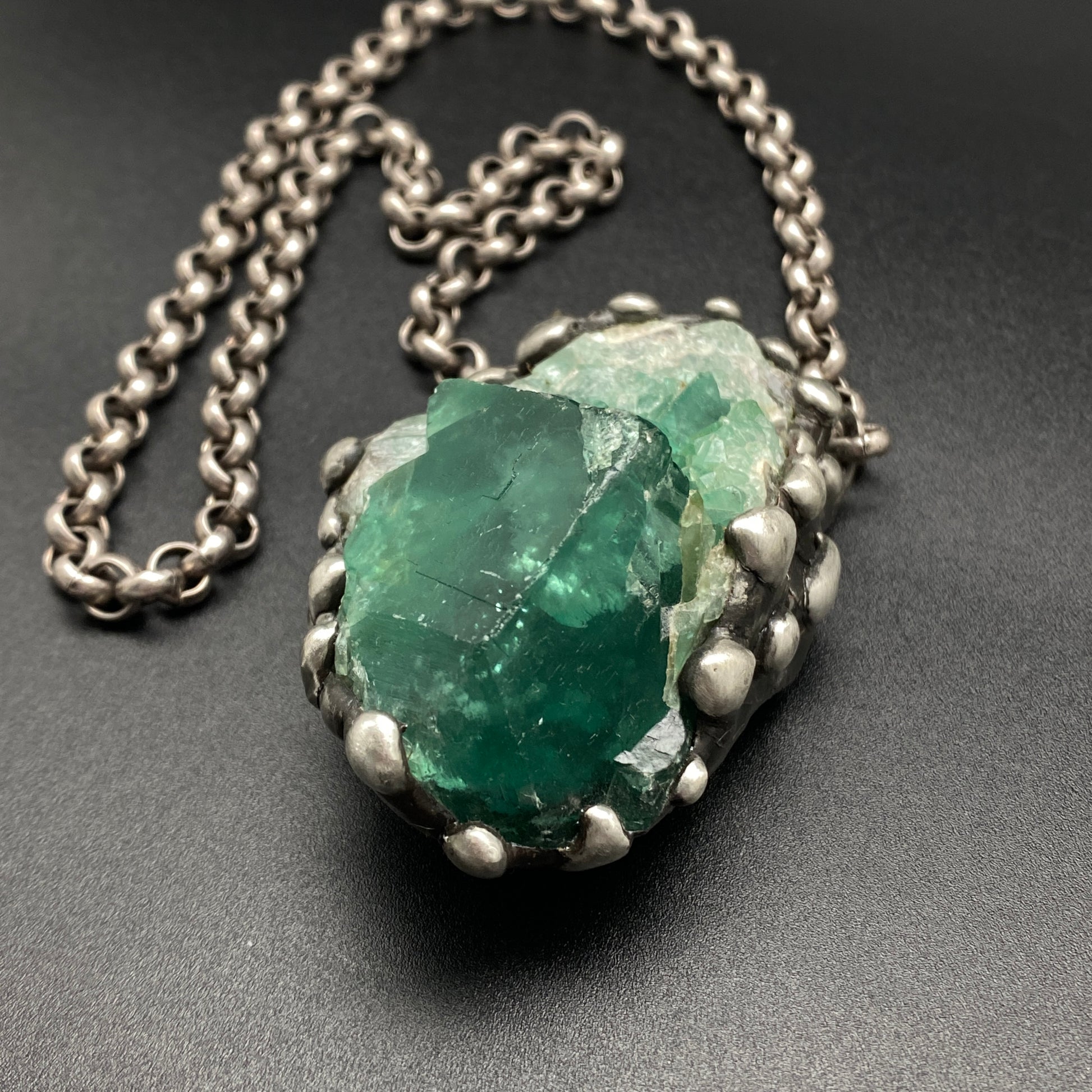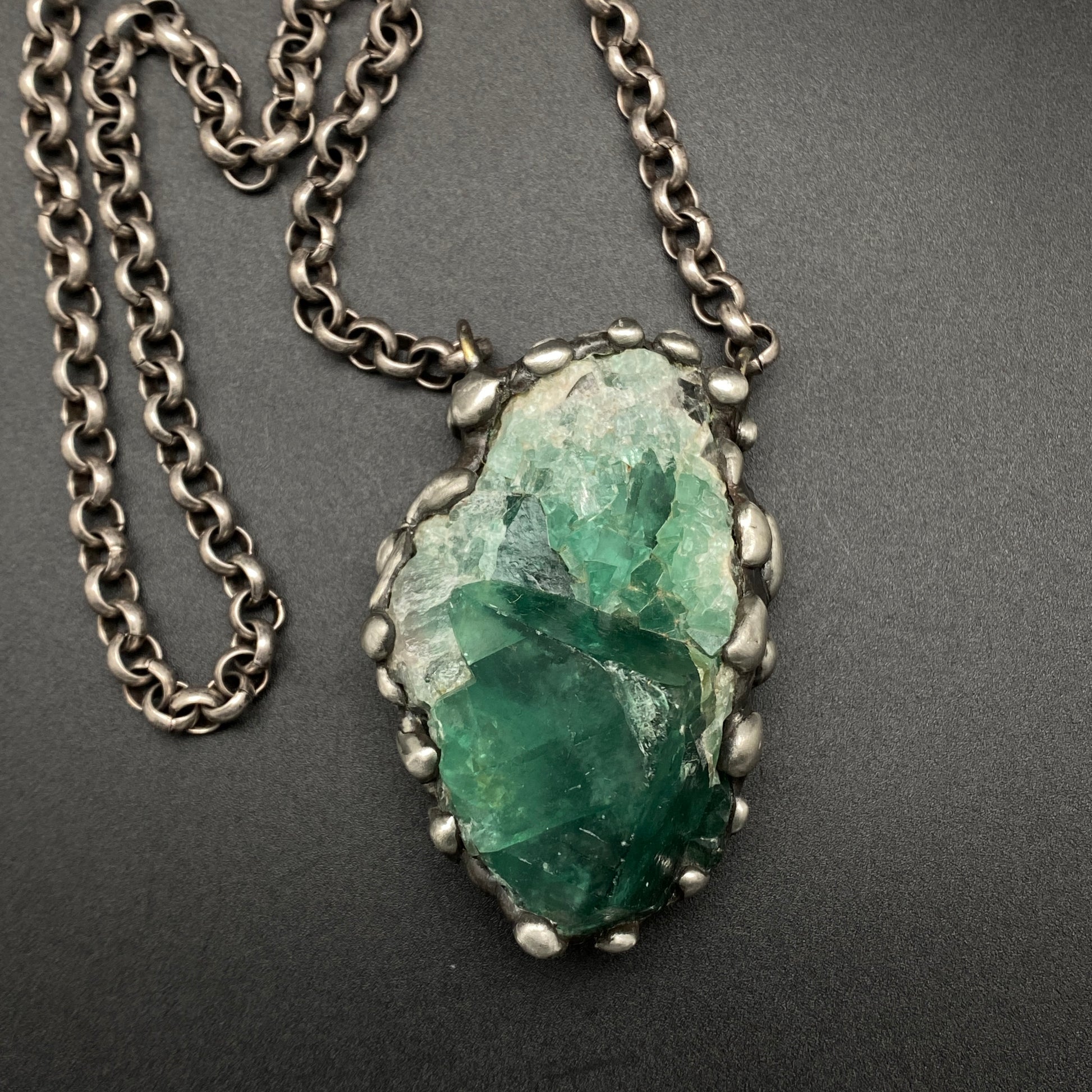 Awesome big chunky jewel tone green Fluorite cluster. UV sensitive, turns darker in sunlight! Soldered with my signature technique. Oxidized and sealed on heavy gauge silver plated rolo chain with a lobster clasp. *This piece is a bit heavy, please be aware:) Crystal is 2.75" x 1.75"