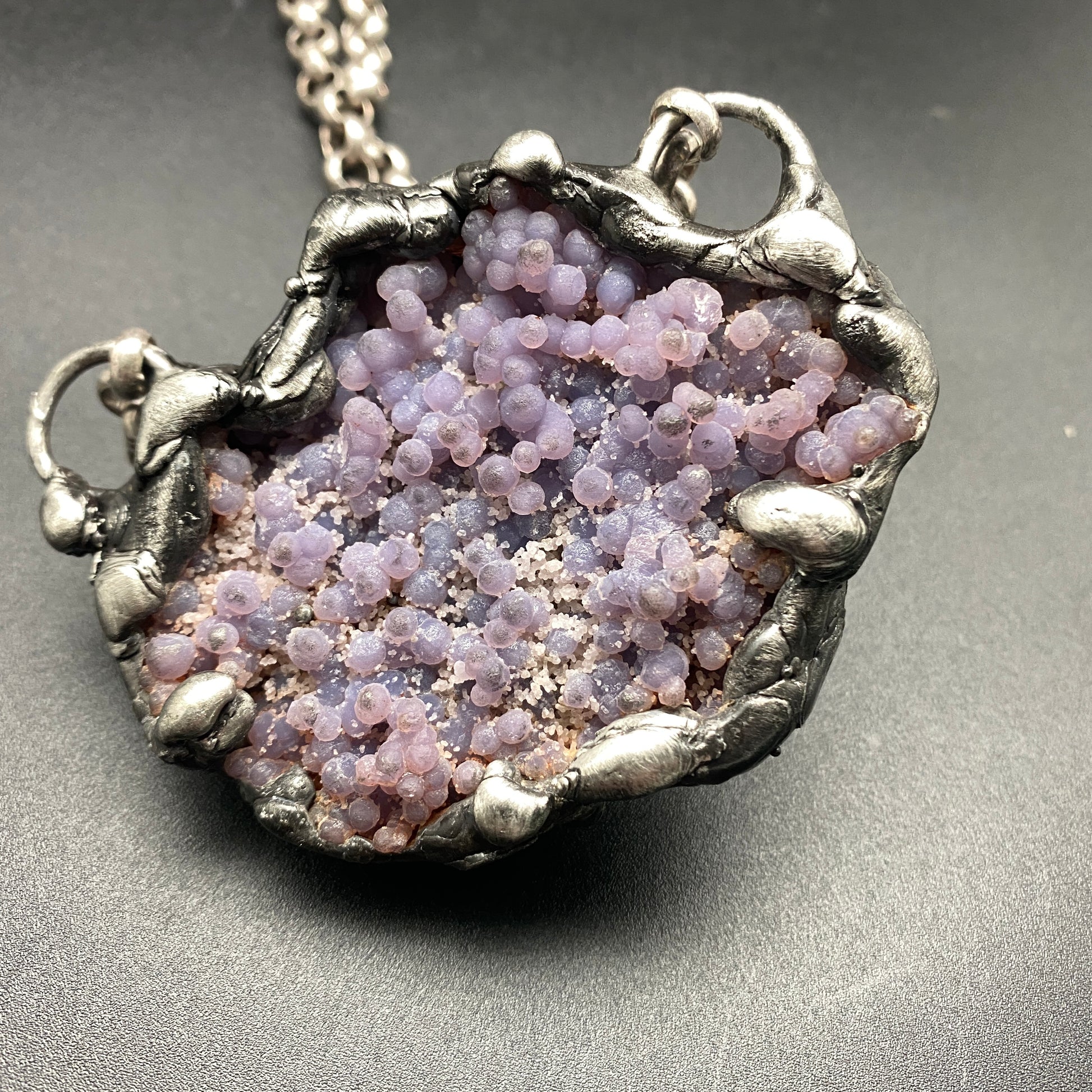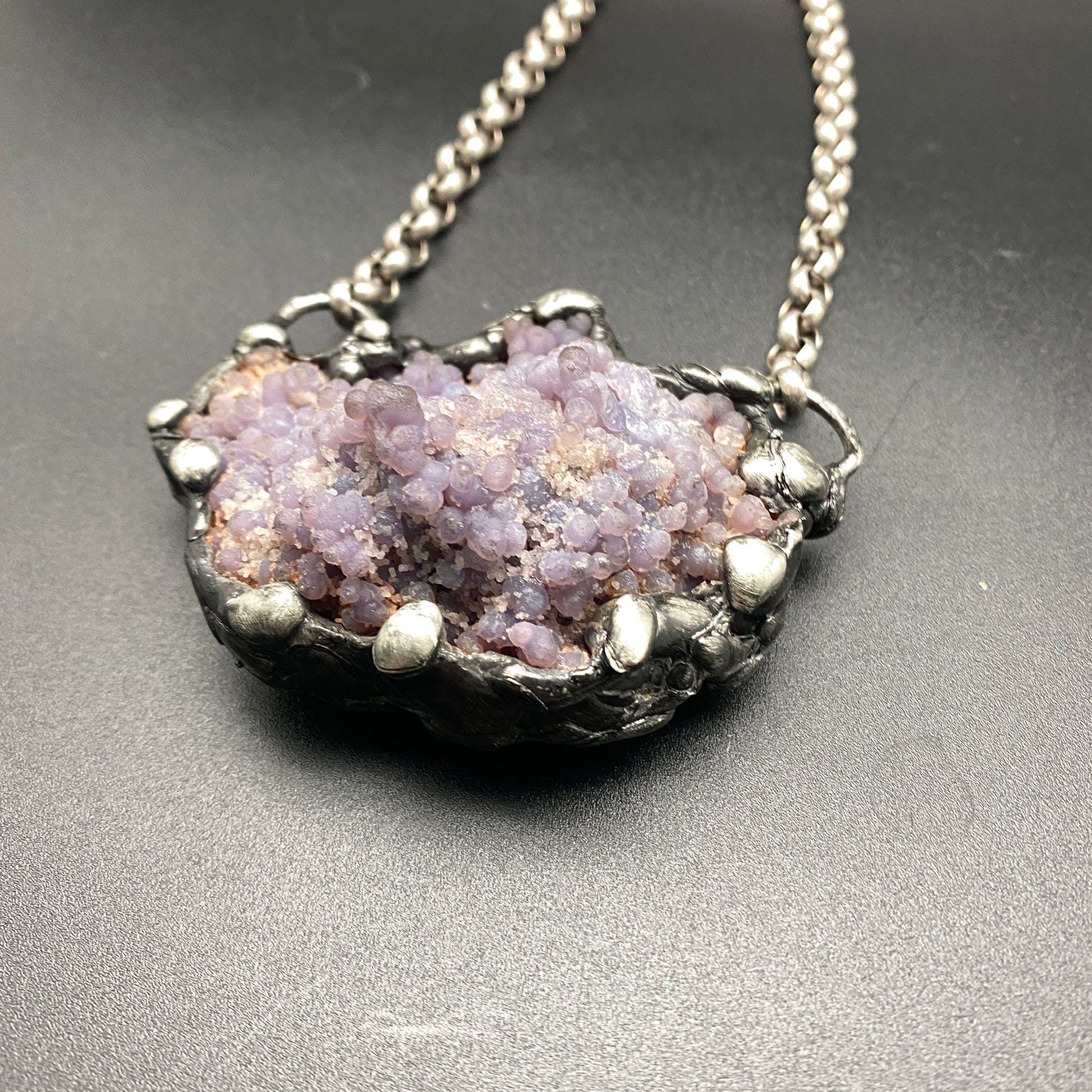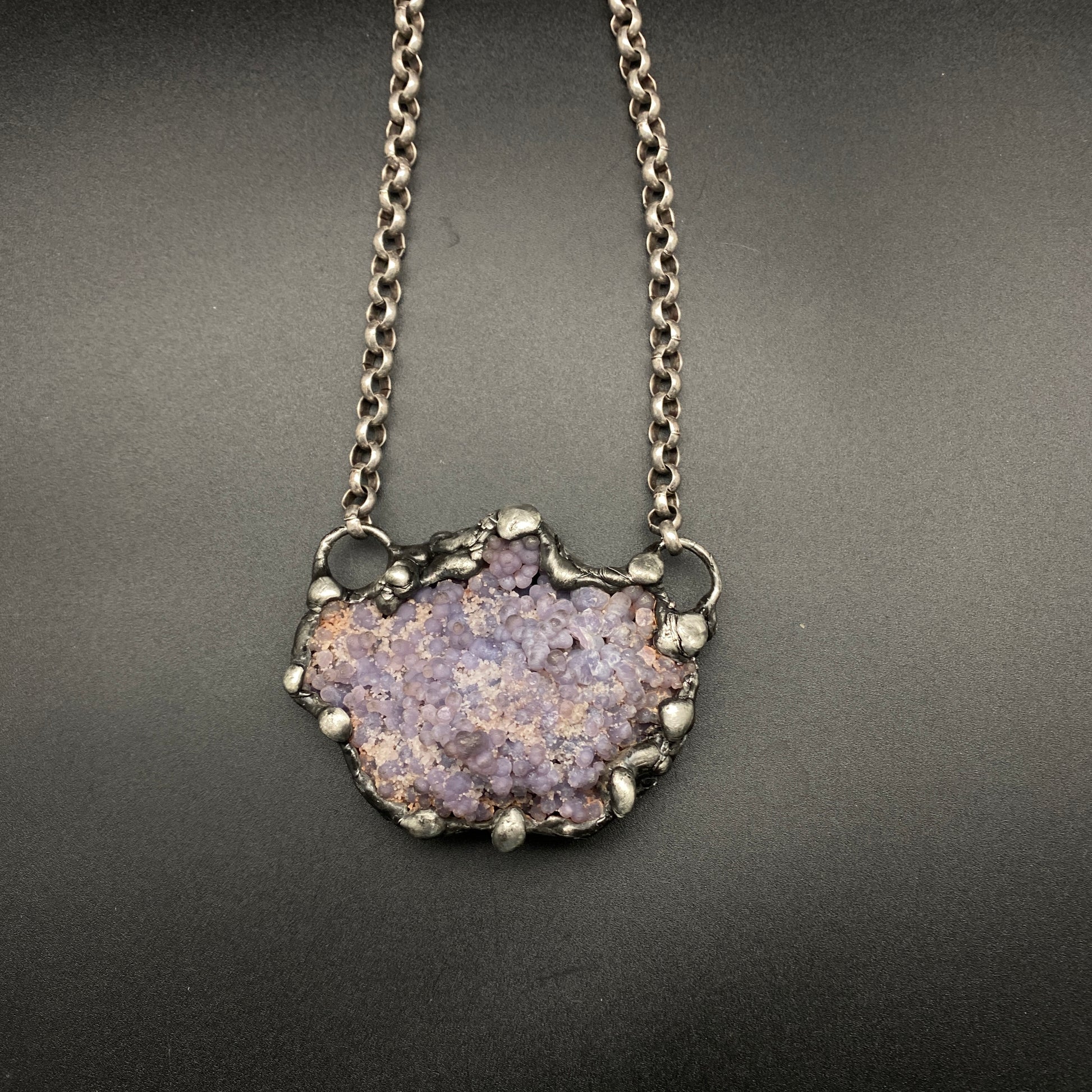 A funky grape agate cluster necklace. Soldered and oxidized with my signature technique. Photos show both sides of the stone, the piece is reversible on a heavy gauge silver plated rolo chain. 3" x 2"