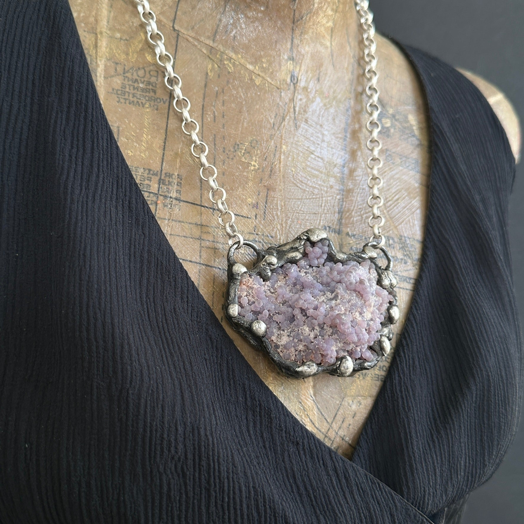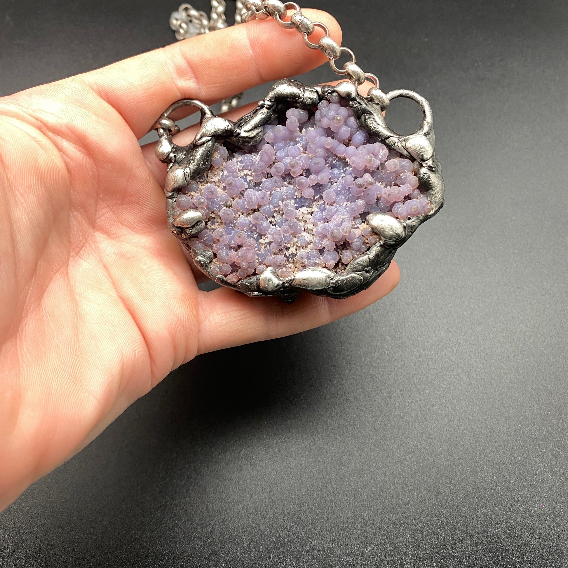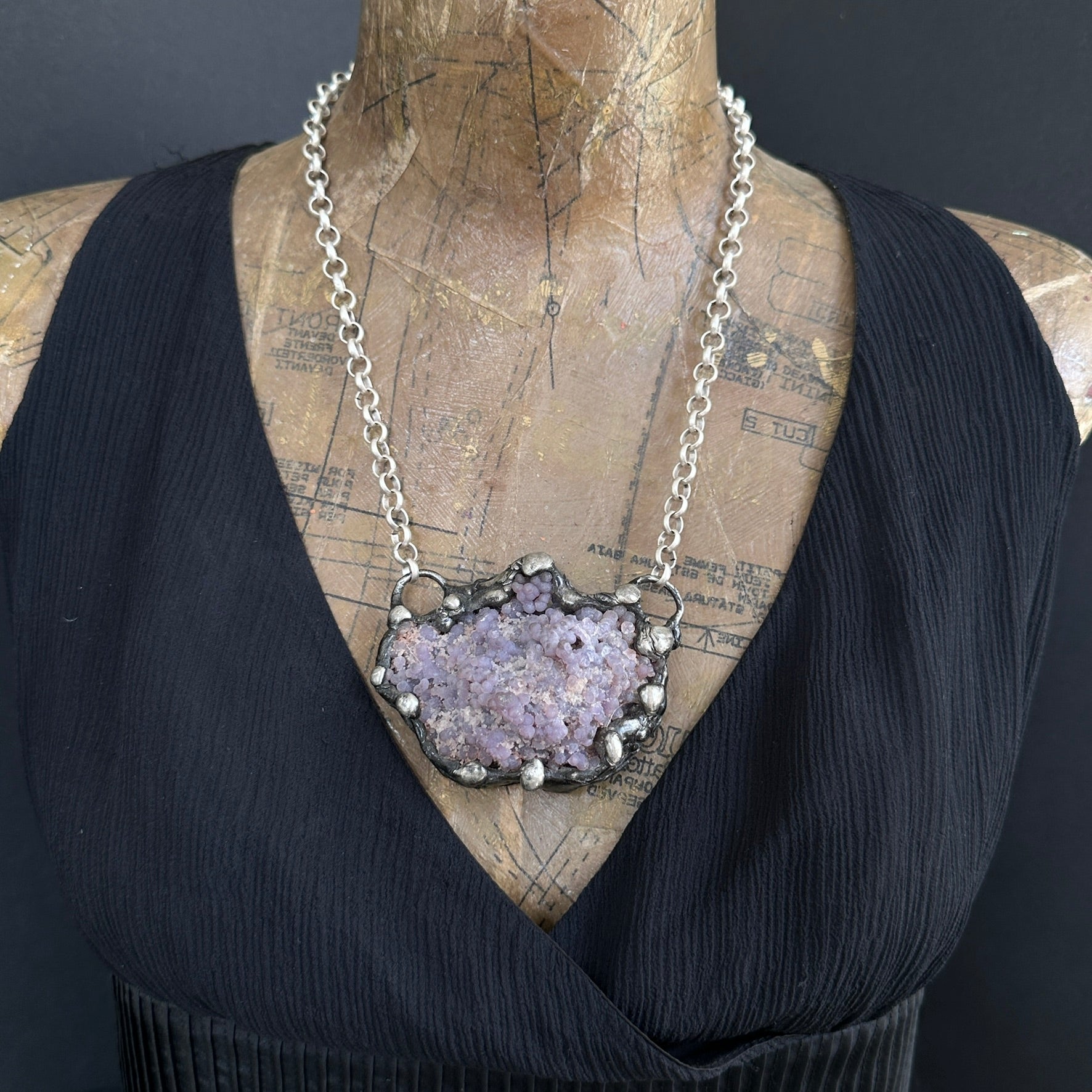 A funky grape agate cluster necklace. Soldered and oxidized with my signature technique. Photos show both sides of the stone, the piece is reversible on a heavy gauge silver plated rolo chain. 3" x 2"