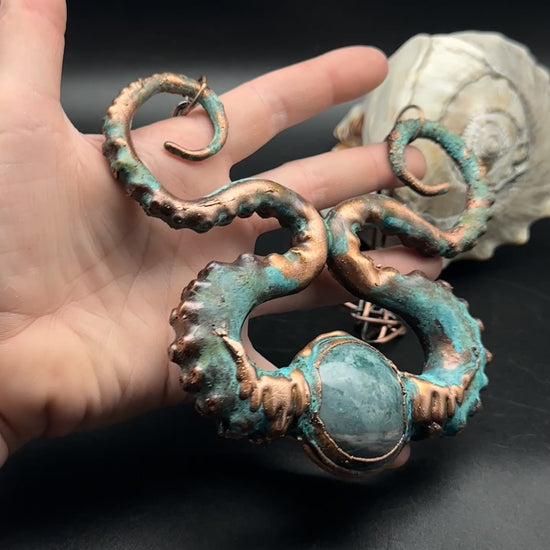Emerge from the depths with this powerful Tentacle statement necklace, a large polished Jasper stone sits on the middle, copper electroformed, and oxidized with green patina. Substantial open copper plated chain. Large, but lightweight and reversible.