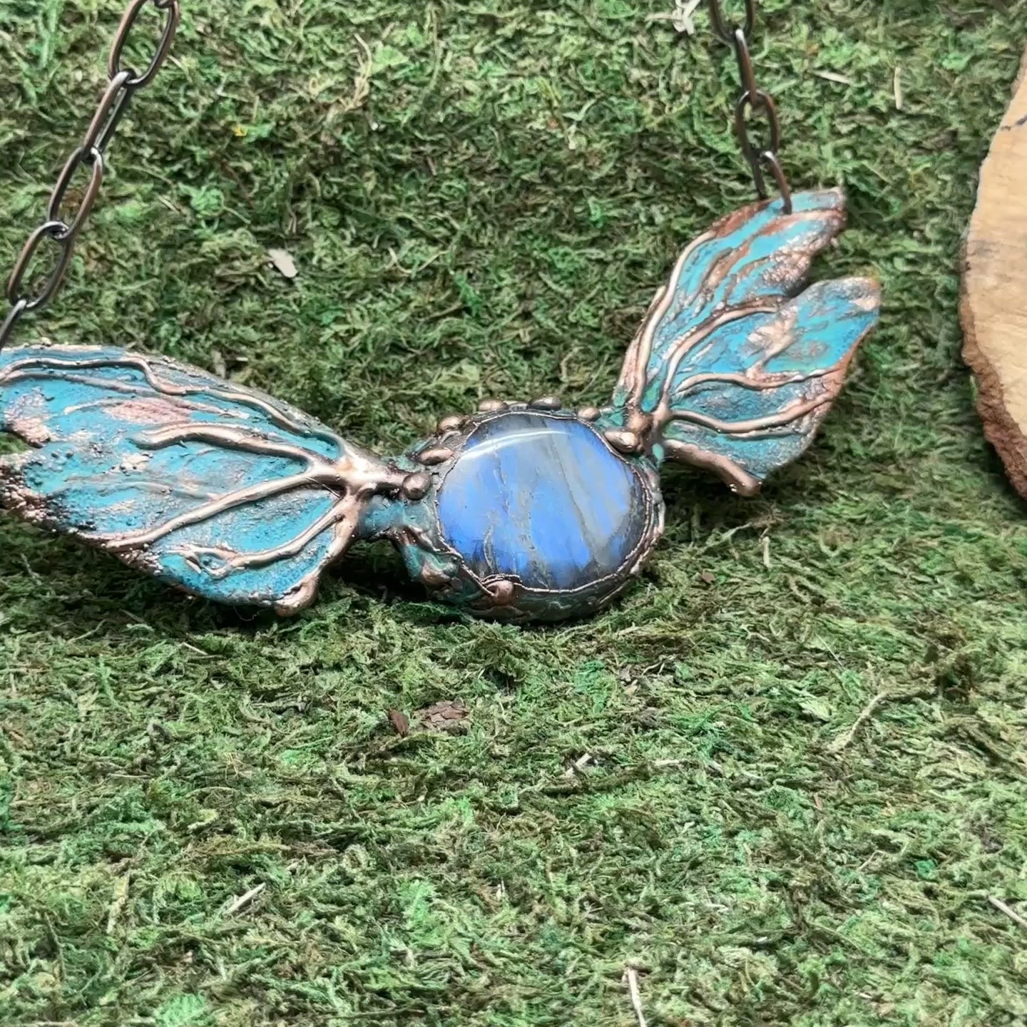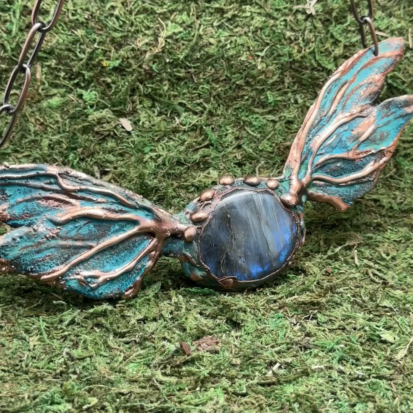 Take flight with this magical statement necklace. A large polished labradorite stone sits in the center of textured butterfly wings, copper electroformed, and oxidized with blue-green patina. Substantial open copper plated chain.