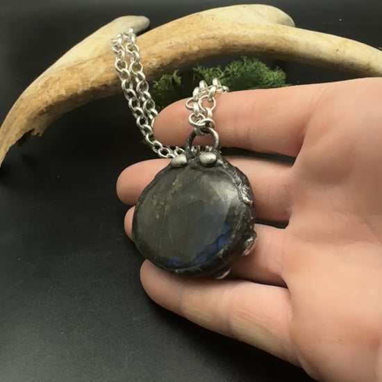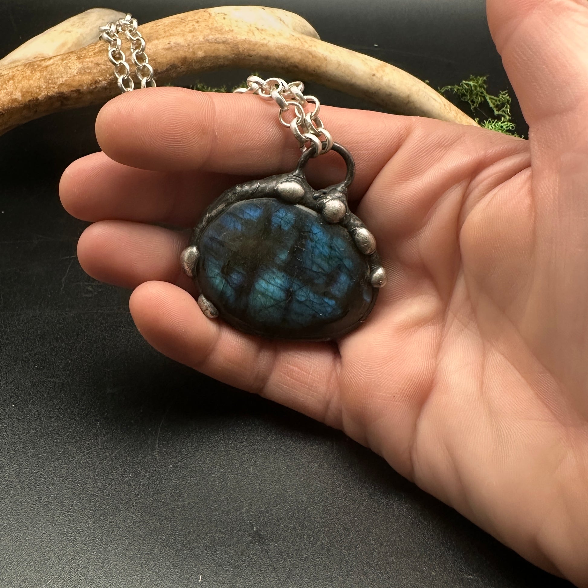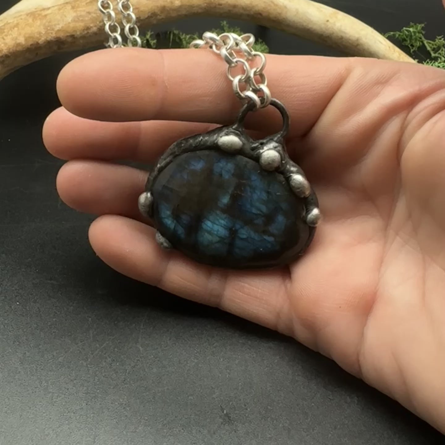Dark & moody, polished labradorite necklace. Stone is open in the back to make contact with the skin when worn. Soldered with my signature technique. Oxidized and sealed on antiqued silver plated chain.