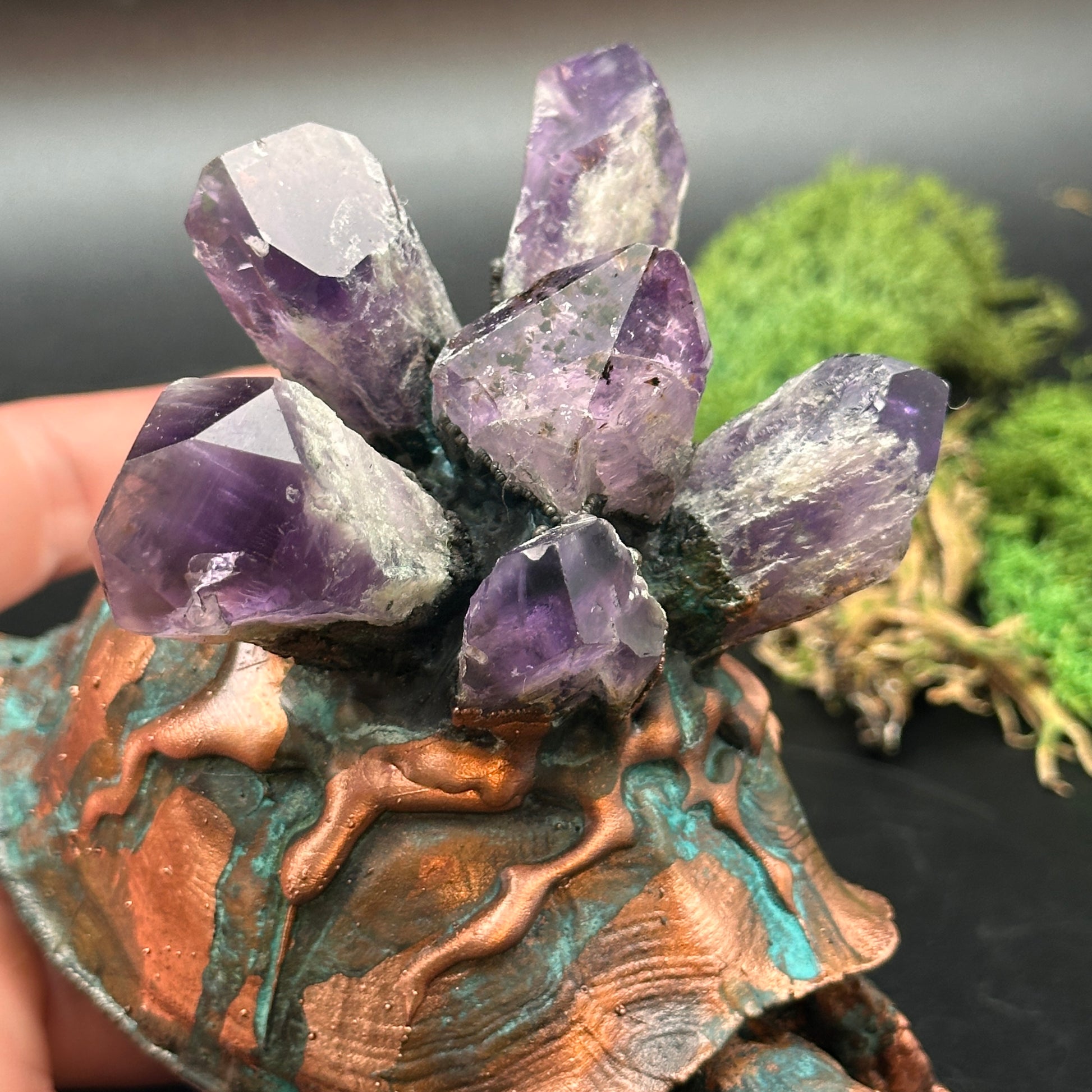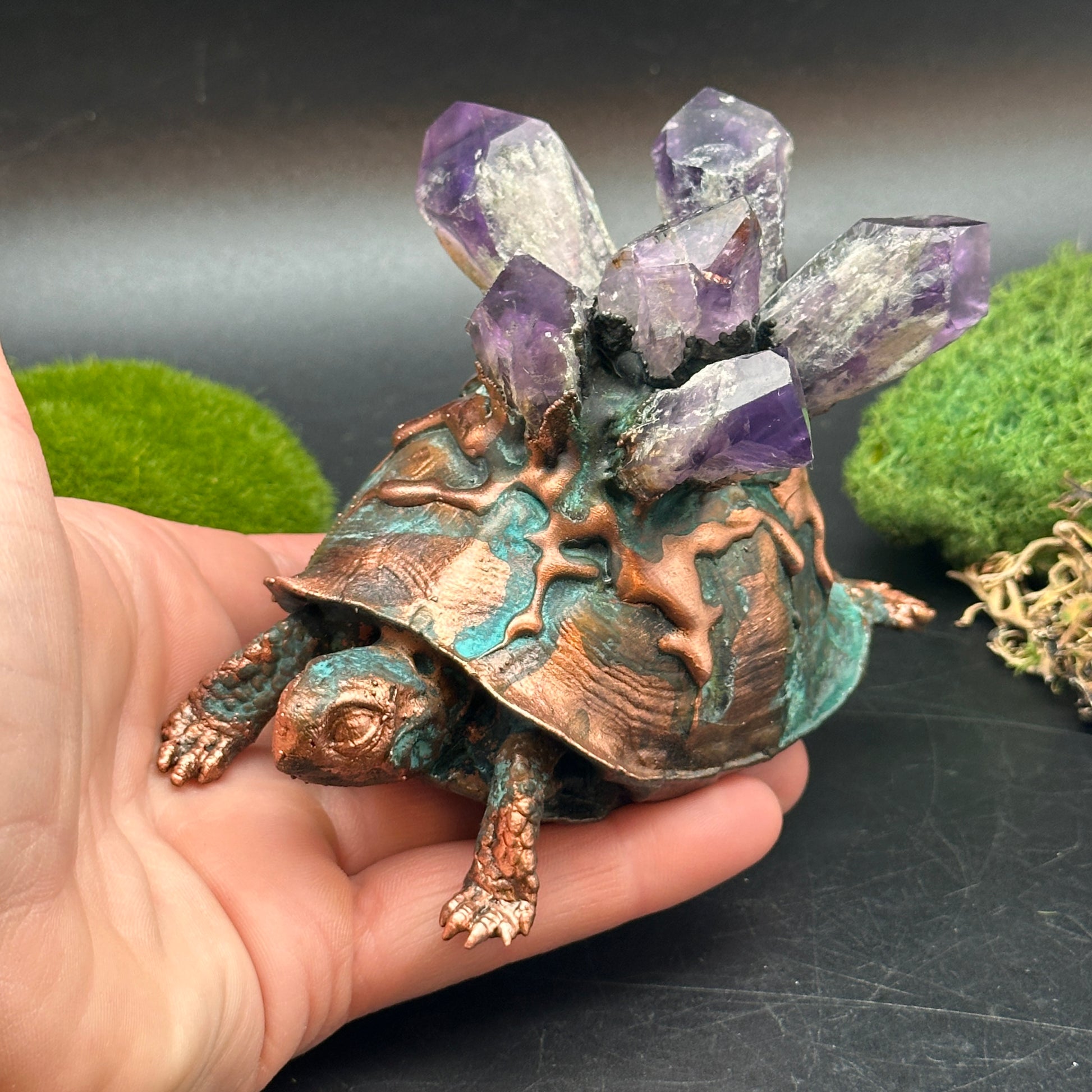 Elemental turtle of one of the many Verge Basins. Copper electroformed with patina and 6 large amethyst crystals sprouting from it's shell.