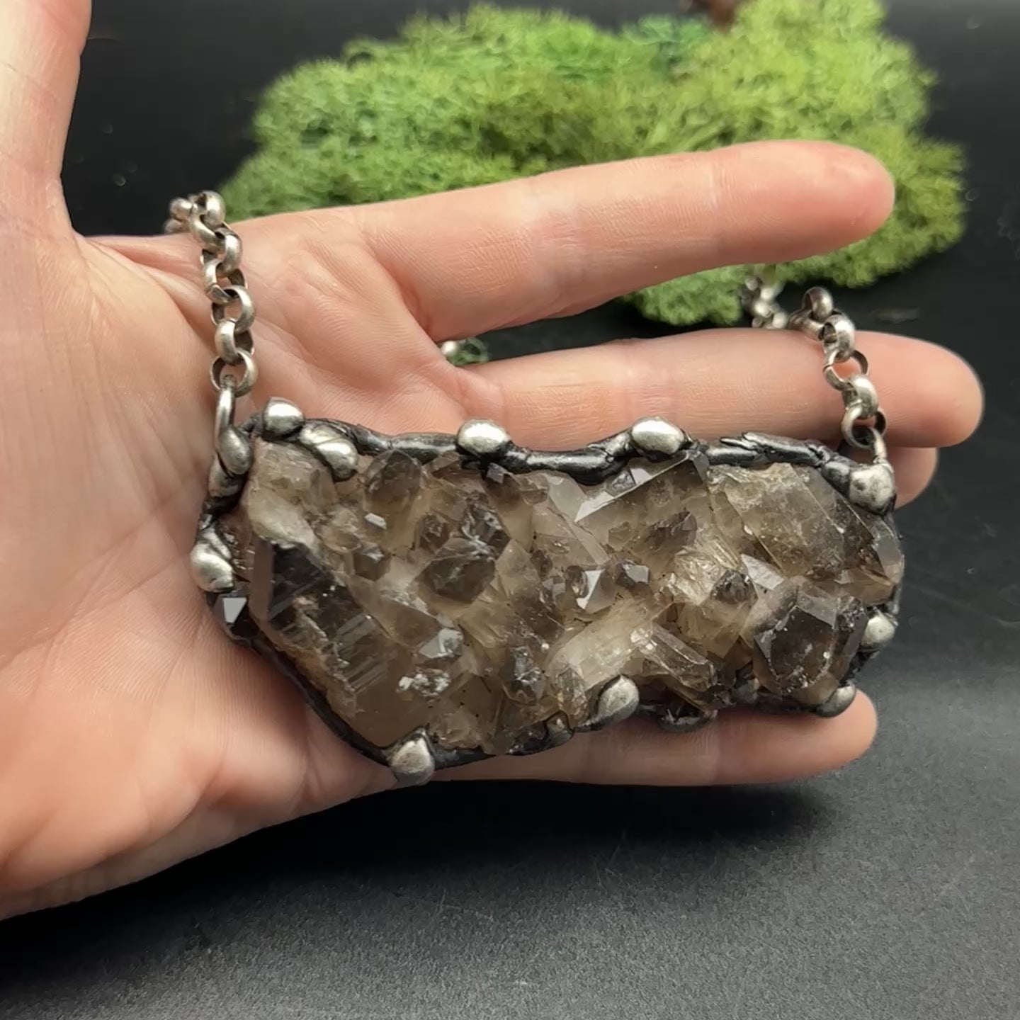 A bold and earthy piece, this necklace showcases a stunning cluster of raw smoky quartz crystals, set in my signature metalwork technique. The rich, smoky hues of the quartz catch the light beautifully, offering a mysterious and grounding energy. The organic, unpolished texture of the stones contrasts perfectly with the sleek, silver-plated chain, creating a wearable art piece that’s as unique as you are. This necklace brings raw elegance and a touch of the natural world to any outfit, making it an unforgettable statement piece for those who love the beauty of untamed crystals.