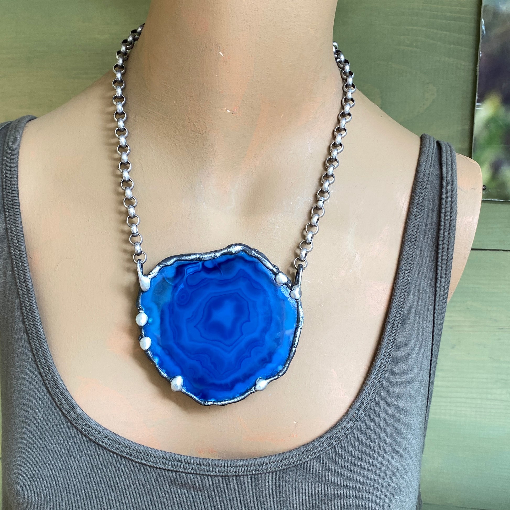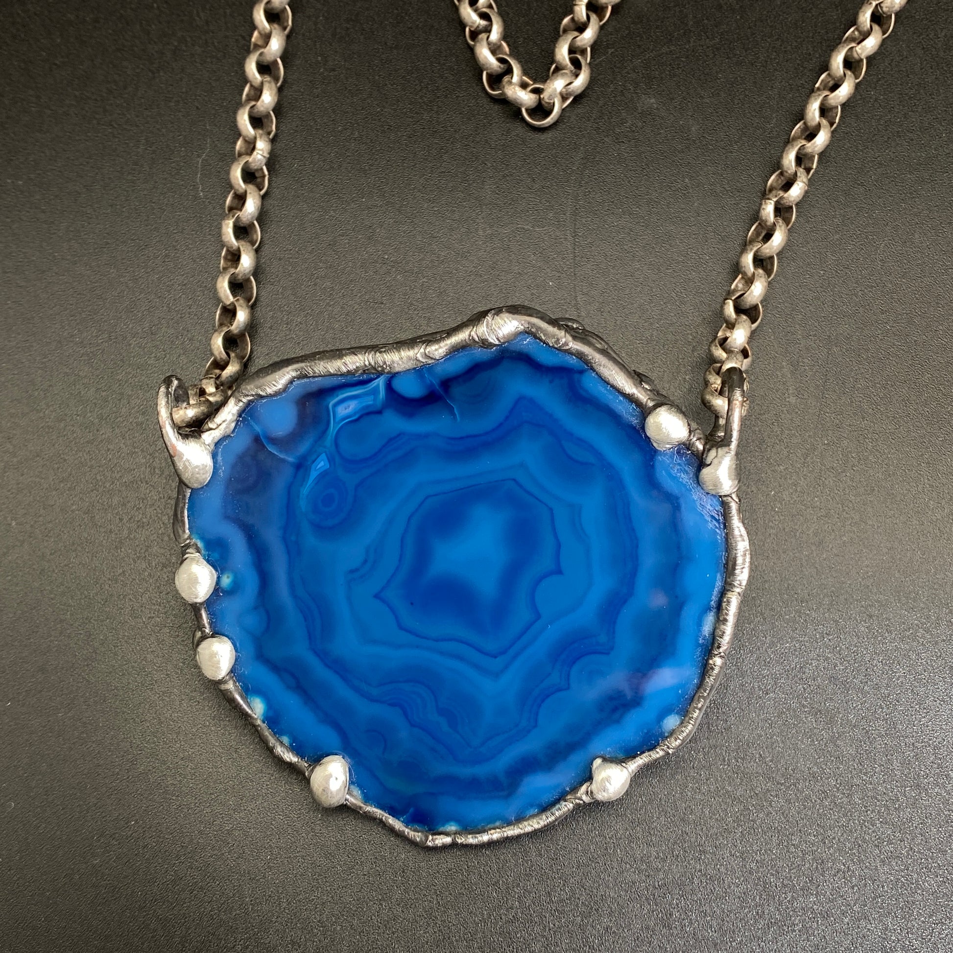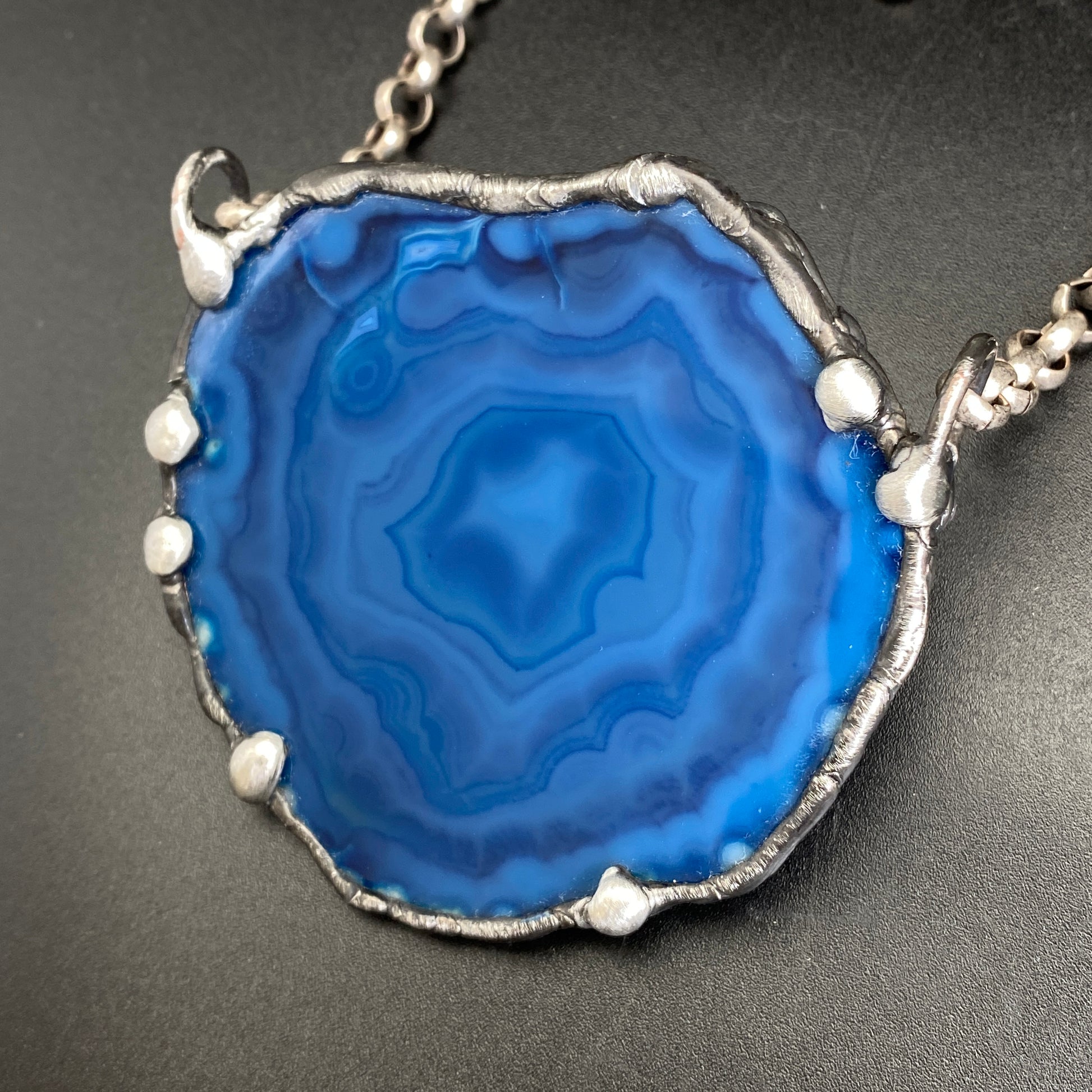 Beautiful blue geode slice, wrapped, soldered and oxidized. Soldered, oxidized and polished.
