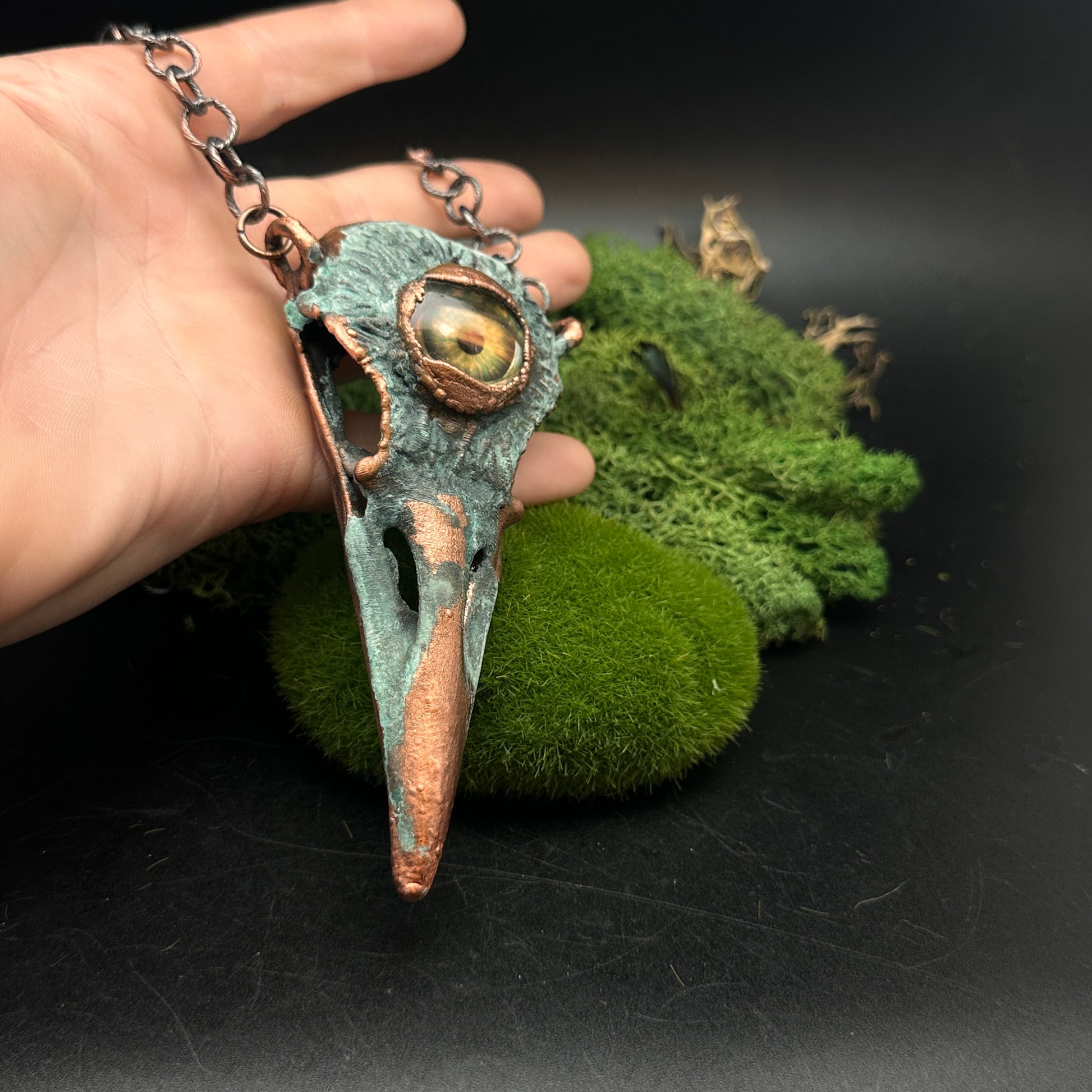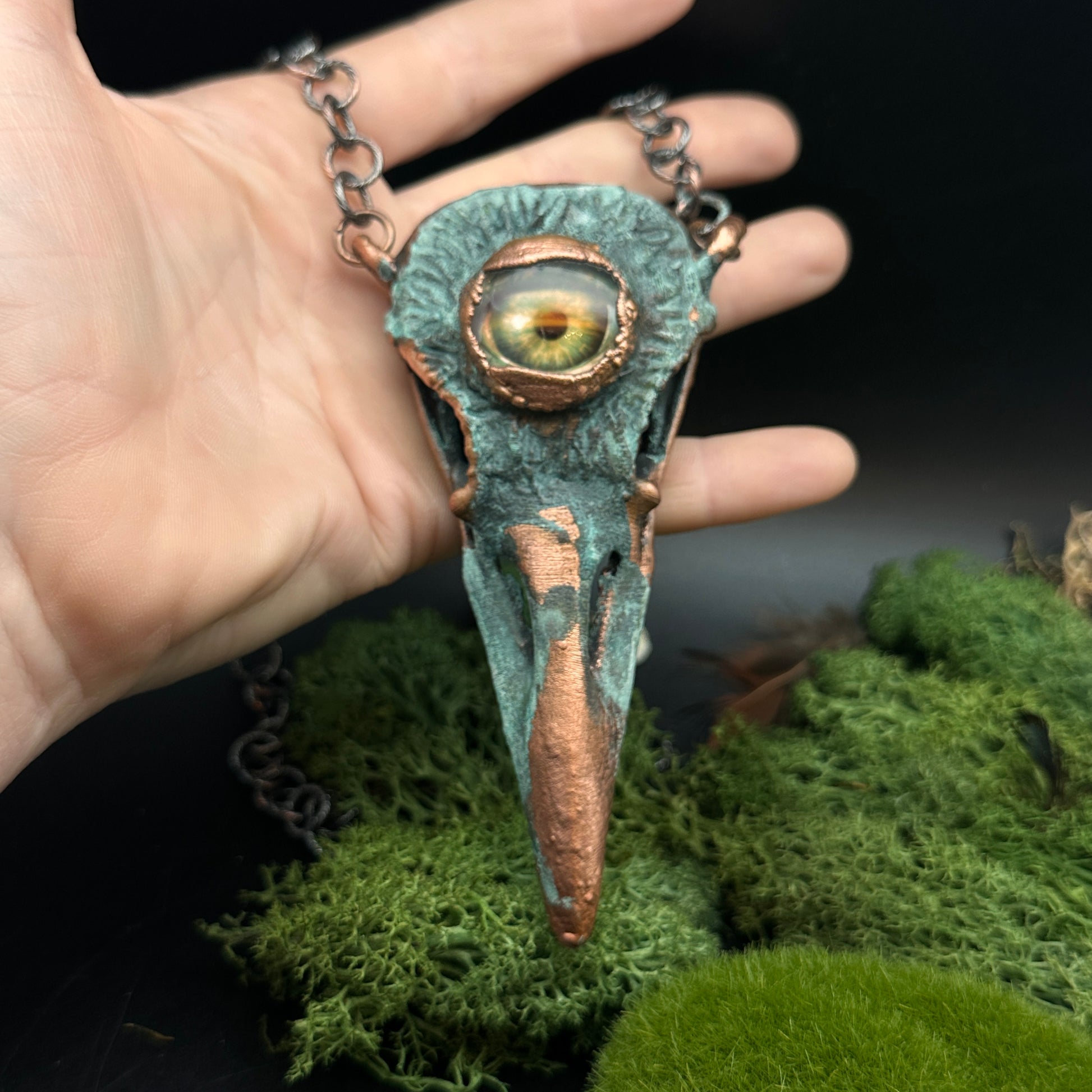 With its piercing eye set in a rich copper skull, this necklace embodies a gothic, otherworldly elegance. The textured patina adds an ancient, mysterious feel, ideal for the unique soul. Raven skull with eye, copper electroformed, oxidized, and polished. On sturdy, lightweight, copper plated chain.