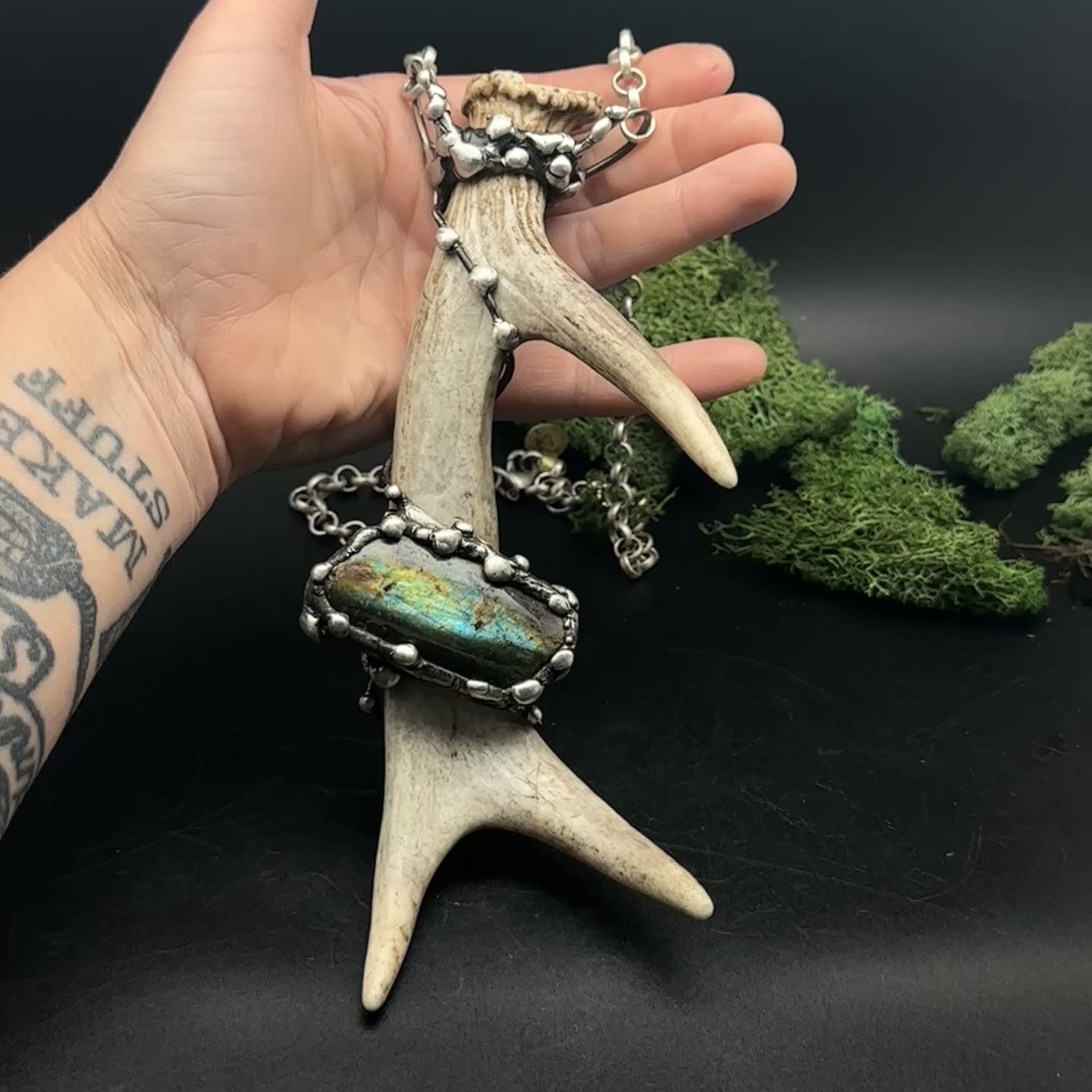 This badass statement piece is made from a vertically set deer antler and a large chunk of flashy labradorite. A different take on my horizontal antler pieces. A chunky, adjustable, silver plated chain provides versatility. This necklace is an ideal statement piece for a range of looks, from casual to cosplay, it captures the spirit of individuality and creativity. Embrace the wild beauty of nature with this wild piece.