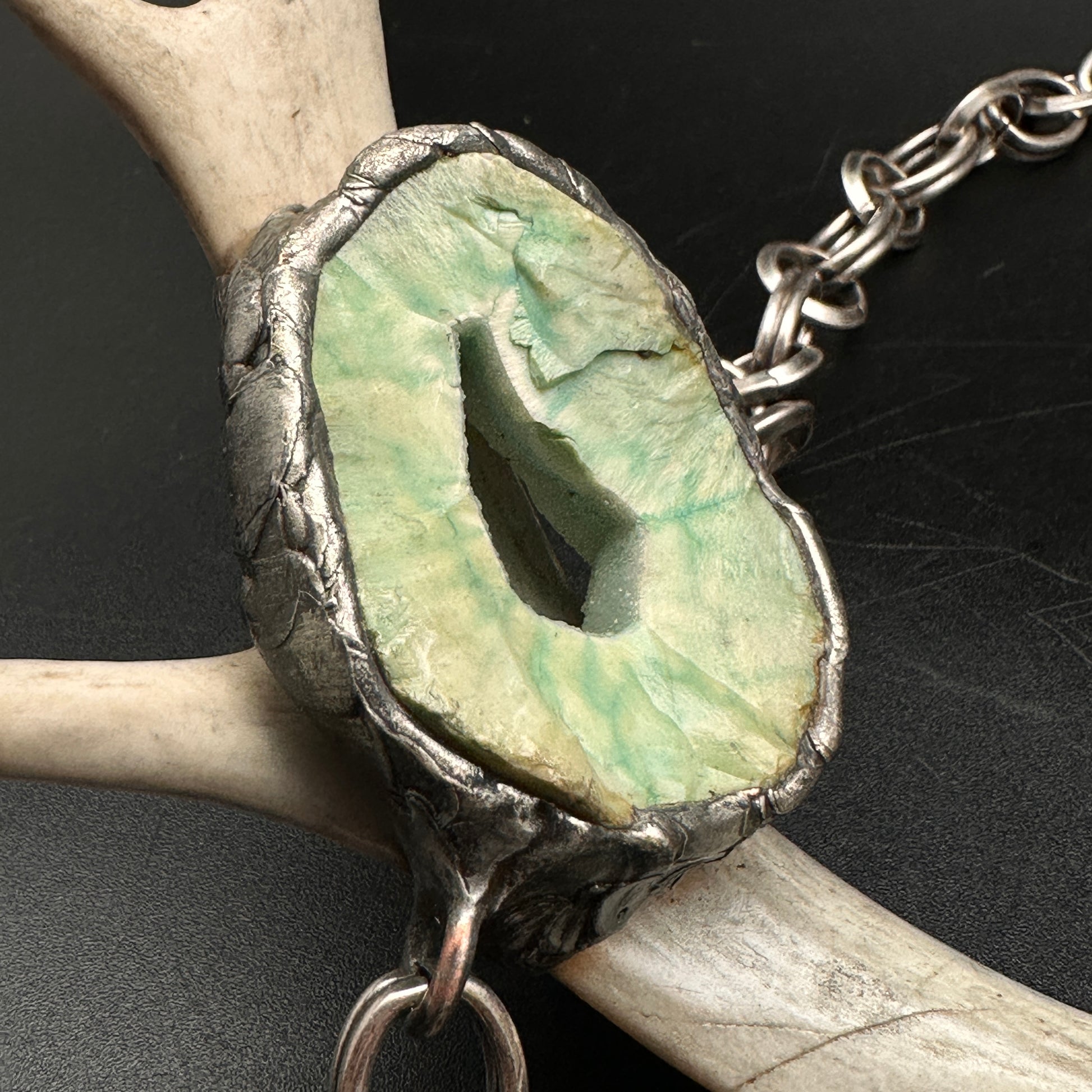 This badass statement piece is made from a real deer antler, a huge grape agate specimen, and a green agate slice. This one-of-a-kind piece is both earthy and artsy-sophisticated. A handmade, chunky, adjustable silver plated chain provides versatility, making this necklace an ideal statement piece for a range of looks, from casual to formal. This bold necklace is designed to be a conversation starter. Whether worn as an everyday piece or to elevate a special outfit, it captures the spirit of individuality and creativity. Embrace the wild beauty of nature with this unique piece.