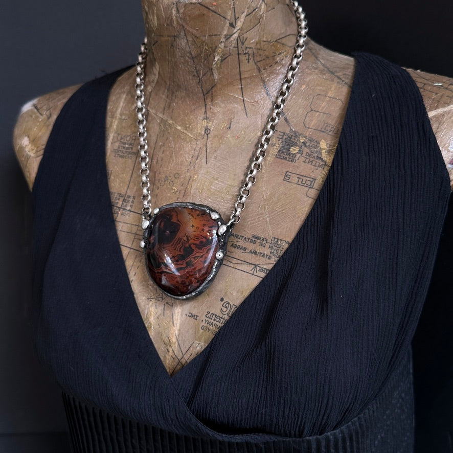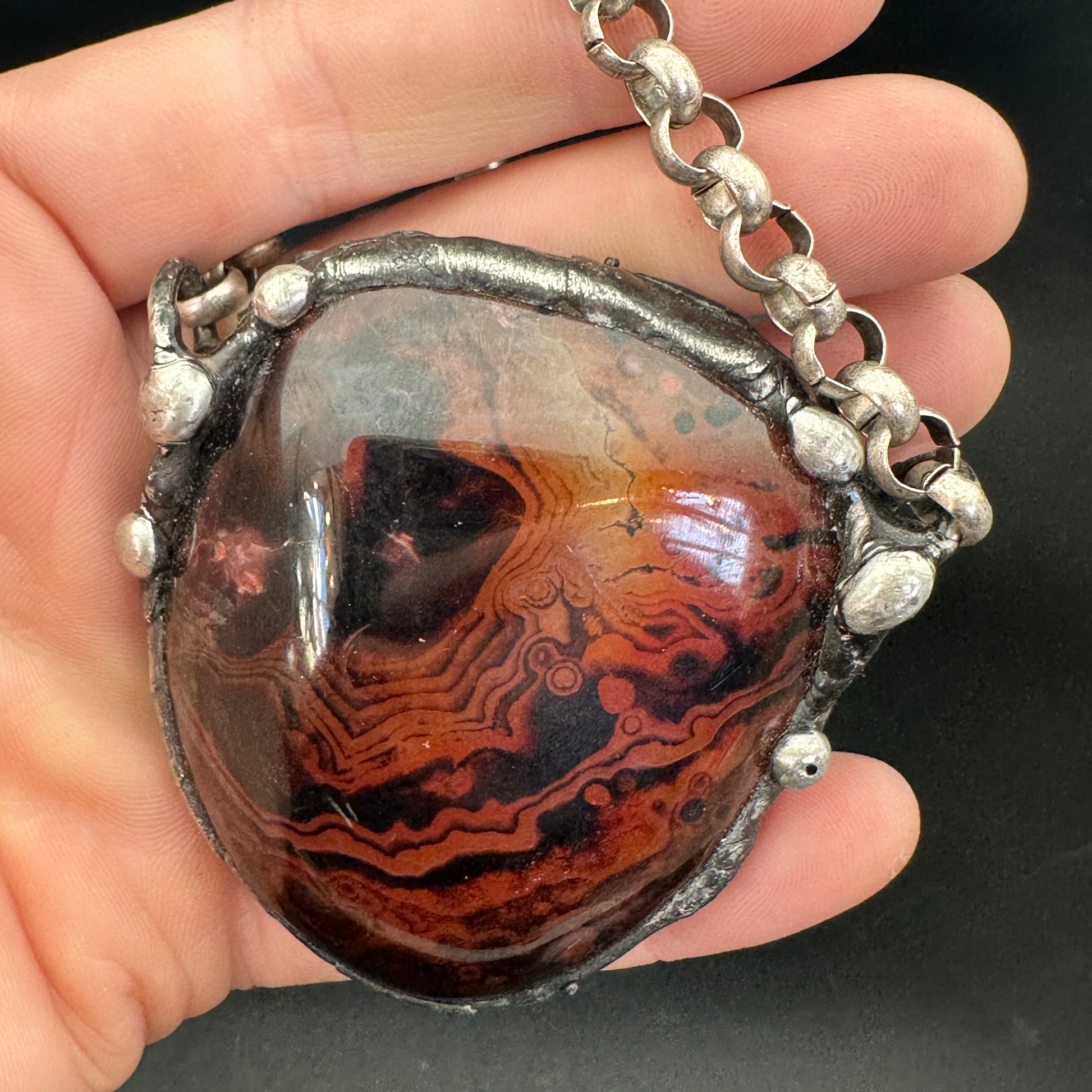 Experience the mesmerizing patterns of nature with this polished banded sardonyx necklace. The large, domed agate stone boasts magical swirls of earthy reds and browns, creating a one-of-a-kind statement piece. Hand-set in my signature technique, this reversible pendant captures the beauty of organic imperfection. With its bold presence and intricate banding, this necklace is perfect for those who appreciate natural elegance and striking design. Hung on a sturdy chain, it’s a powerful and grounding accessory for any occasion. Choose your chain length.