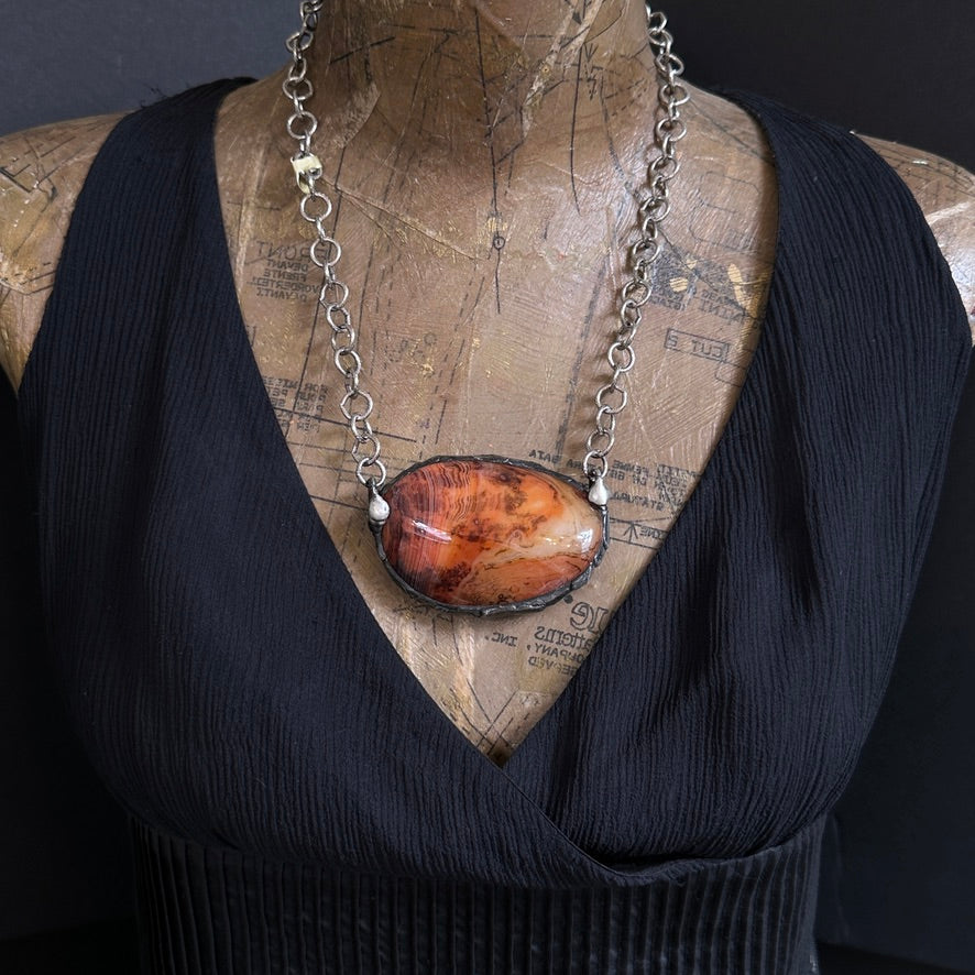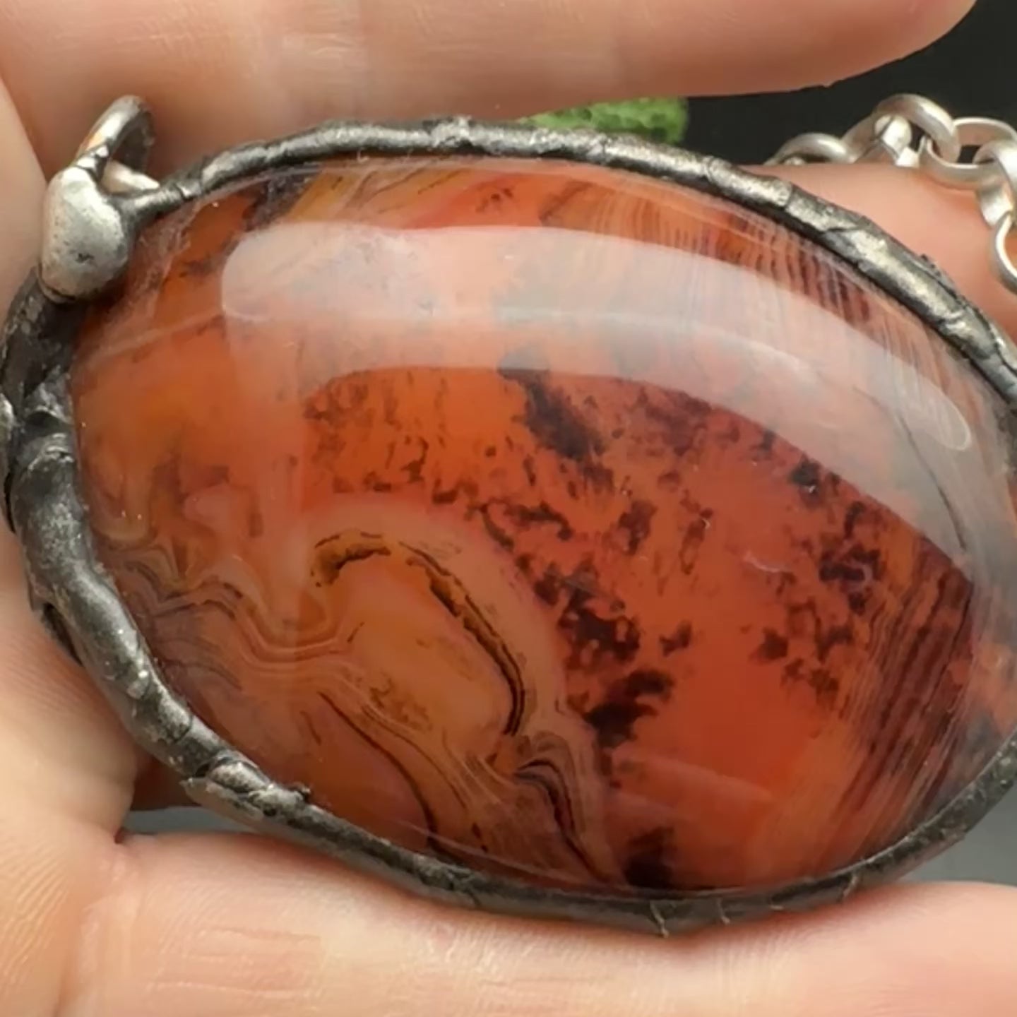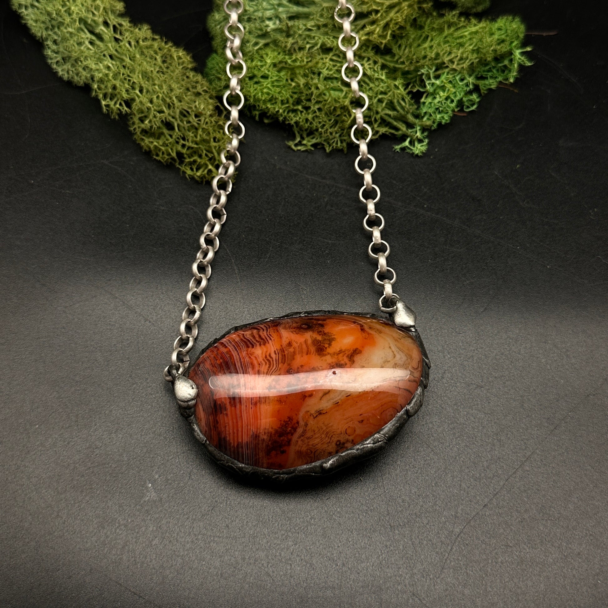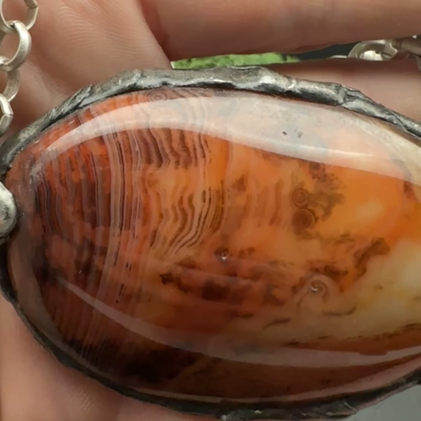 Experience the mesmerizing patterns of nature with this polished banded sardonyx necklace. The large, domed agate stone boasts magical swirls of earthy reds and browns, creating a one-of-a-kind statement piece. Hand-set in my signature technique, this reversible pendant captures the beauty of organic imperfection. With its bold presence and intricate banding, this necklace is perfect for those who appreciate natural elegance and striking design. Hung on a sturdy chain, it’s a powerful and grounding accessory for any occasion. Choose your chain length.