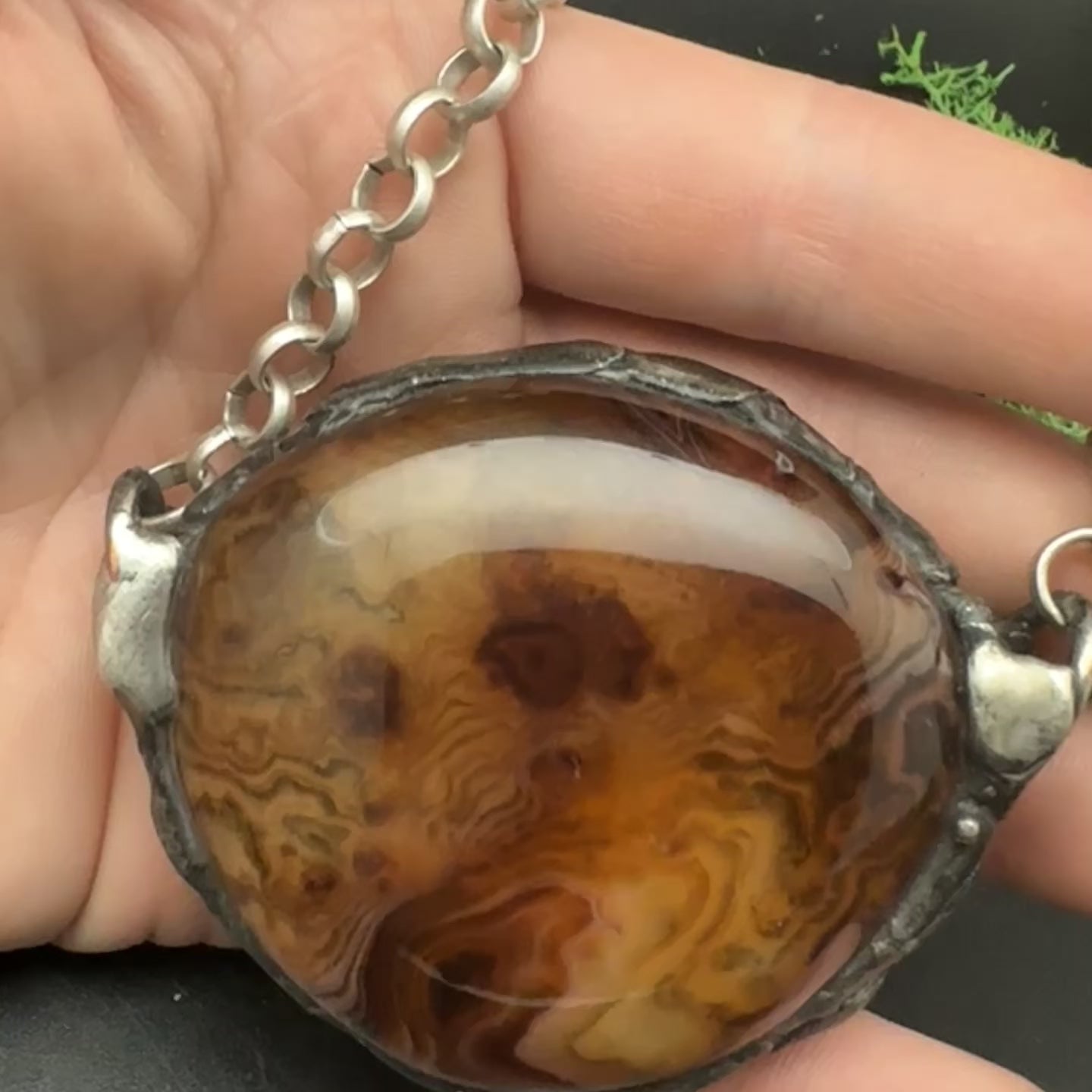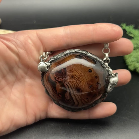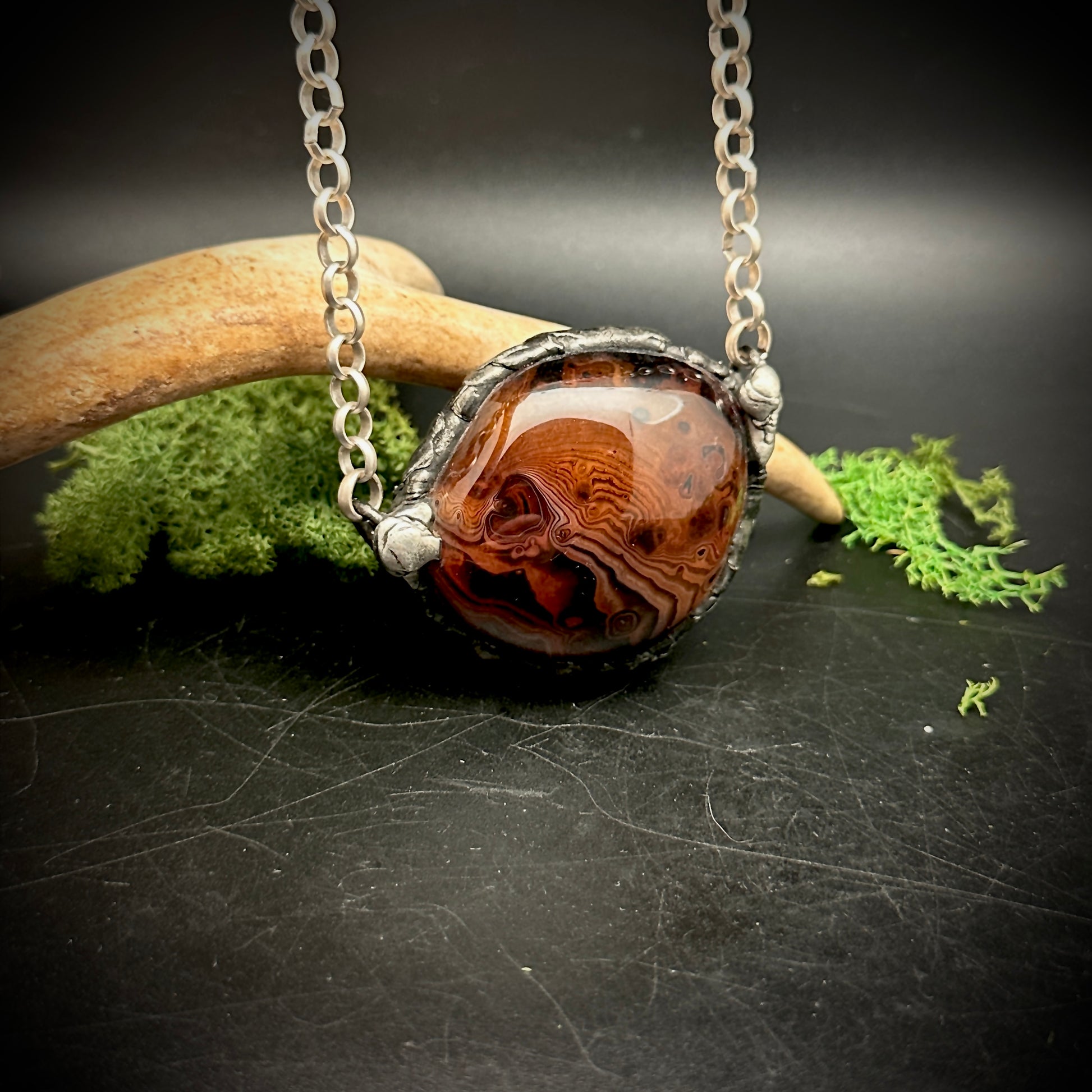 Experience the mesmerizing patterns of nature with this polished banded sardonyx necklace. The large, domed agate stone boasts magical swirls of earthy reds and browns, creating a one-of-a-kind statement piece. Hand-set in my signature technique, this reversible pendant captures the beauty of organic imperfection. With its bold presence and intricate banding, this necklace is perfect for those who appreciate natural elegance and striking design. Hung on a sturdy chain, it’s a powerful and grounding accessory for any occasion. Choose your chain length.