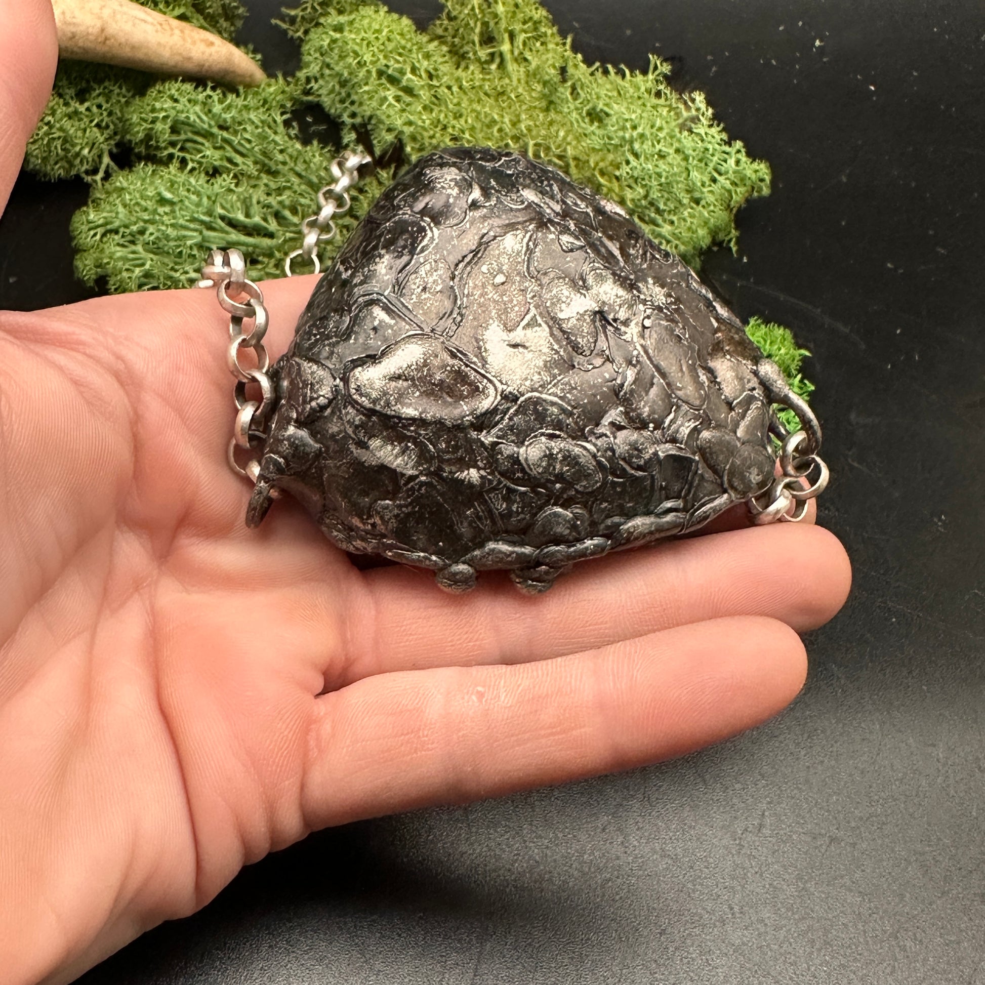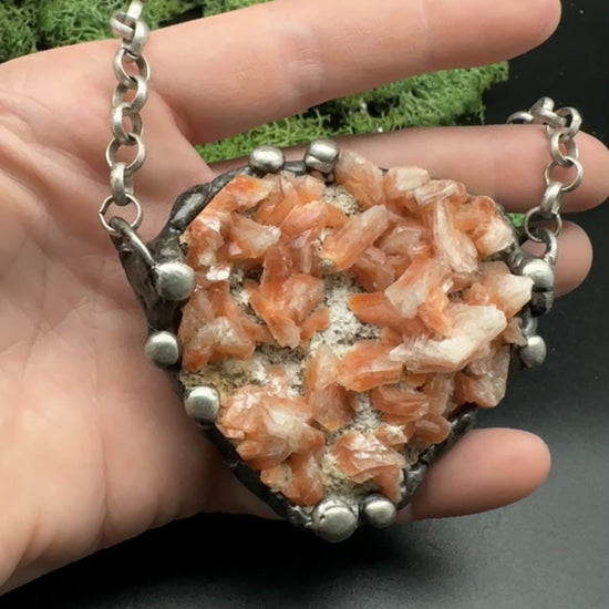 A gorgeous specimen of orange apophylite, soft, spiky creamcicle crystals. Soldered and oxidized with my signature technique. On heavy gauge silver plated chain.