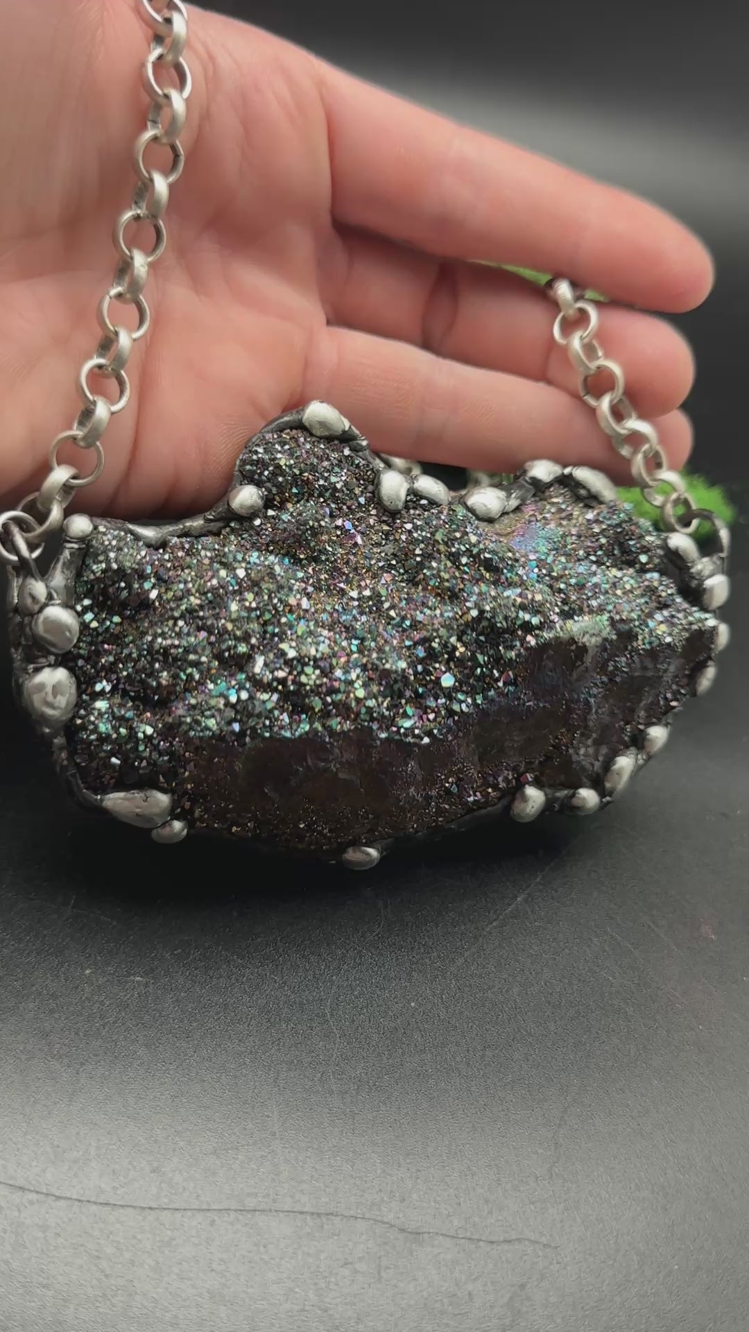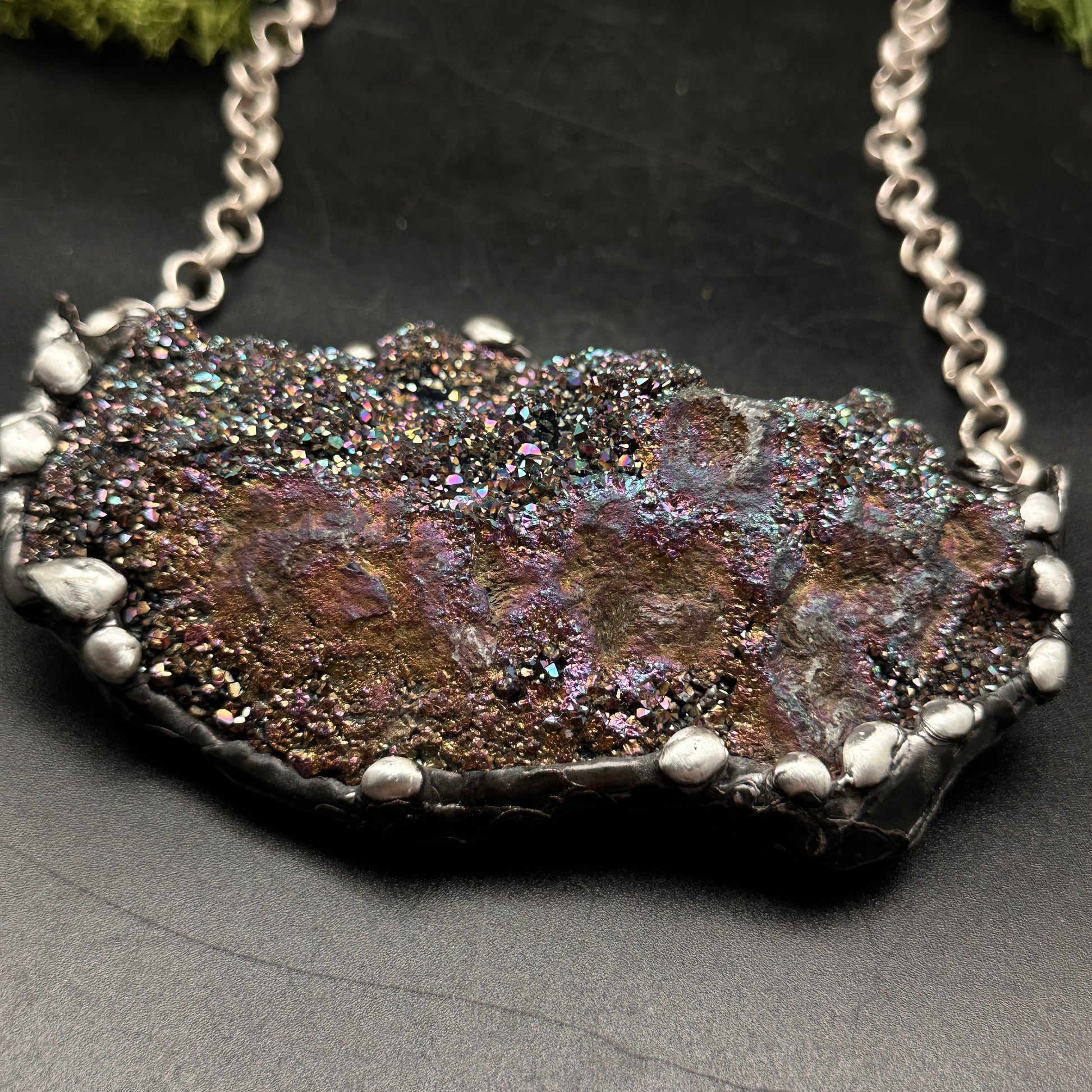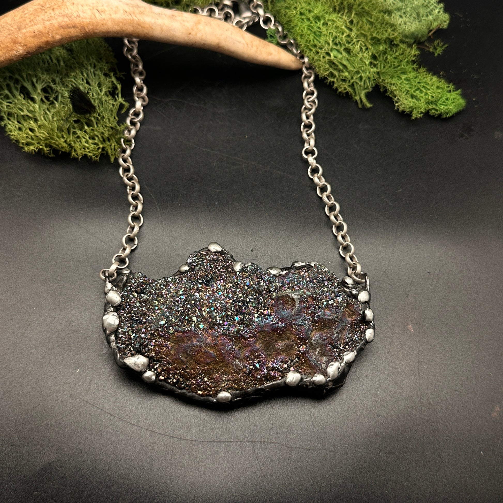 A huge sparkly unicorn quartz pendant featuring an anodized finish that shimmers with iridescent rainbow hues. Set with my signature, organic technique, this necklace is a true statement piece that captures light beautifully, making it ideal for those who love a touch of magic and bold colors.