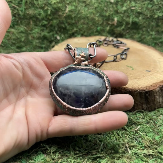 Chevron Amethyst orb, electroformed with a bezel of textured copper. Stone is open on both sides.