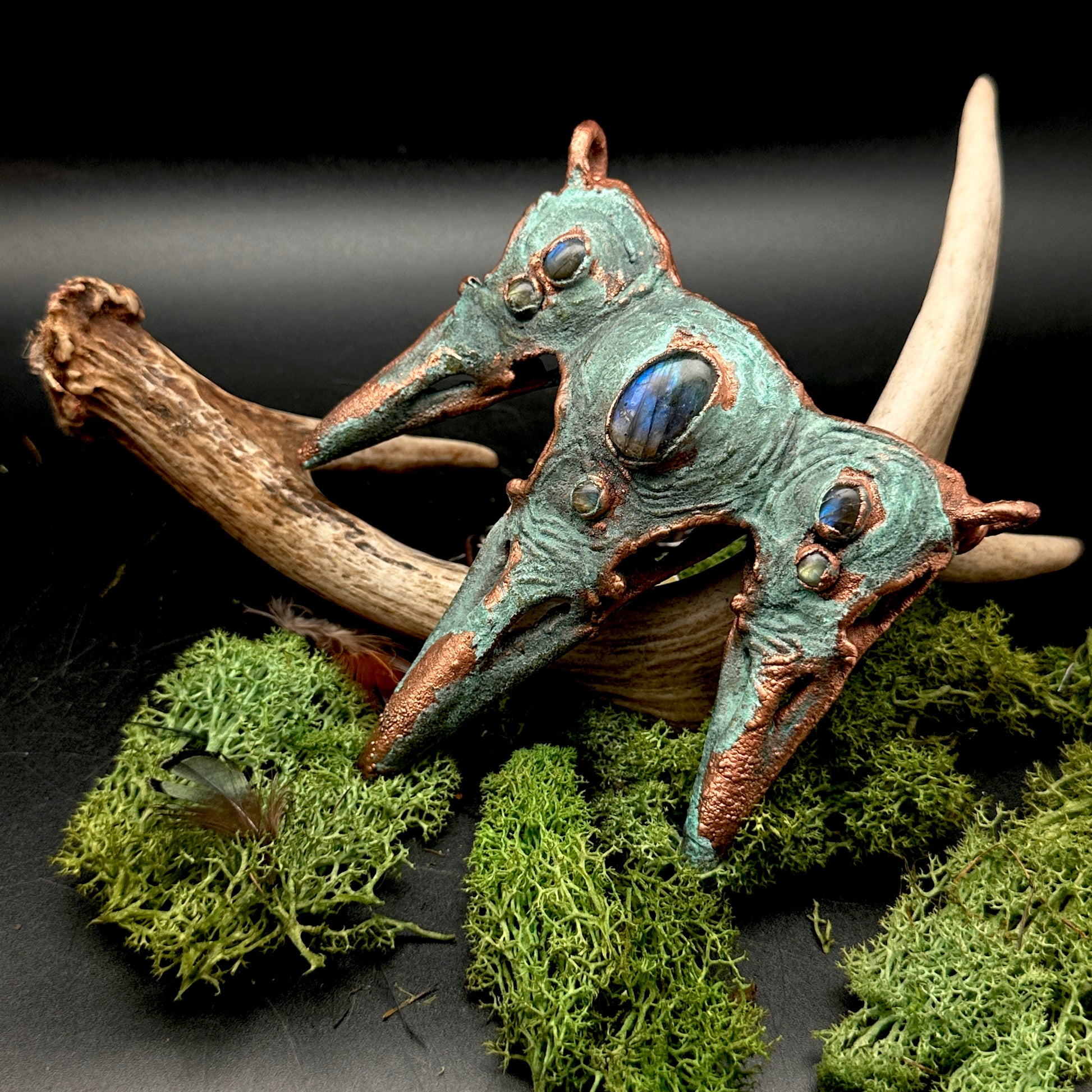 Custom made triple raven skull with labradorite, copper electroformed, and oxidized with green patina. Substantial open copper plated chain. Large but lightweight!