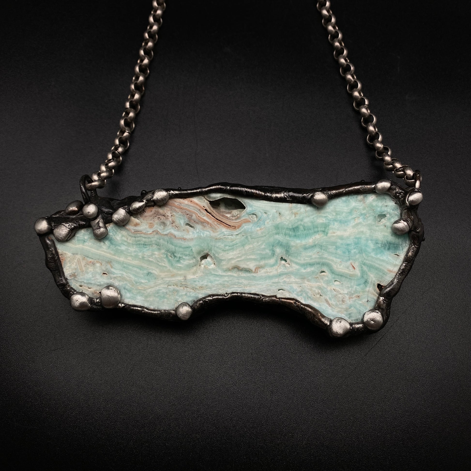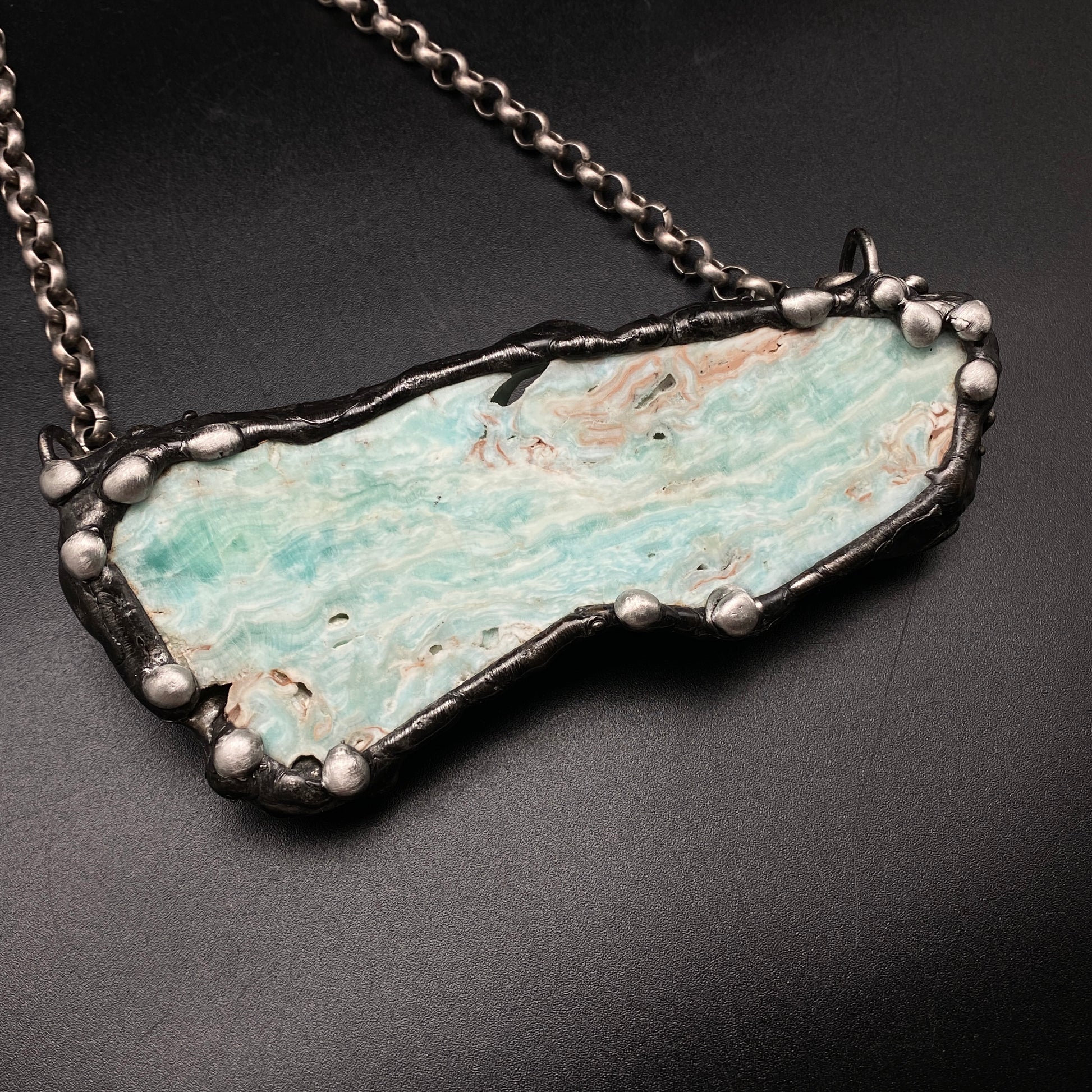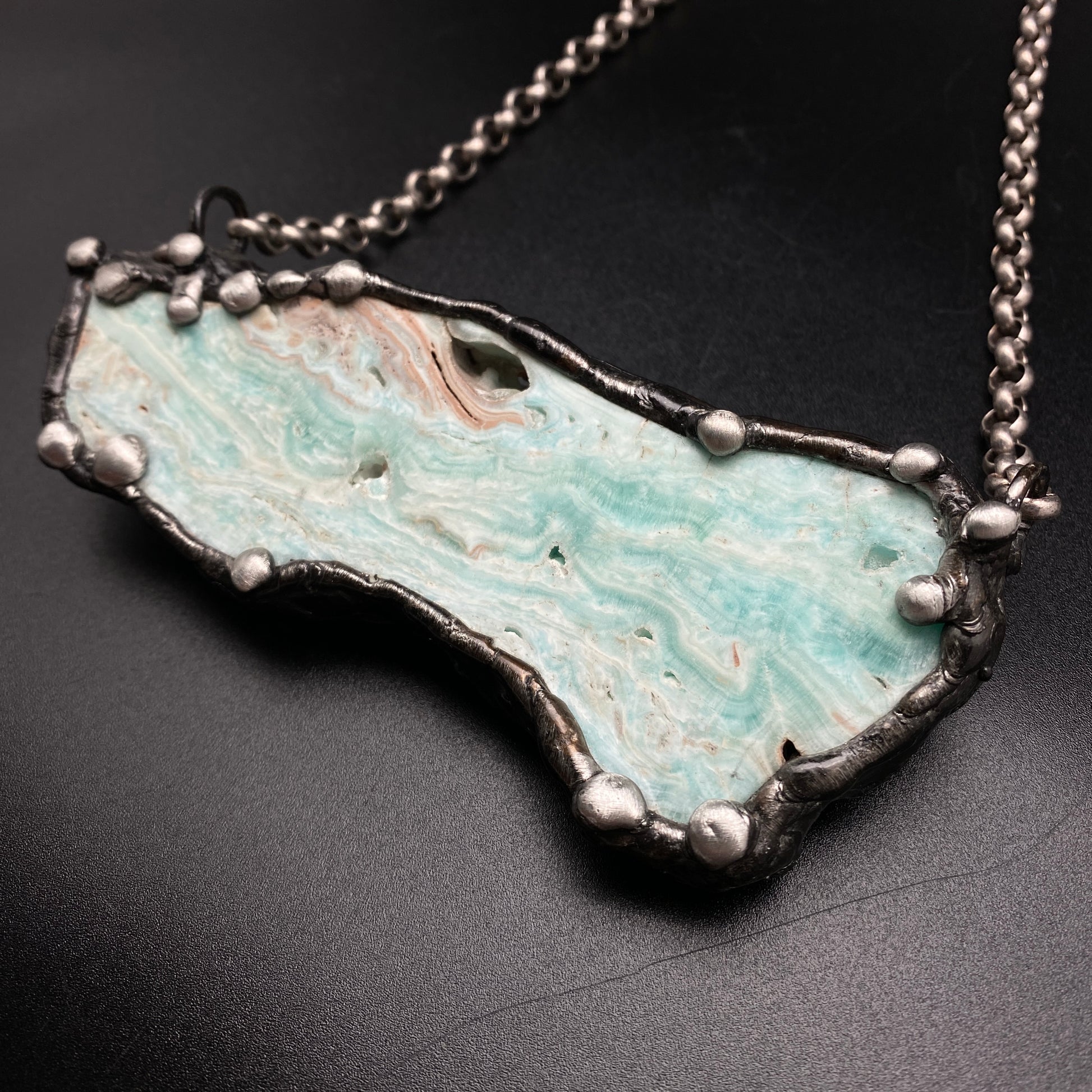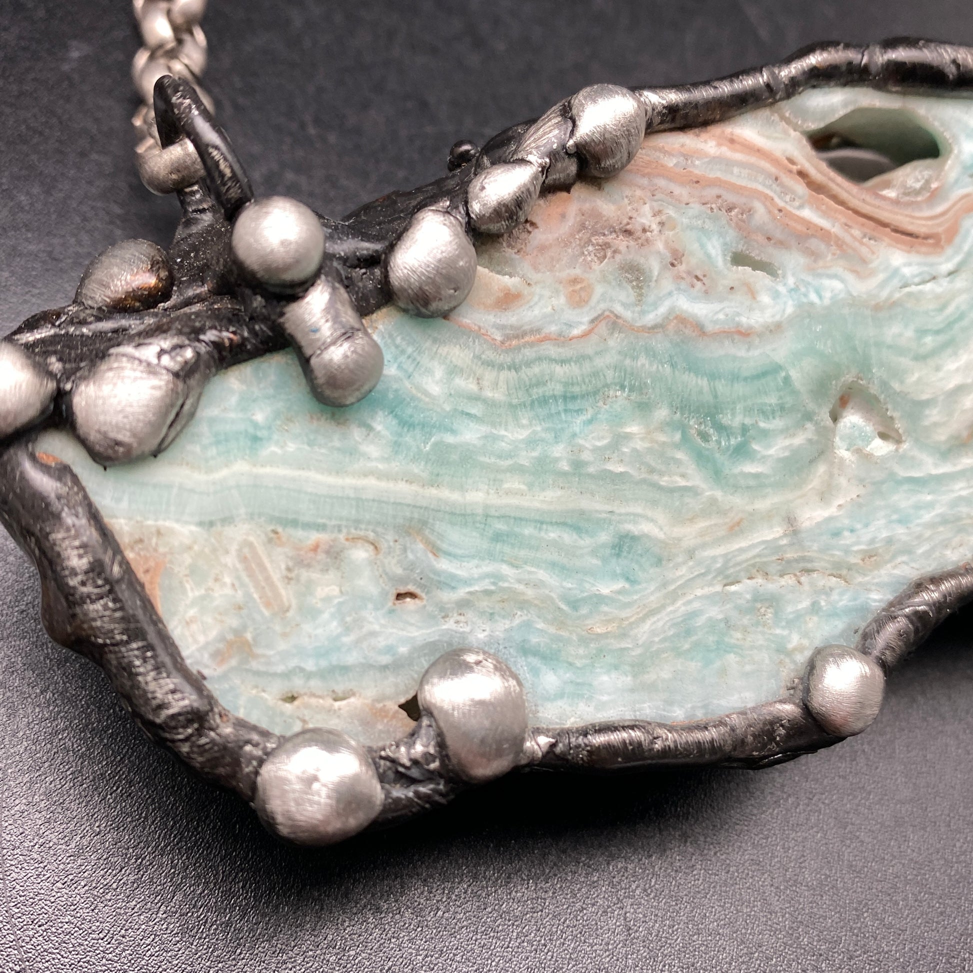 Beautiful ocean blue aragonite crystal, soldered and oxidized with my signature technique. Photos show both sides, sturdy antiqued silver plated rolo chain. Stone is about 5" wide