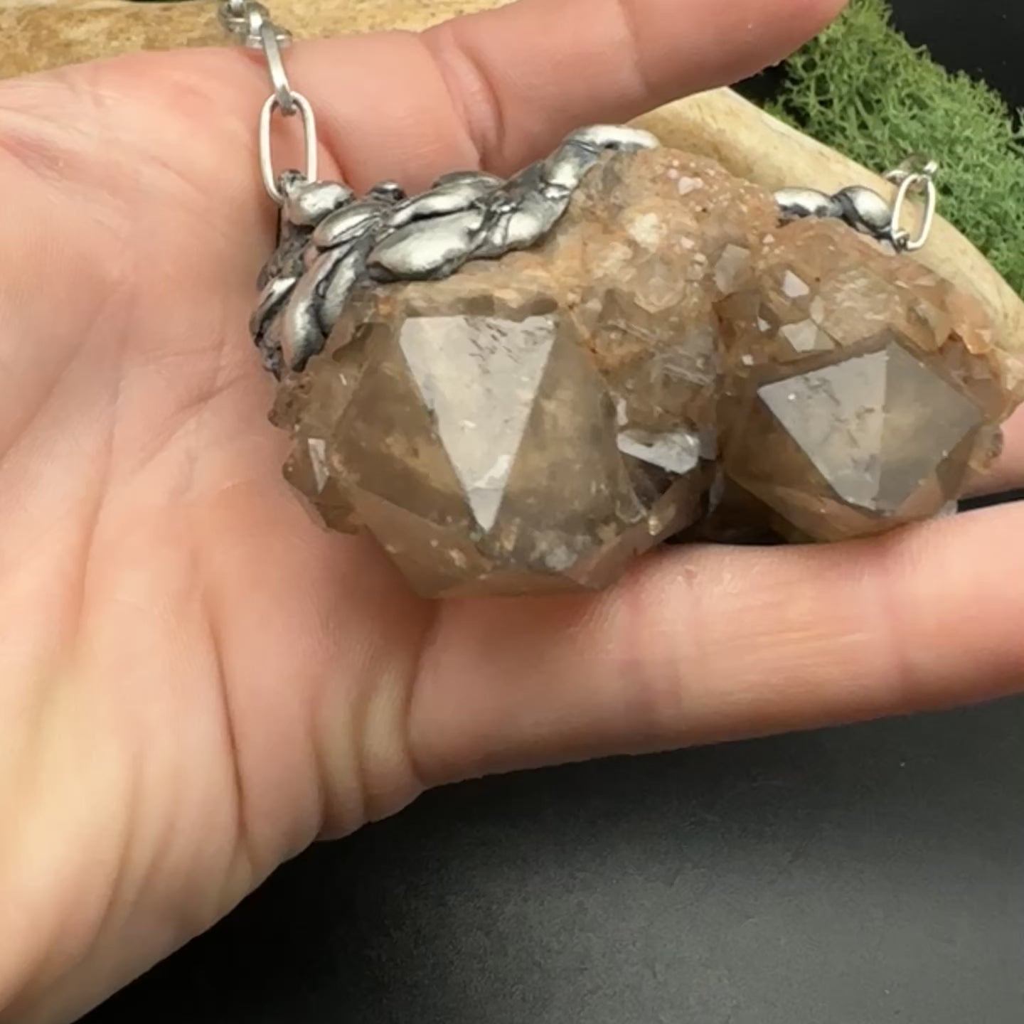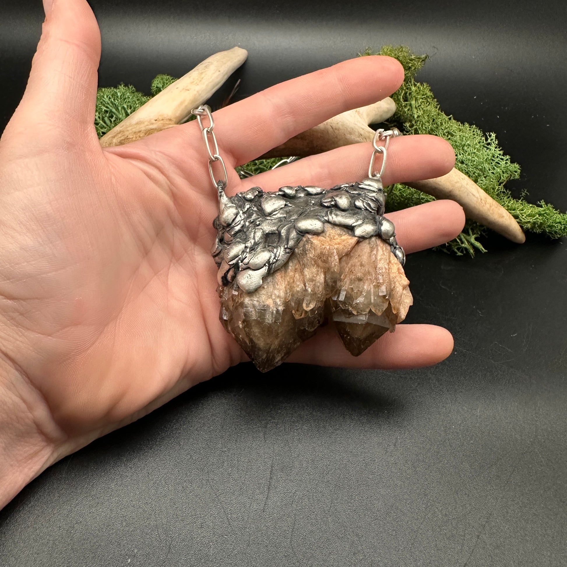 Raw, untamed, and unapologetically bold. This heavy double cluster of kundalini smoky citrine from The Republic of Congo juts out like a crystalline relic from the depths of the earth. Soldered in my signature organic molten metal texture, this one-of-a-kind pendant dares you to lean into your power. The stone flashes soft rainbows in the light, a hidden secret just for you.