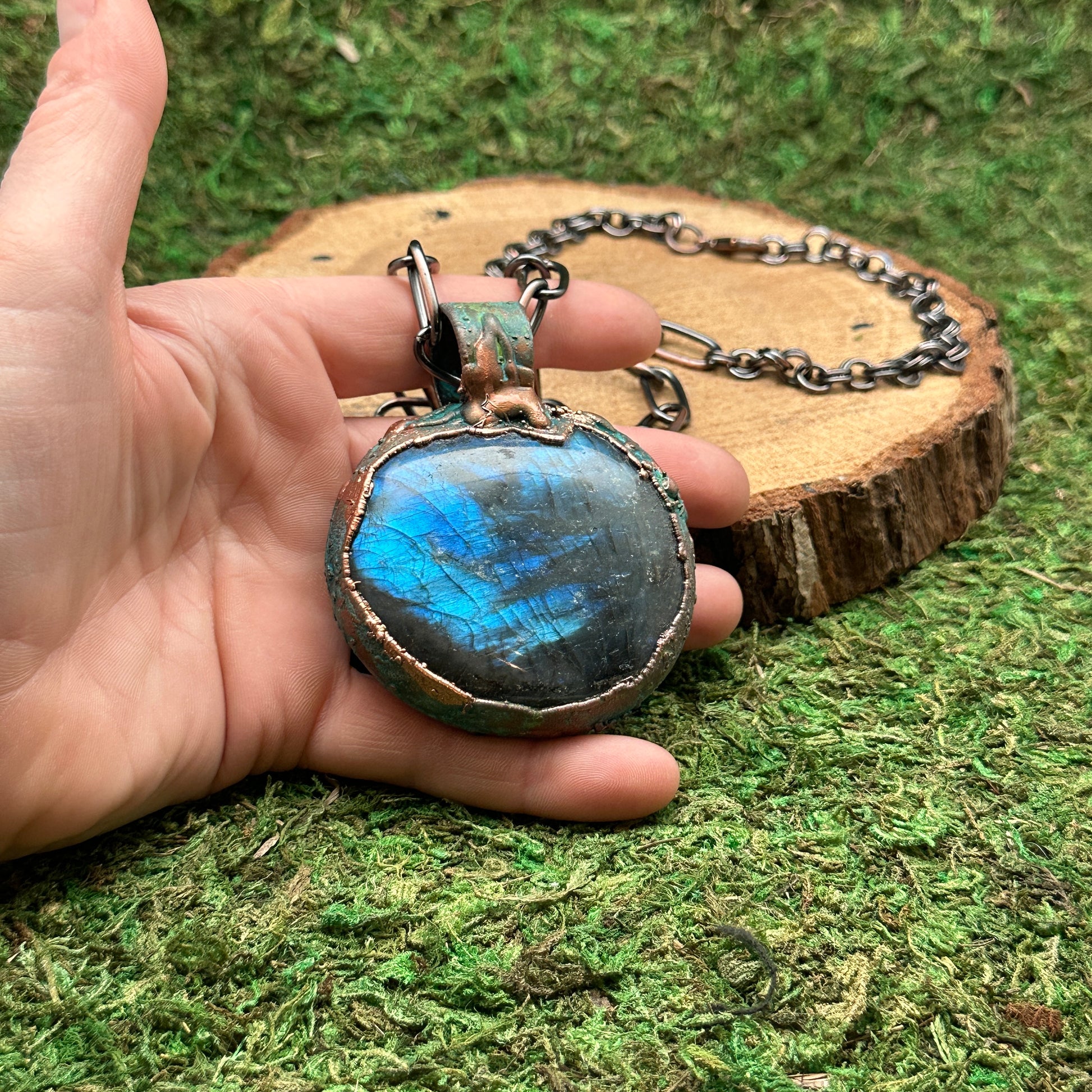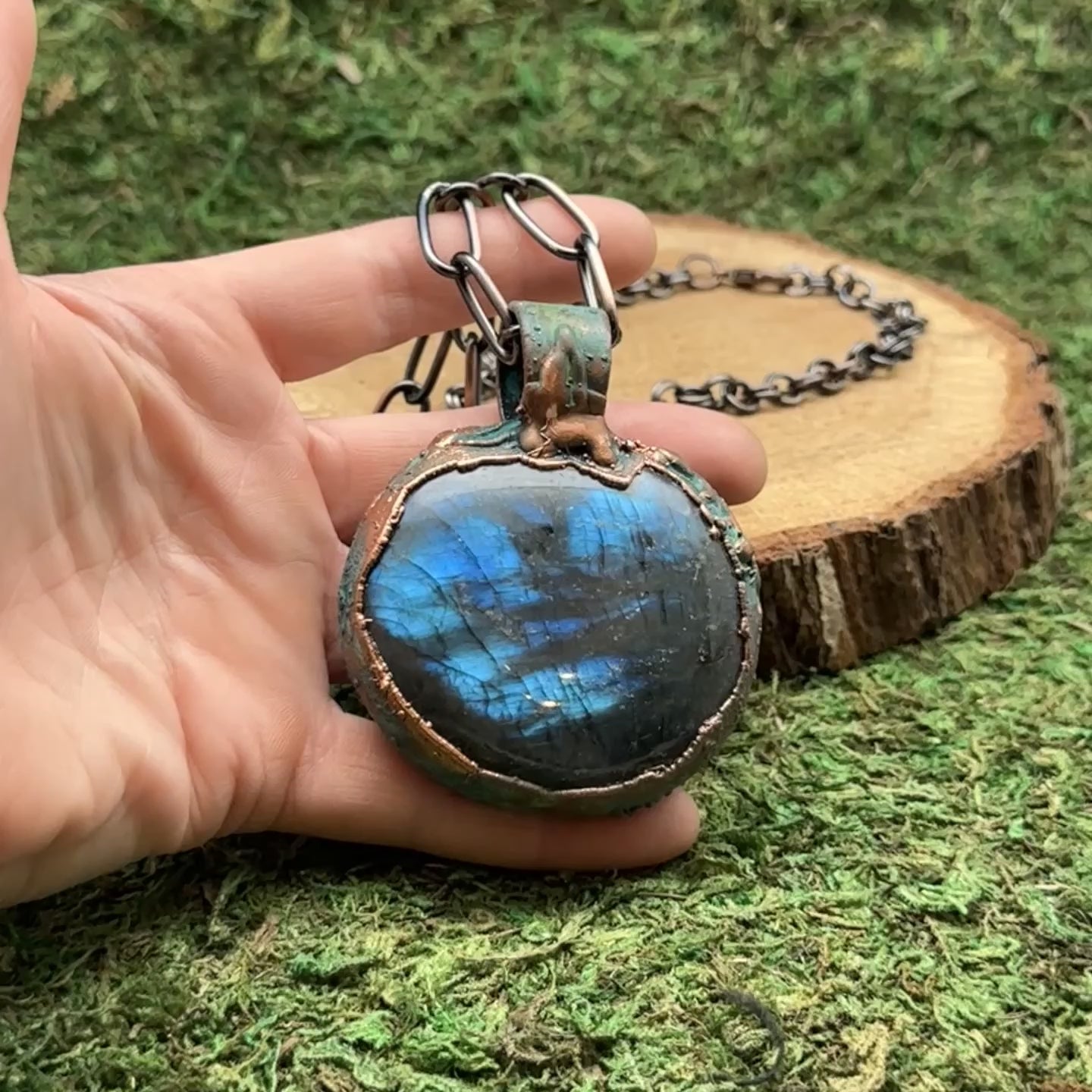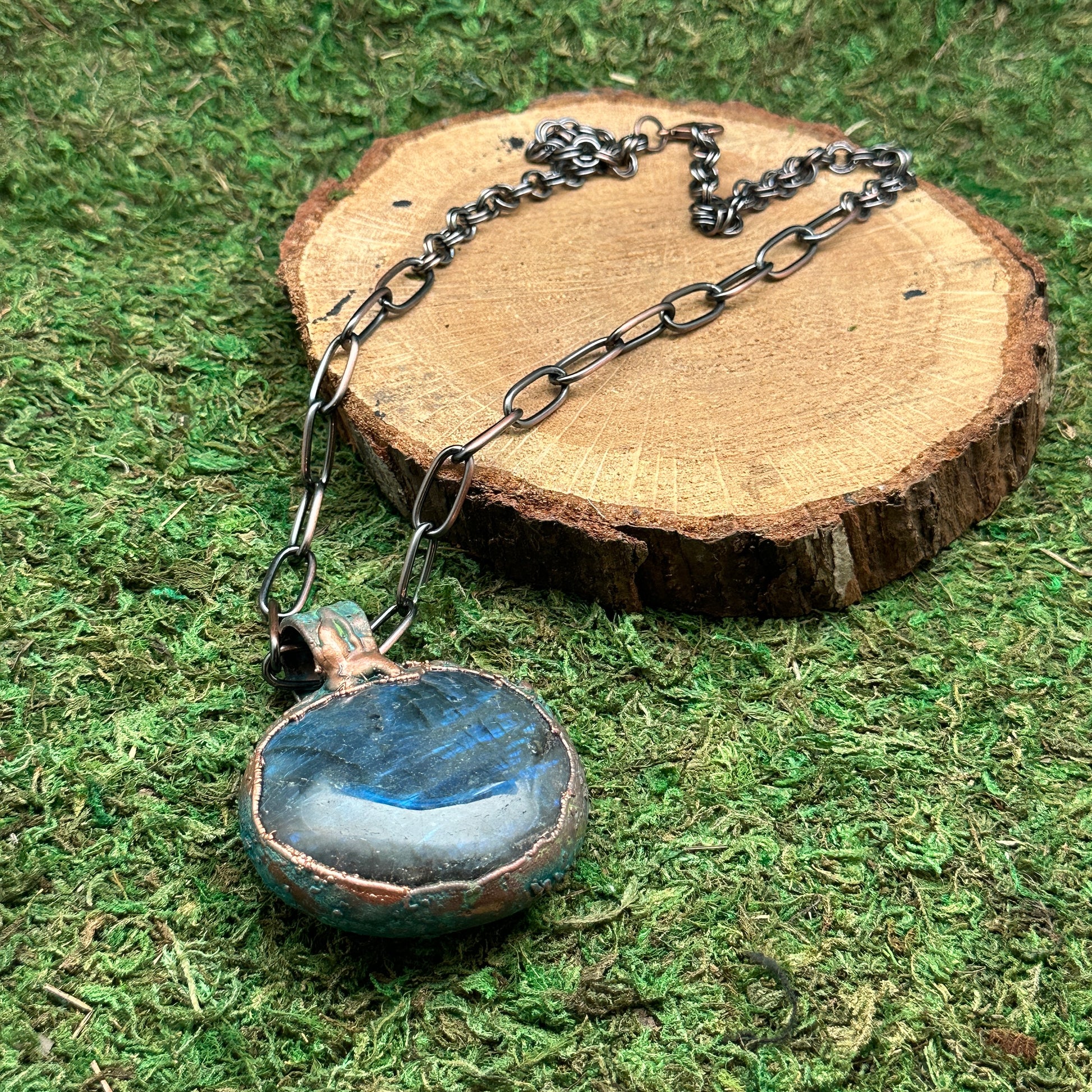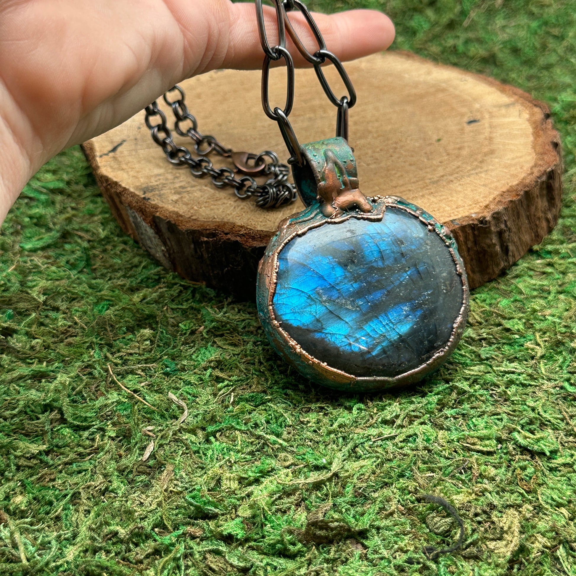Flashy blue Labradorite orb, electroformed with a bezel of textured copper. Stone is open on both sides.