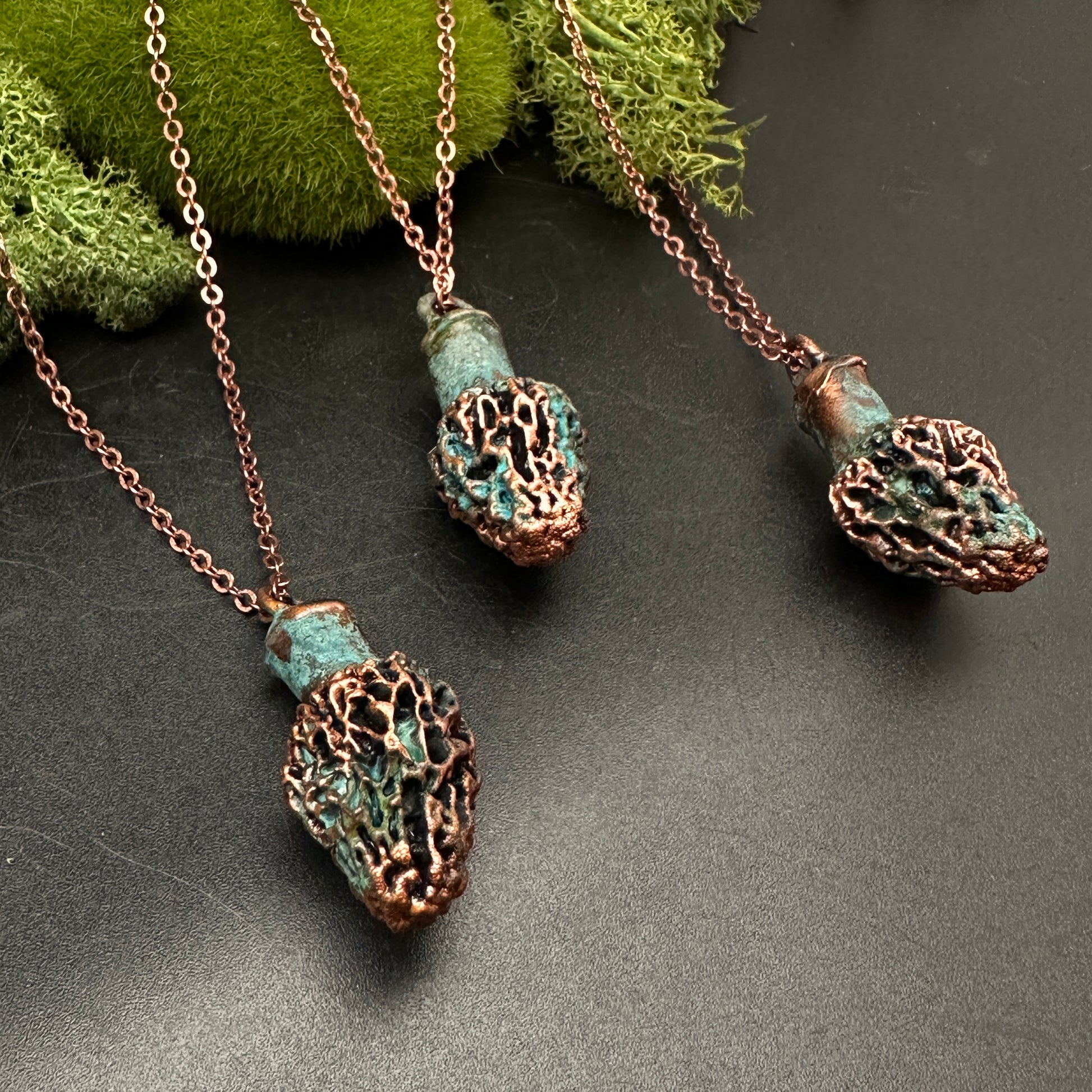 Copper morel mushrooms, electroformed, oxidized, and polished. Delicate but sturdy copper chain. Chain length 18-20". Each pendant will vary slightly. Pictured here are a few examples.