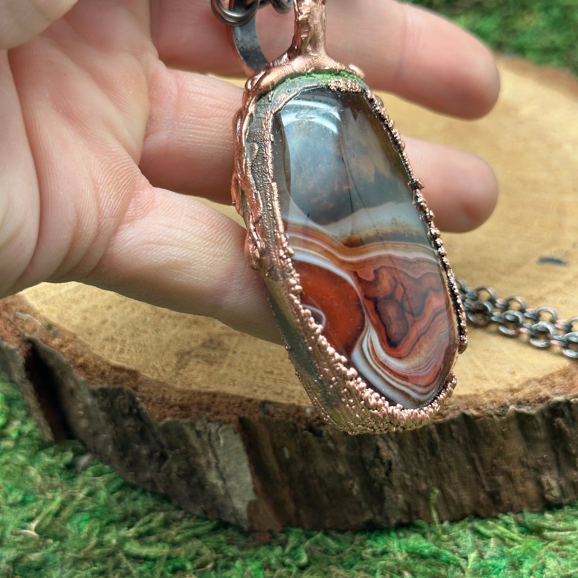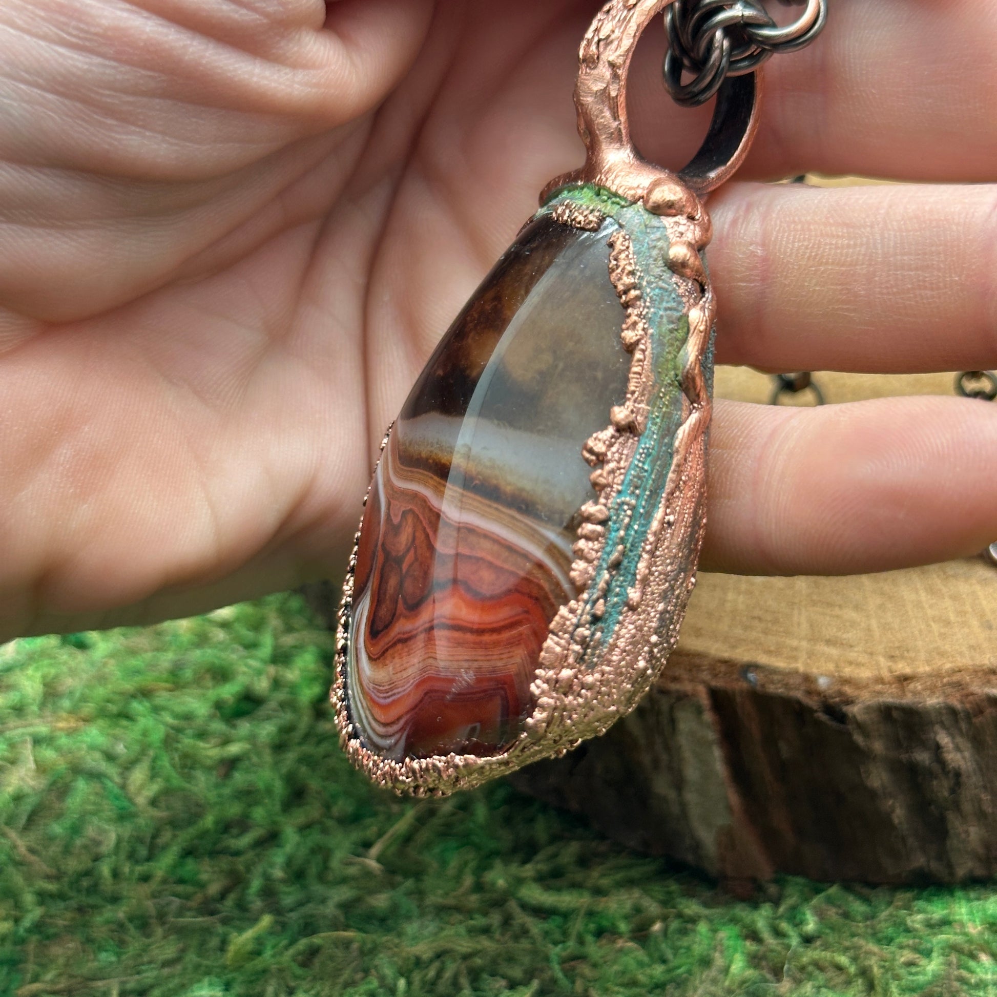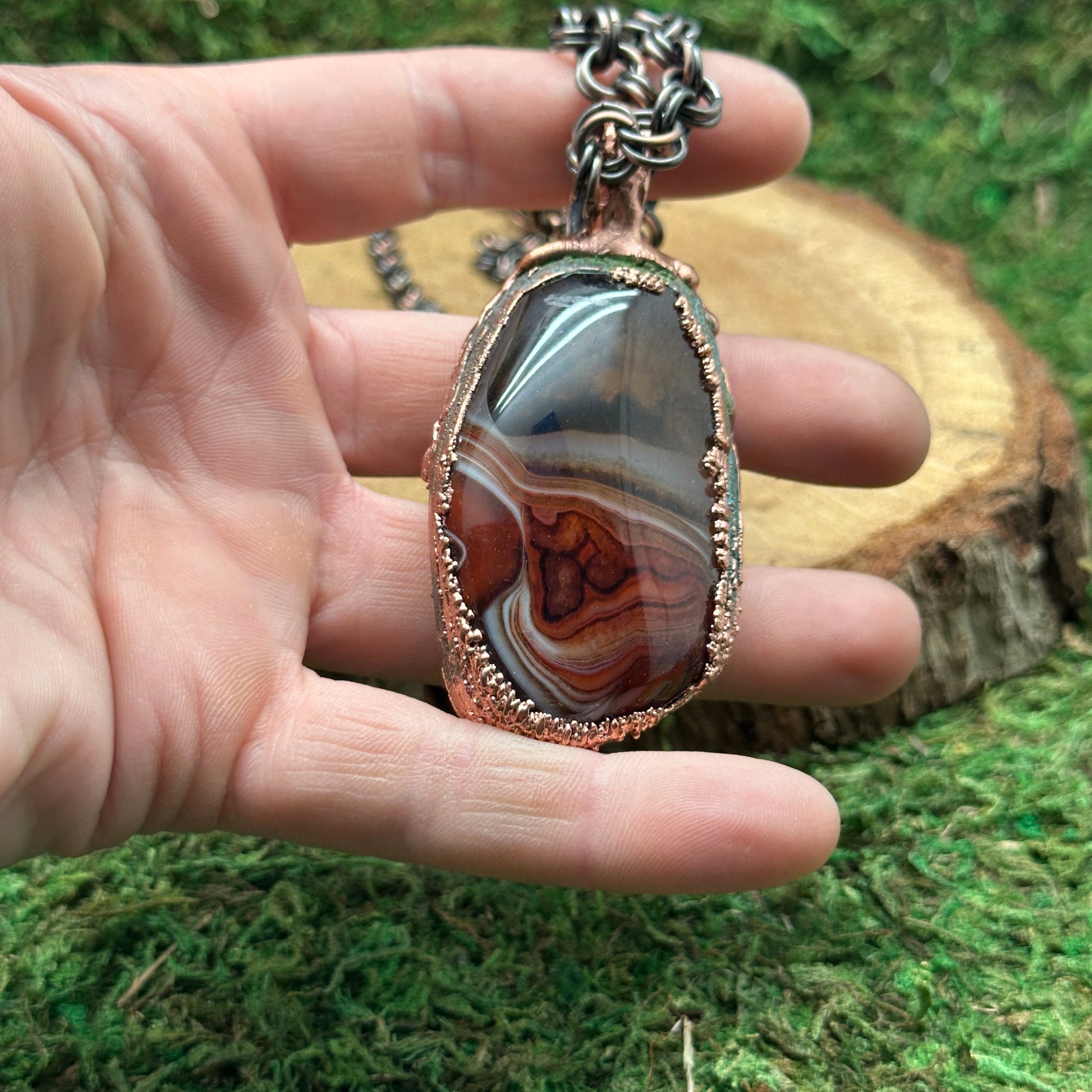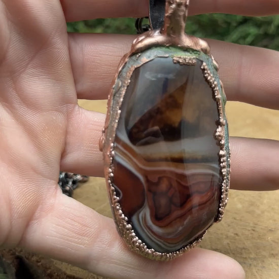 Sardonyx set in textured electroformed copper. This stone has incredible varied patterns and color swirls. It's wild. Check the photos for both sides of the stones. Wear either way for two different looks.