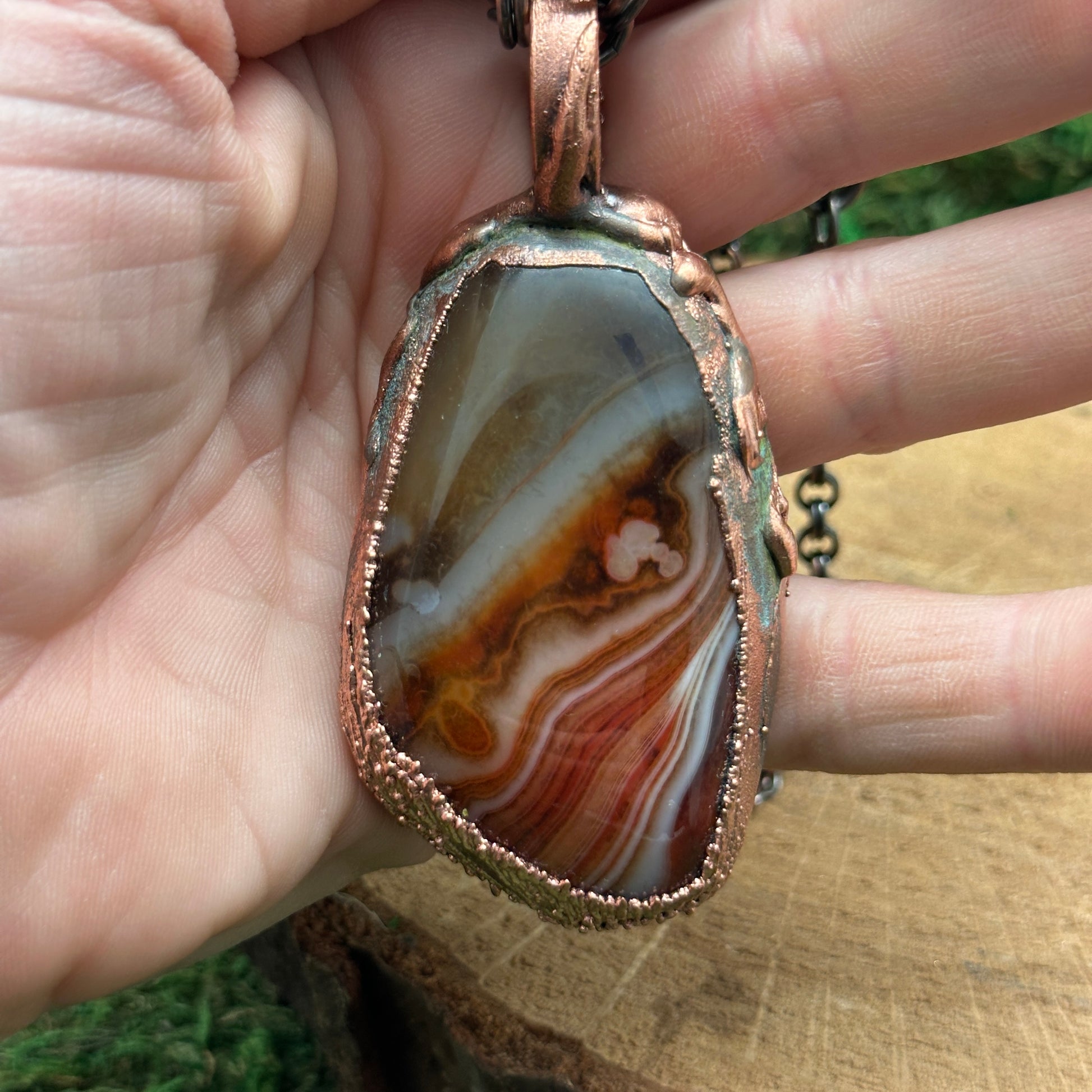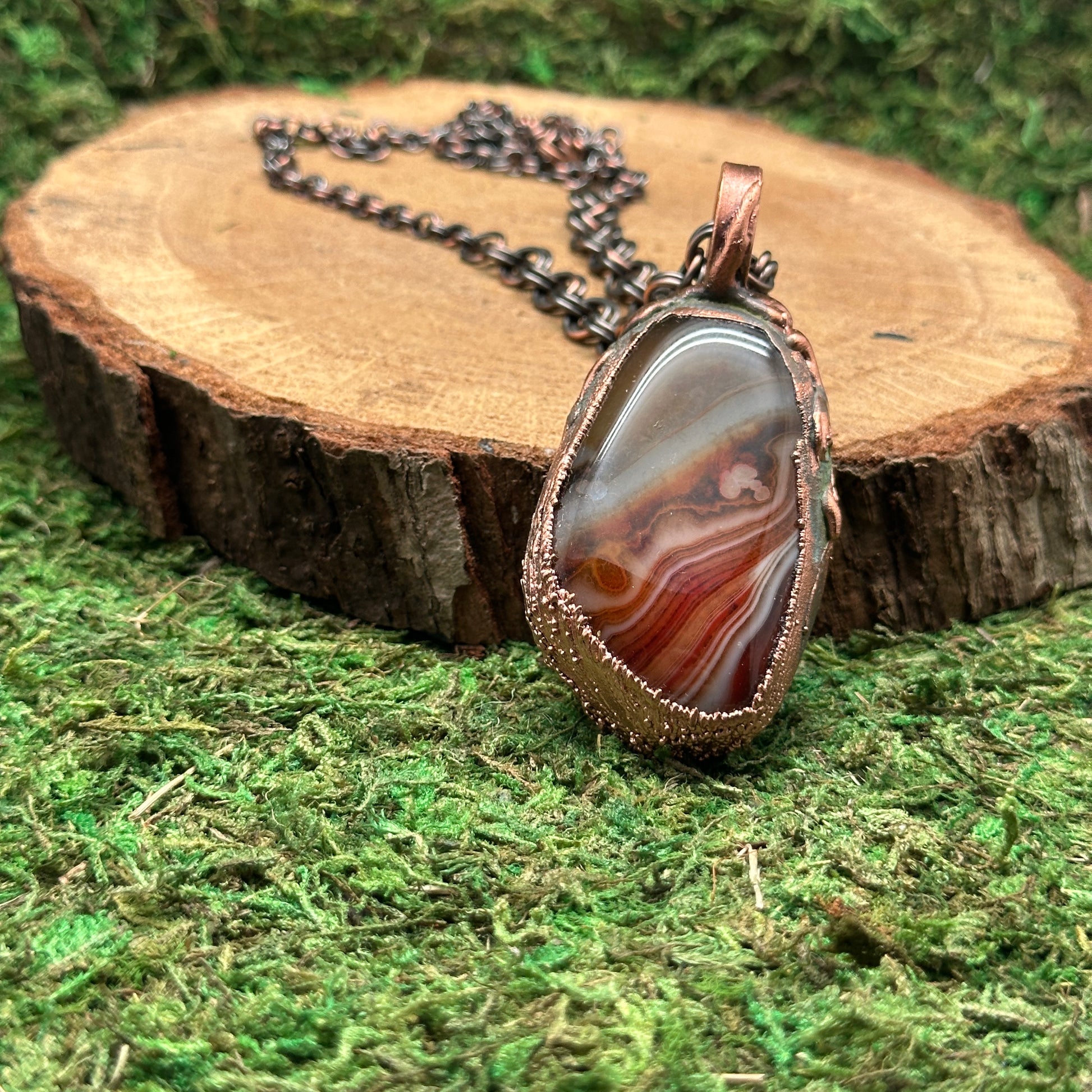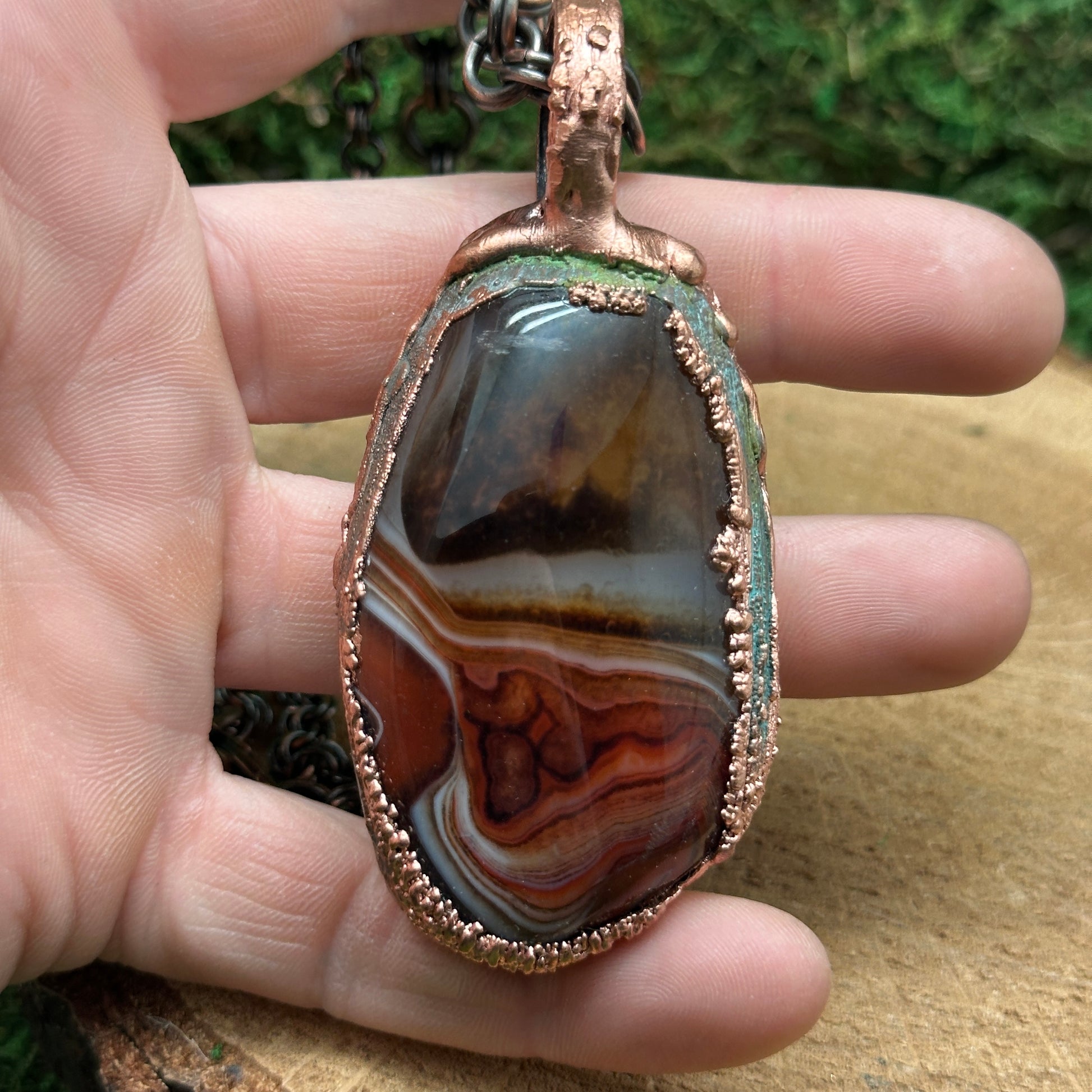 Sardonyx set in textured electroformed copper. This stone has incredible varied patterns and color swirls. It's wild. Check the photos for both sides of the stones. Wear either way for two different looks.