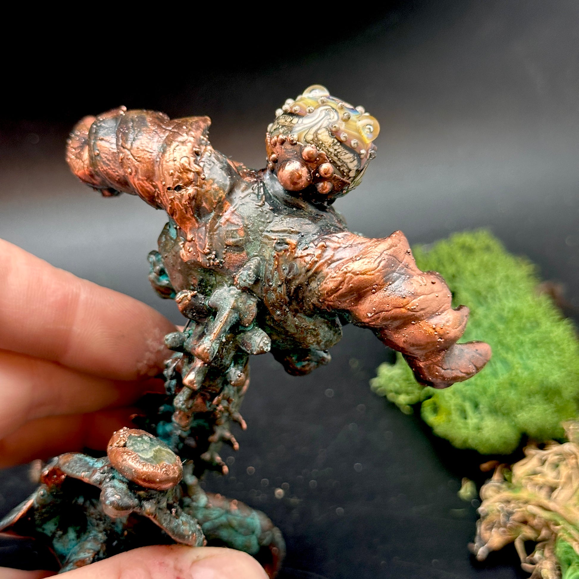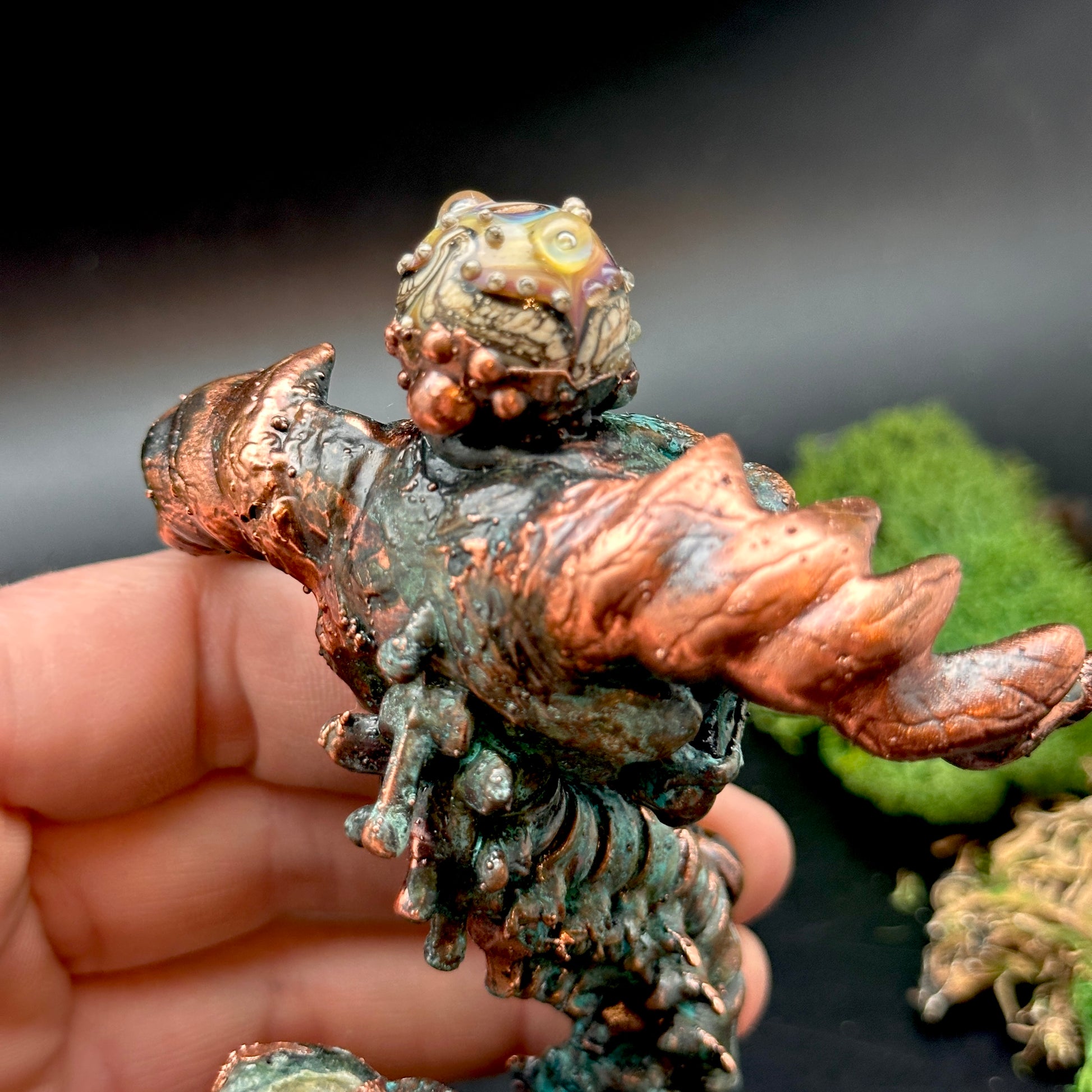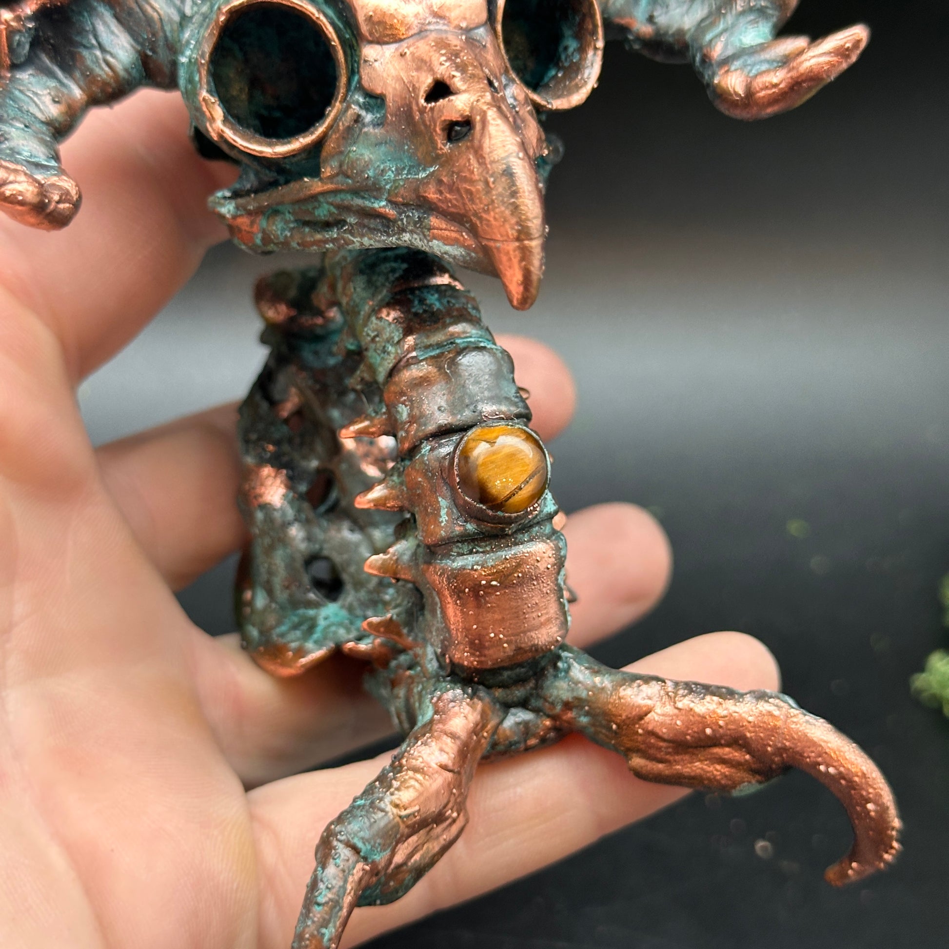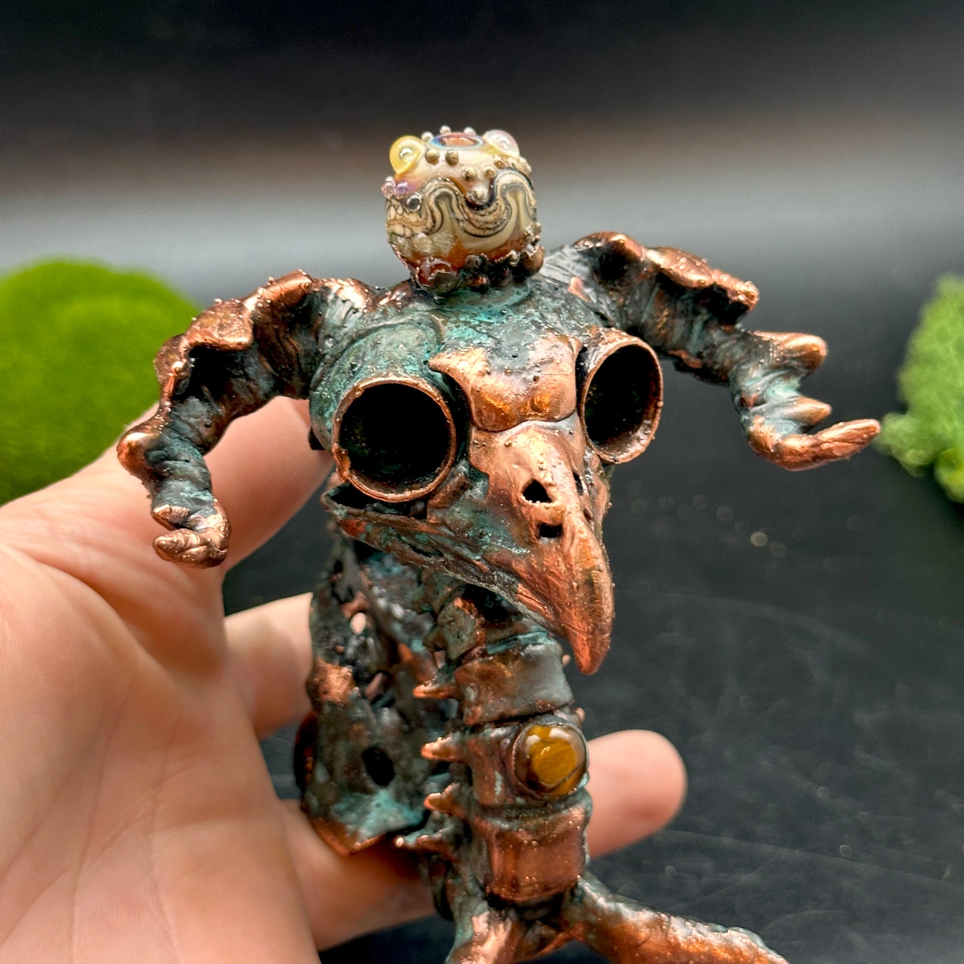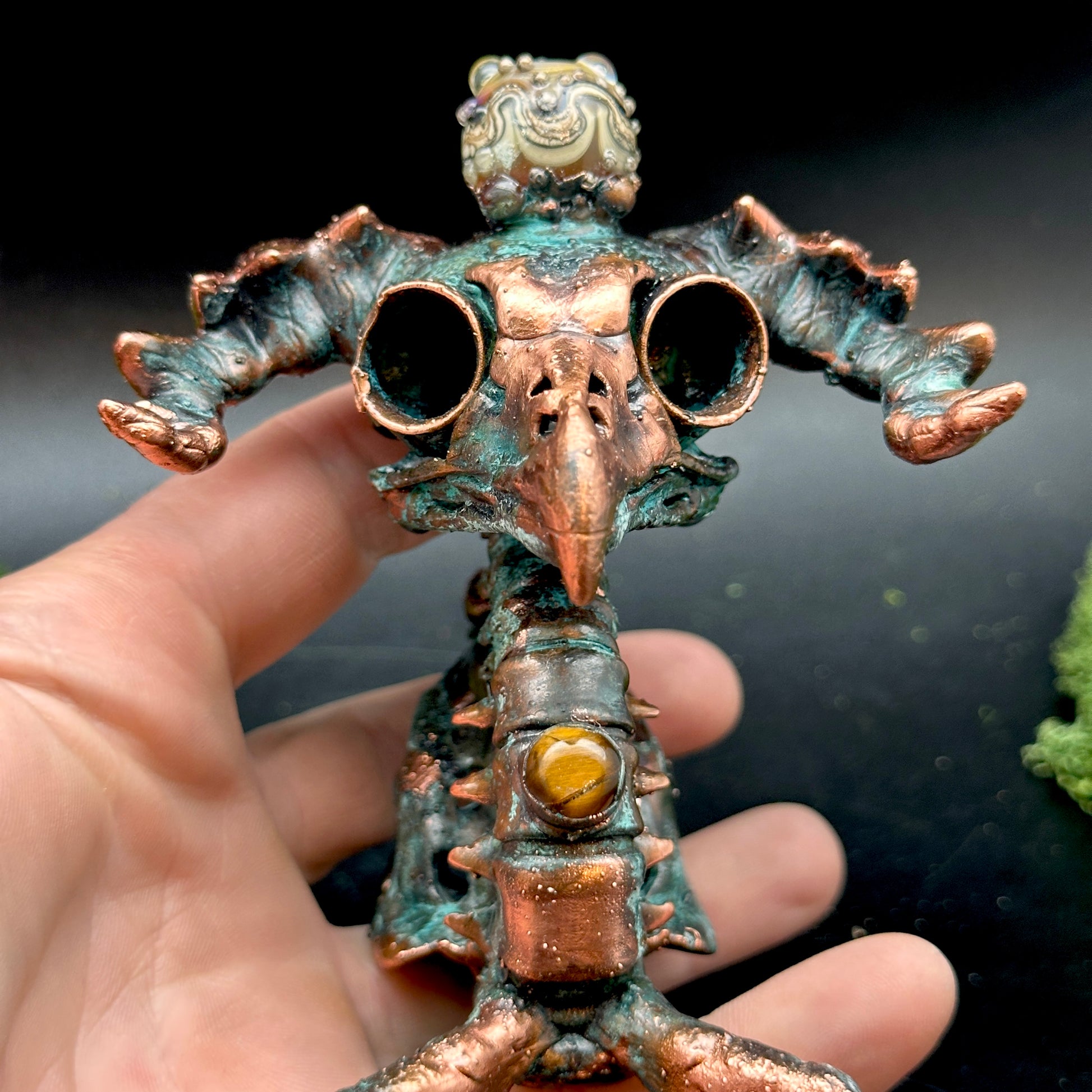 Meet ThistleMol, a sweet horned owl-hybrid. This badass copper and verdigris creature just crawled out of the Verge. With a bard owl skull, a handmade glass crown, green jasper tail, and gnarly horns, it’s got a sweet but weird vibe. Rough, raw, and totally unique—this piece is for those who live outside the lines and embrace the strange. Approximately 5" tall.