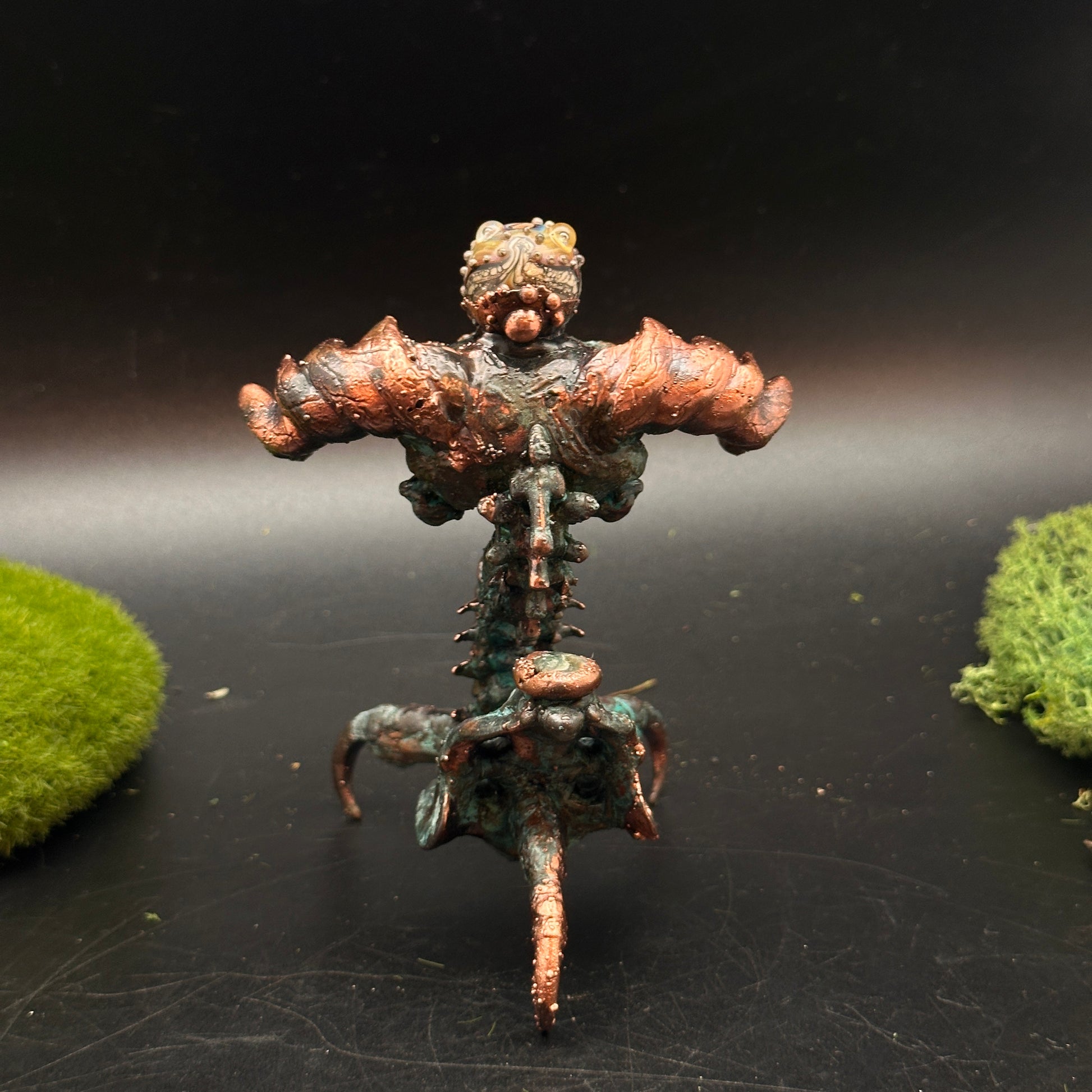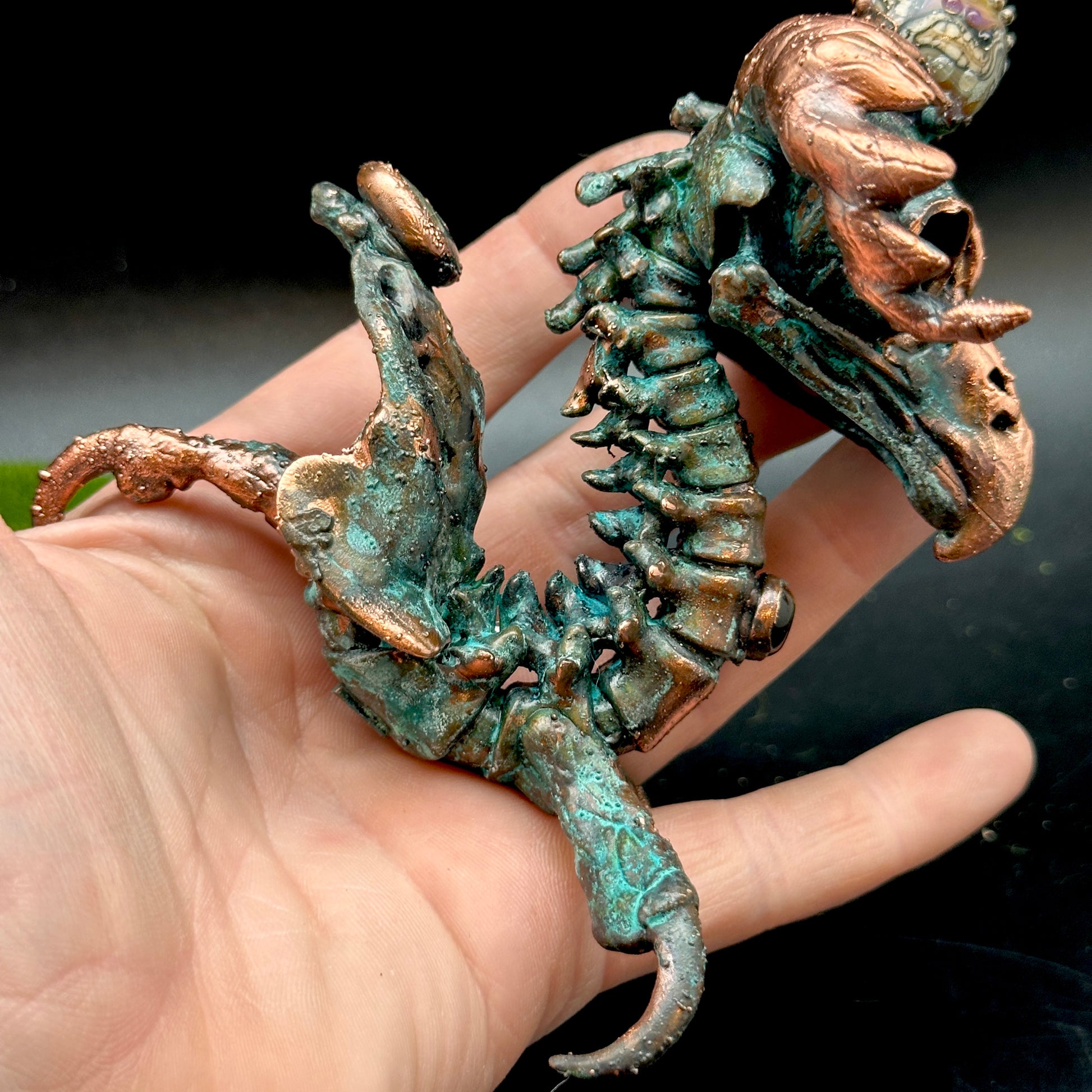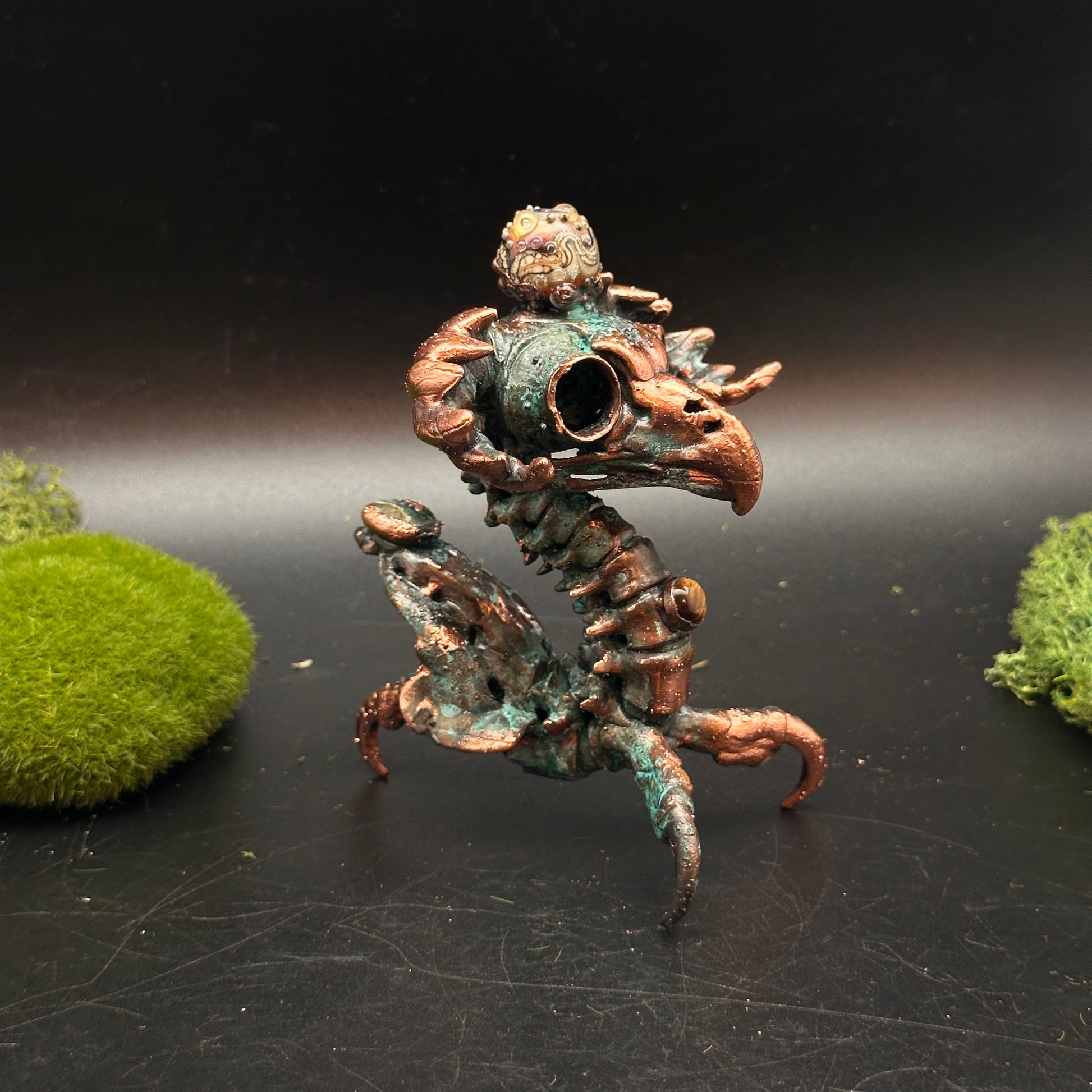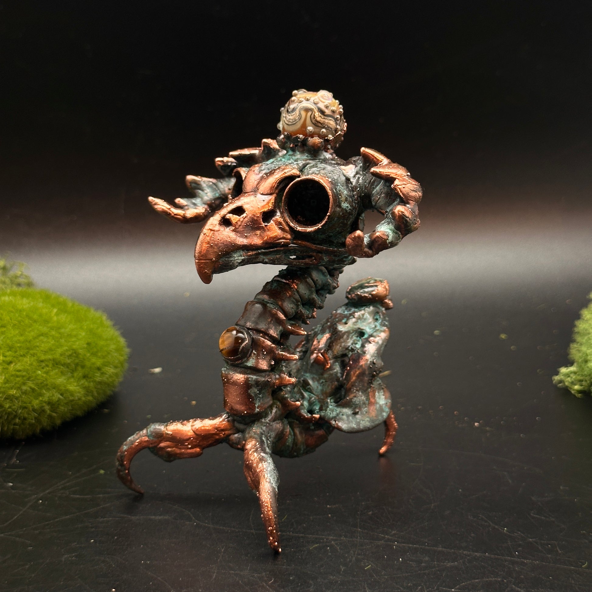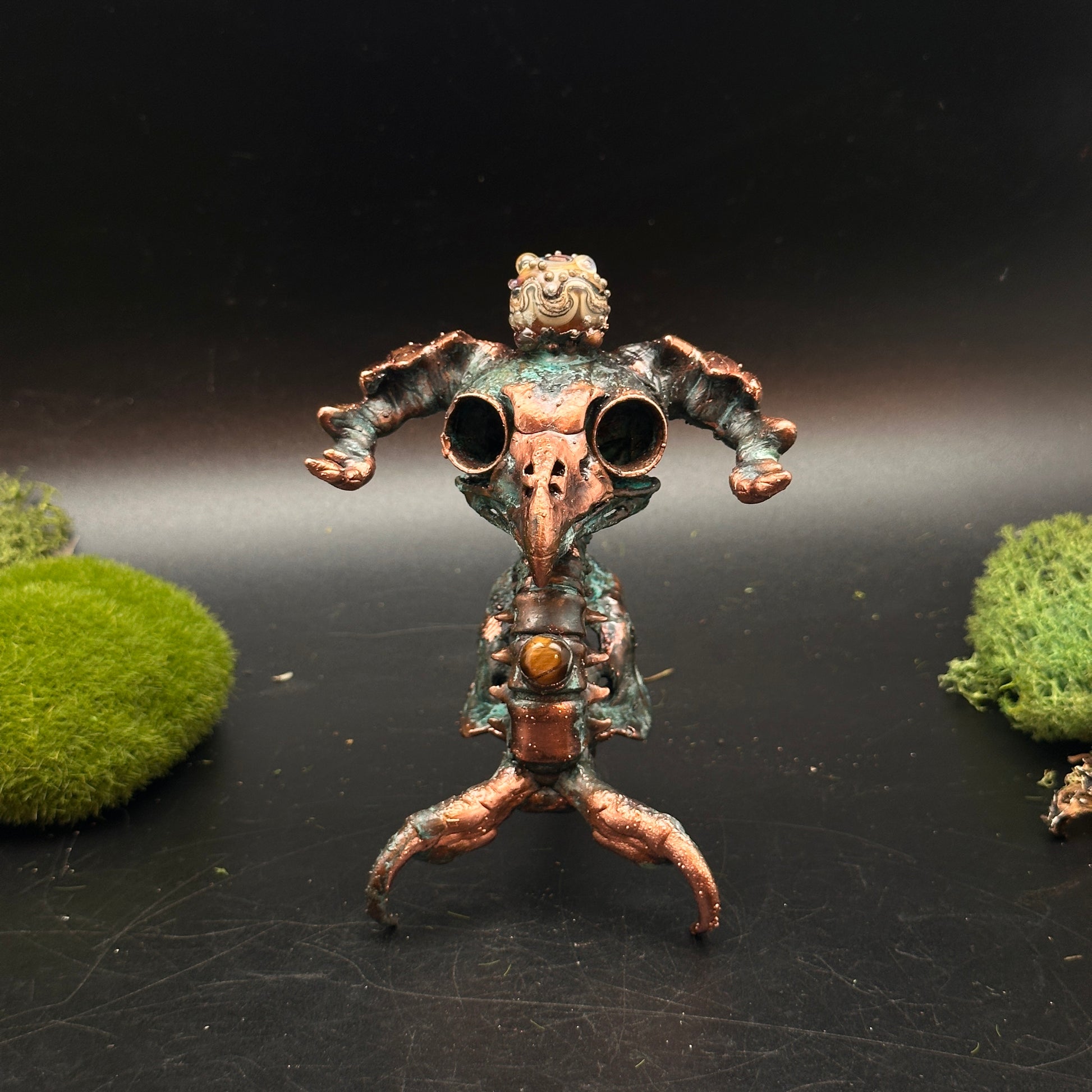 Meet ThistleMol, a sweet horned owl-hybrid. This badass copper and verdigris creature just crawled out of the Verge. With a bard owl skull, a handmade glass crown, green jasper tail, and gnarly horns, it’s got a sweet but weird vibe. Rough, raw, and totally unique—this piece is for those who live outside the lines and embrace the strange. Approximately 5" tall.