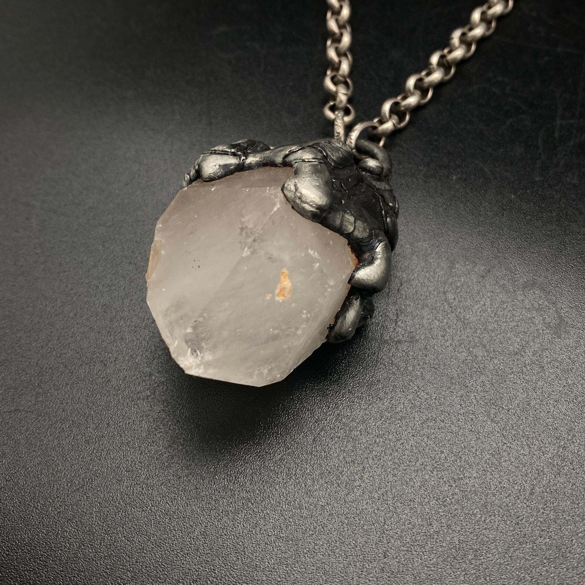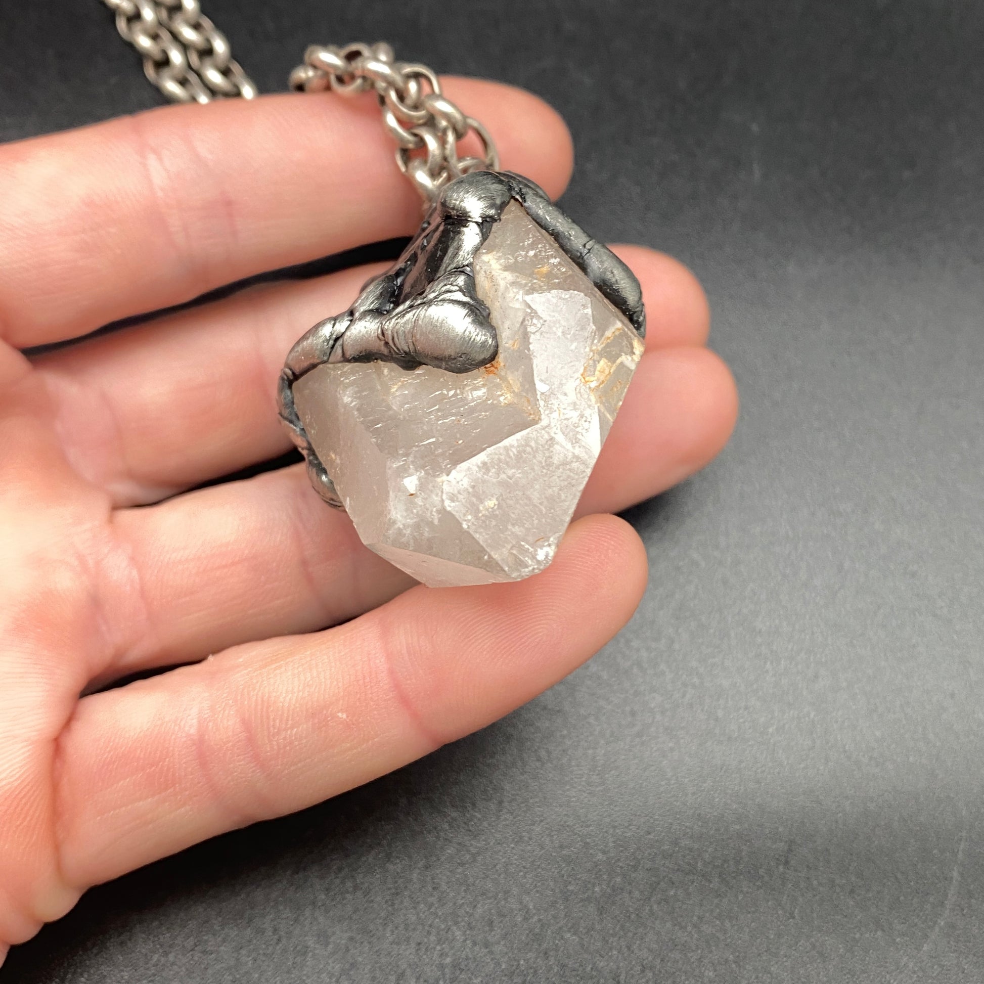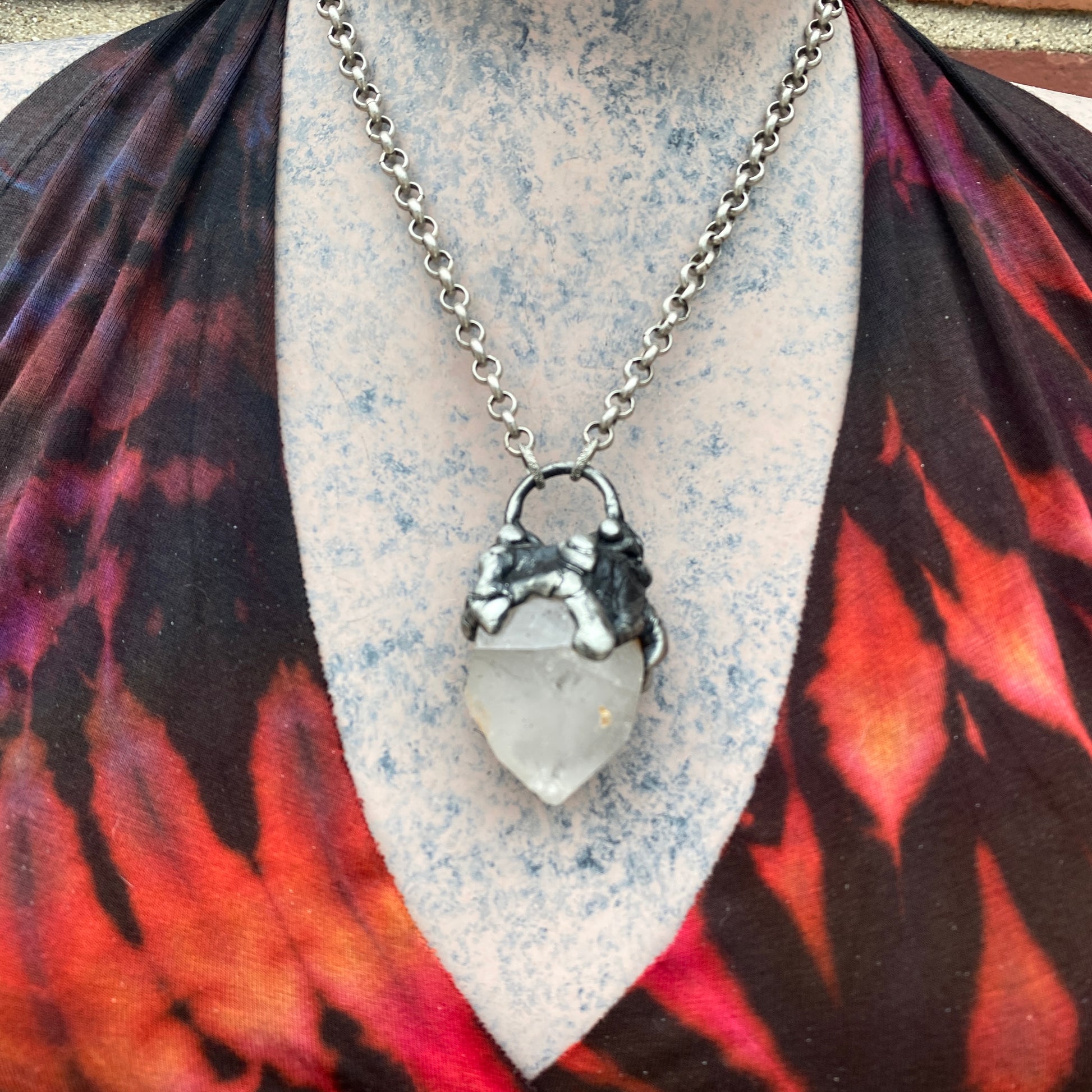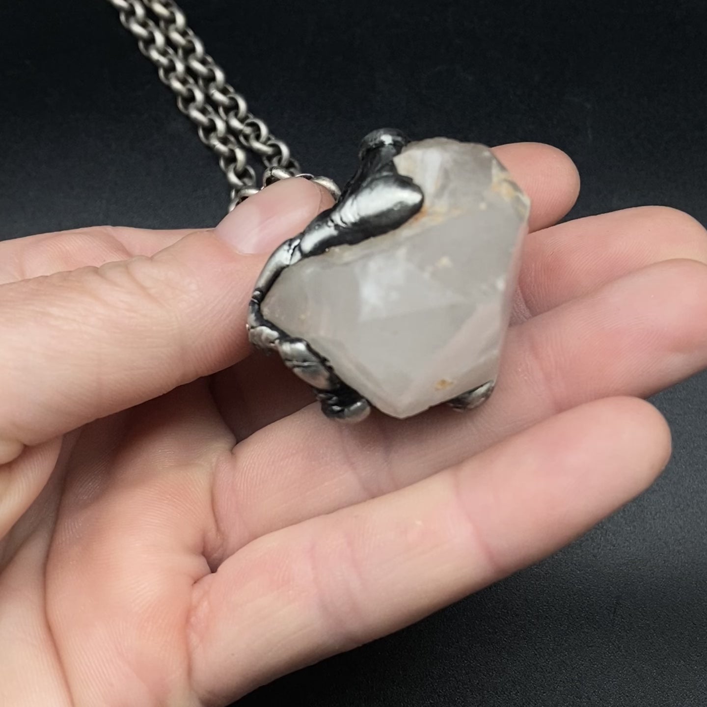 A beautiful milky Quartz point we mined ourselves in Arkansas, soldered and oxidized with my signature technique. On heavy gauge silver plated chain. One of a kind.