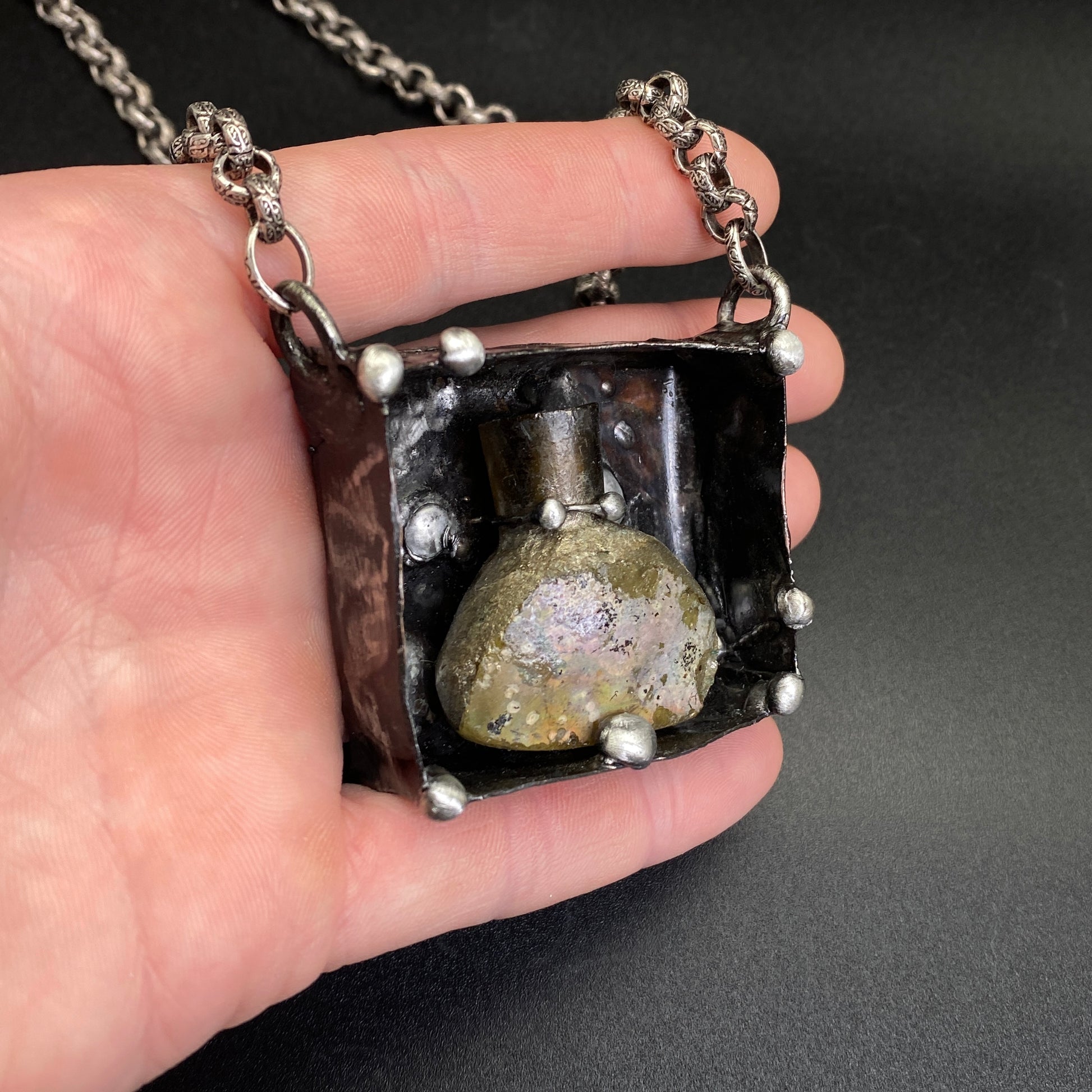 2000 year old tiny Roman glass bottle in a rustic copper box, soldered with my signature technique, oxidized and polished. On silver plated rolo chain. Choose your chain length. This is the first of a series in the works.